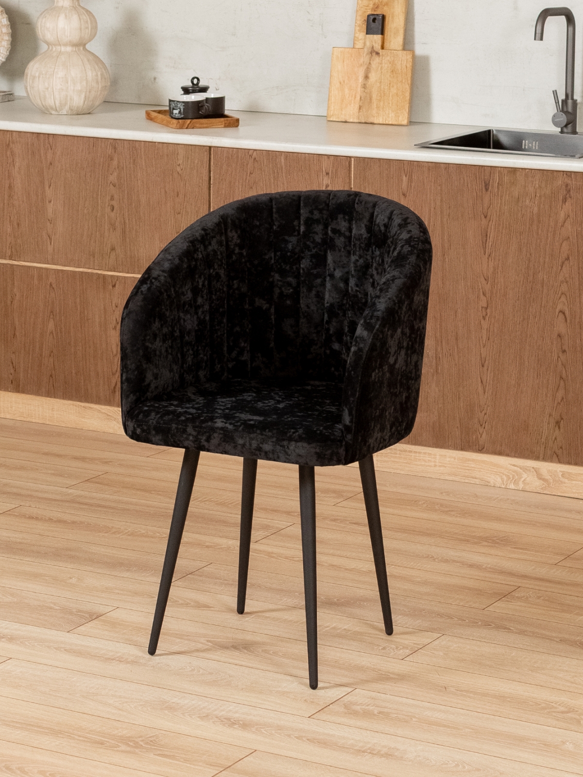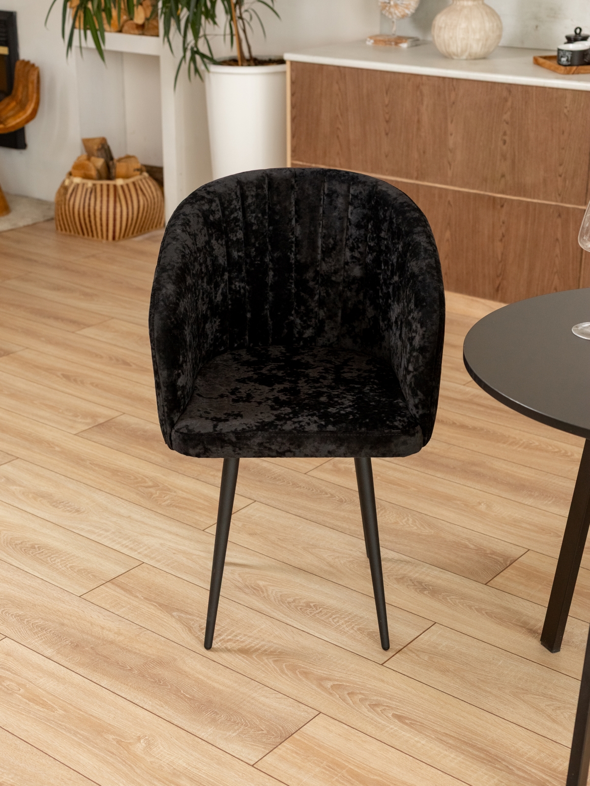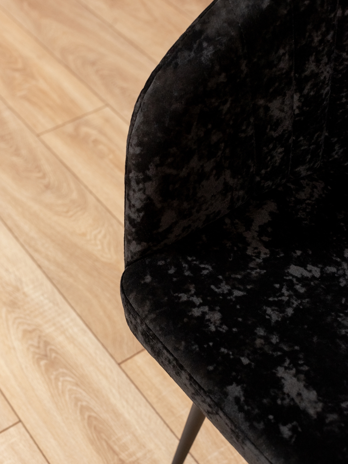 Дизайнерский мягкий стул Карибу станет стильным акцентом на кухне, в обеденной зоне или гостиной. Кресло с мягким сидением и спинкой, плавно переходящей в подлокотники, выполнено в современном стиле лофт. Отлично сочетается с темными акцентами в интерьере: фурнитурой кухонного гарнитура, бытовой техникой, светильниками и спотами. Черные матовые металлические ножки обеспечивают устойчивость и долговечность. Мягкая часть выполнена из бархатистого велюра с краш-эффектом в элегантной цветовой гамме. Есть такая же модель стульев, но в обивке из экокожи. Благодаря глубокой посадке и плавным линиям полукресло дарит ощущение уюта, что делает его идеальным для длительного отдыха. Декоративная вертикальная прострочка на внутренней части спинки подчеркивает изысканный внешний вид и добавляет современности.