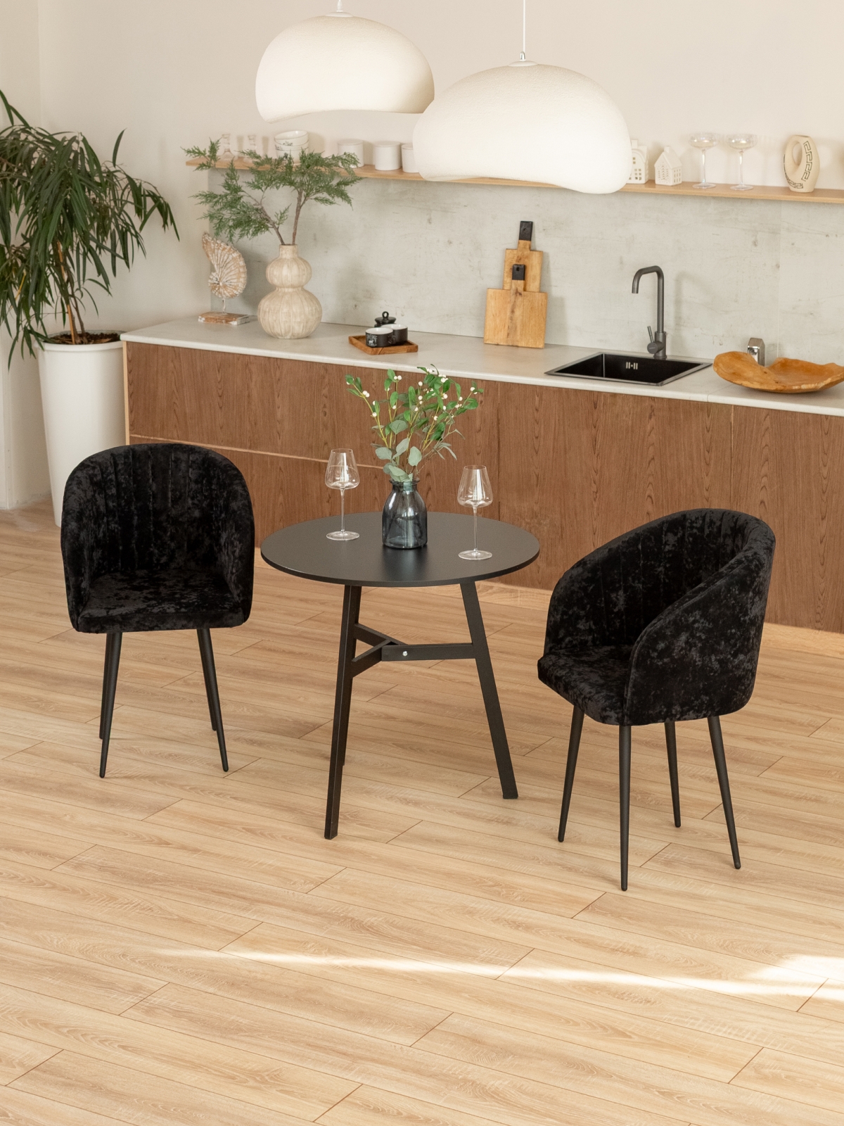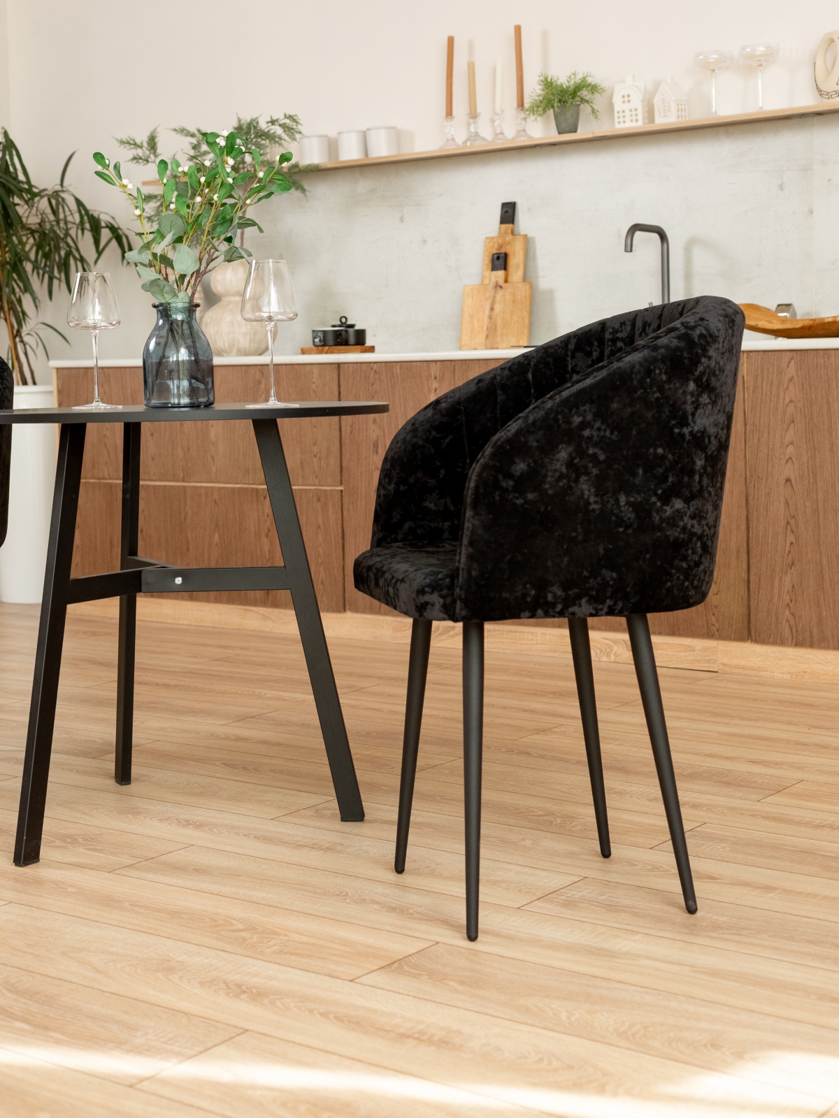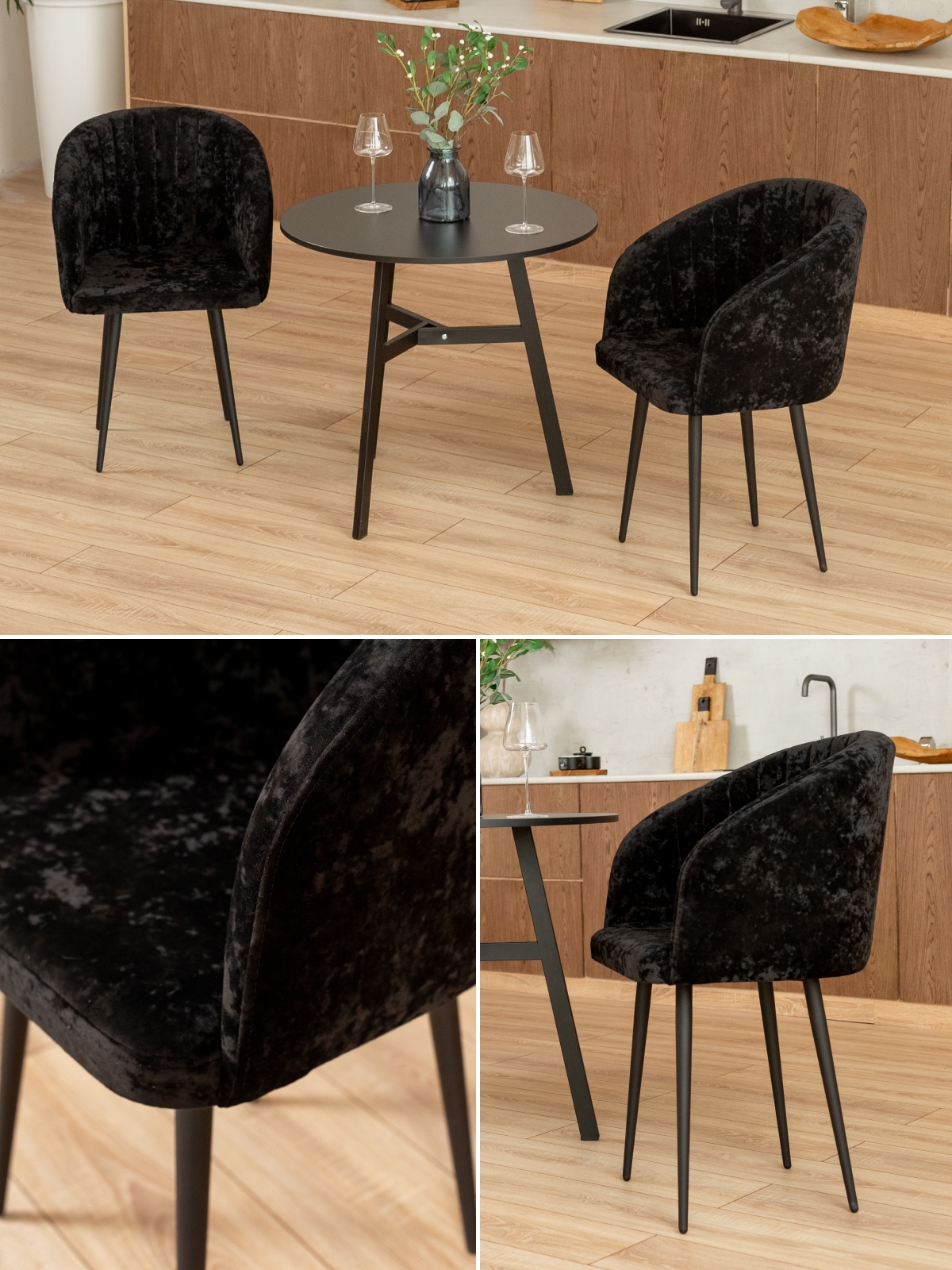 Дизайнерский мягкий стул Карибу станет стильным акцентом на кухне, в обеденной зоне или гостиной. Кресло с мягким сидением и спинкой, плавно переходящей в подлокотники, выполнено в современном стиле лофт. Отлично сочетается с темными акцентами в интерьере: фурнитурой кухонного гарнитура, бытовой техникой, светильниками и спотами. Черные матовые металлические ножки обеспечивают устойчивость и долговечность. Мягкая часть выполнена из бархатистого велюра с краш-эффектом в элегантной цветовой гамме. Есть такая же модель стульев, но в обивке из экокожи. Благодаря глубокой посадке и плавным линиям полукресло дарит ощущение уюта, что делает его идеальным для длительного отдыха. Декоративная вертикальная прострочка на внутренней части спинки подчеркивает изысканный внешний вид и добавляет современности.