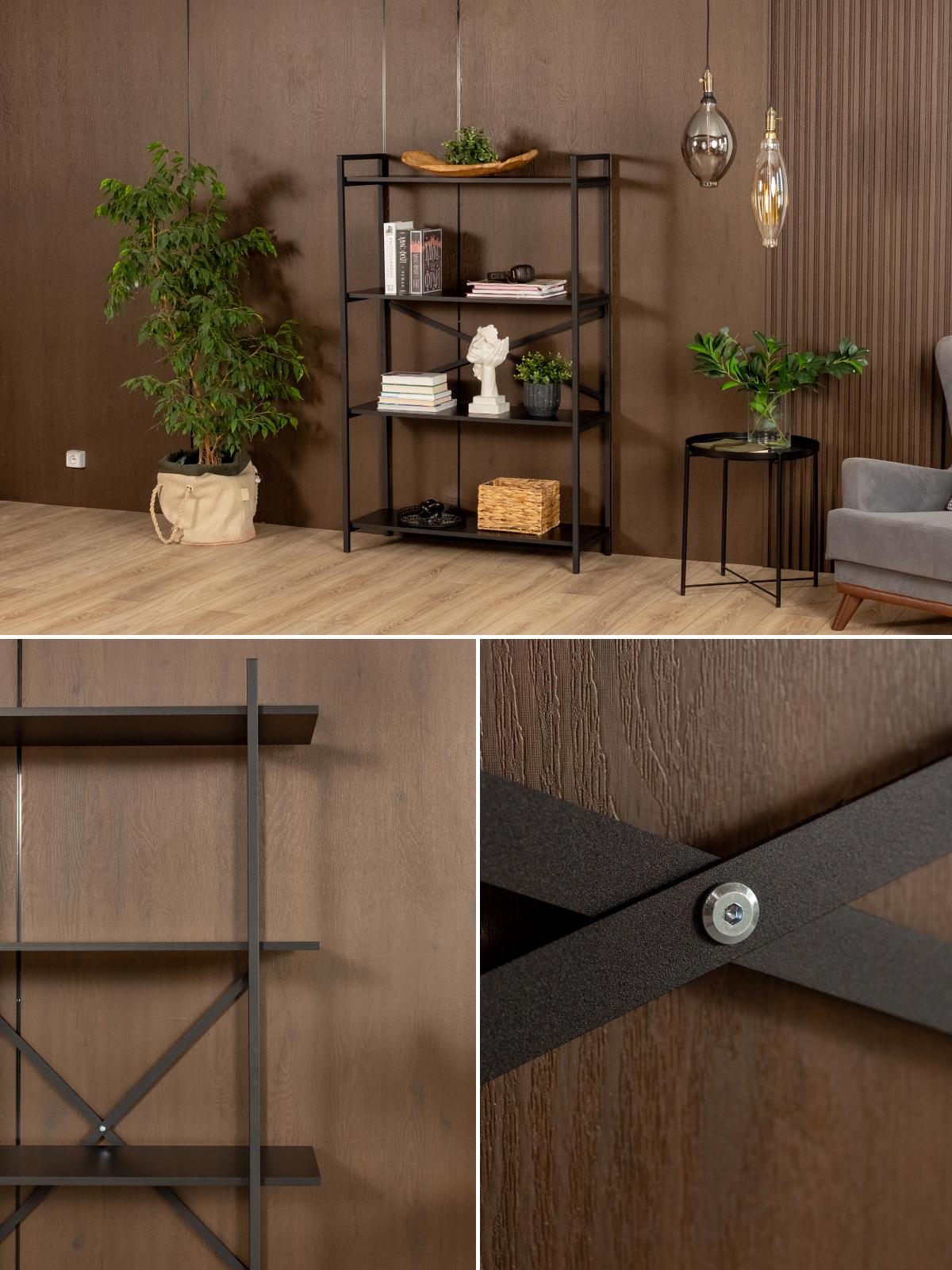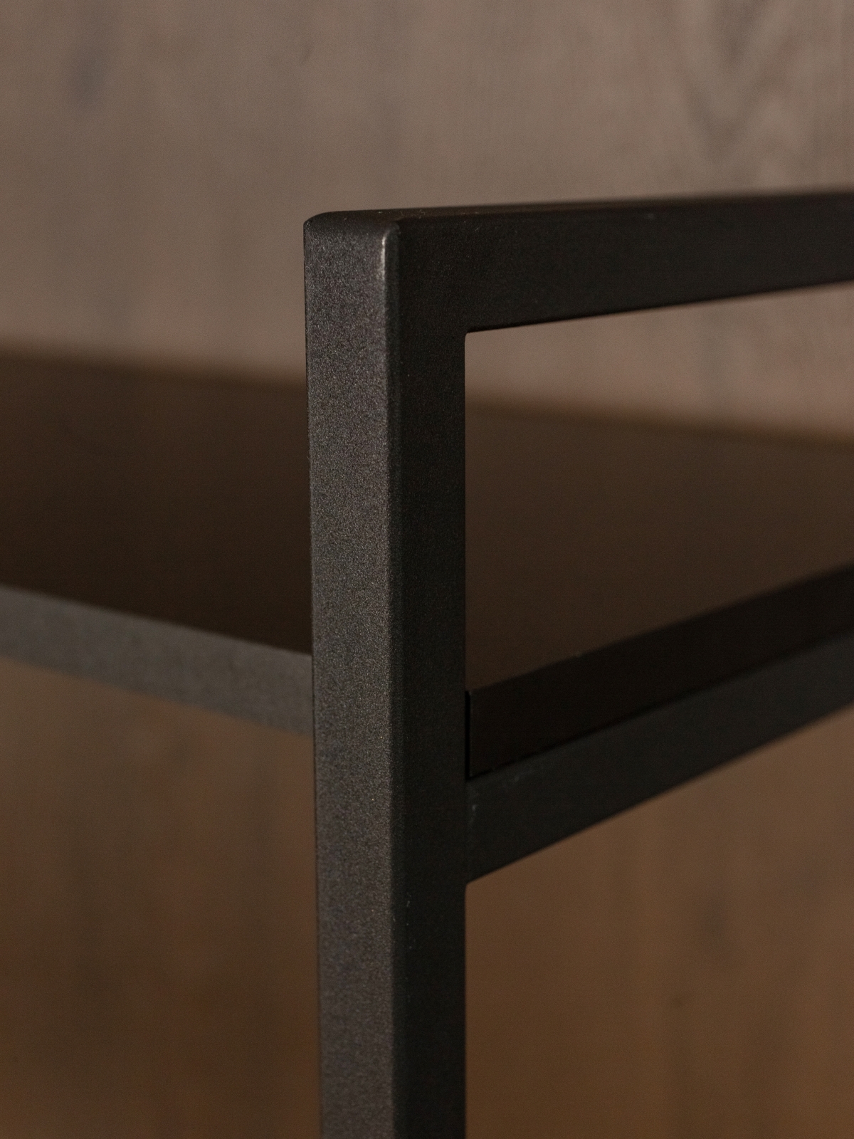 Каждая полка выдерживает нагрузку до 25 кг, что позволяет размещать не только книги, посуду или декор, но и более тяжелые предметы: например, технику, архивы, ящики с инструментами. Конструкция напольной металлической полки в стиле лофт остается устойчивой даже при полной нагрузке. Пластиковые заглушки на ножках защищают напольное покрытие от царапин — актуально для помещений с деликатными напольными покрытиями.