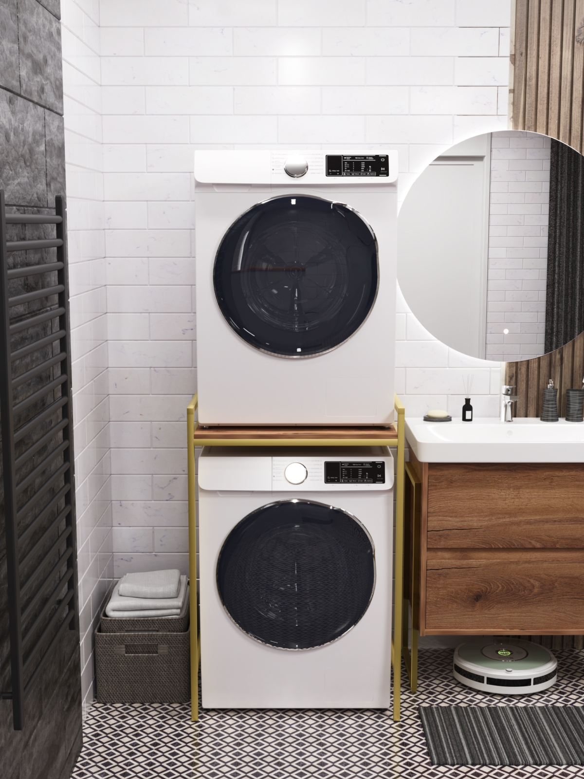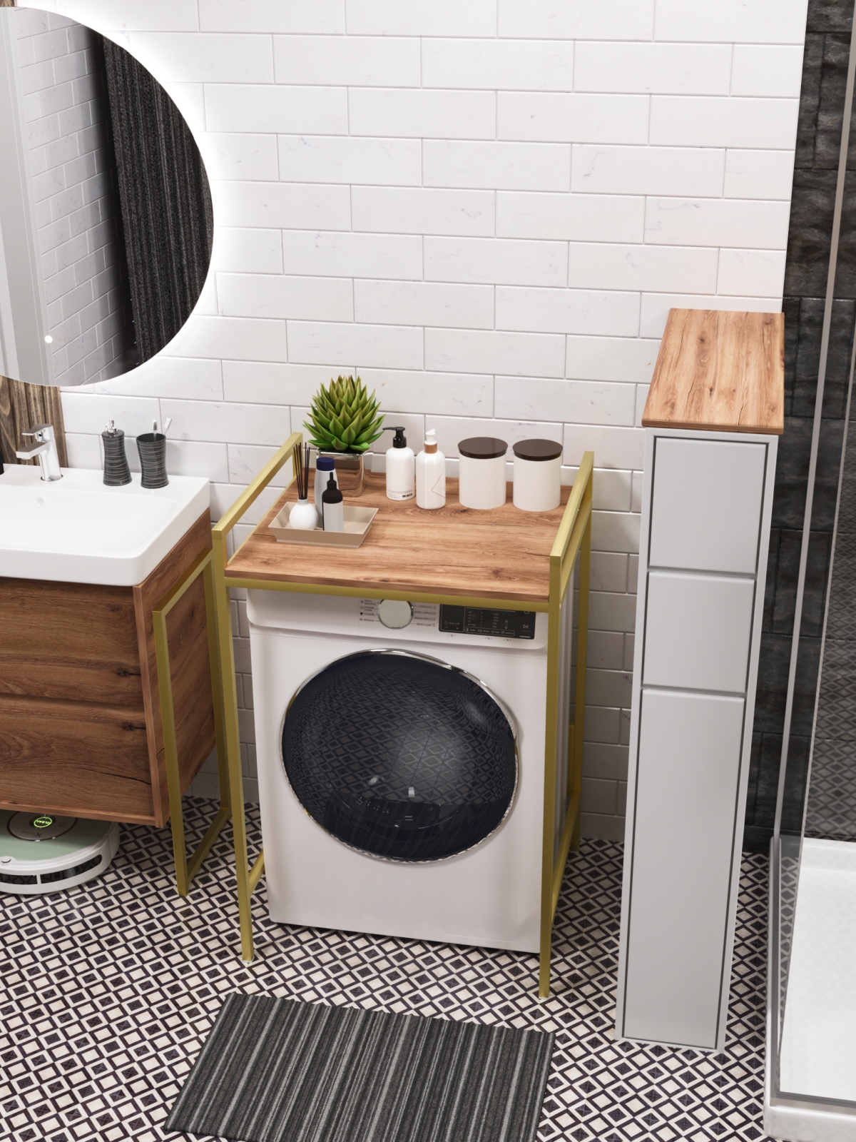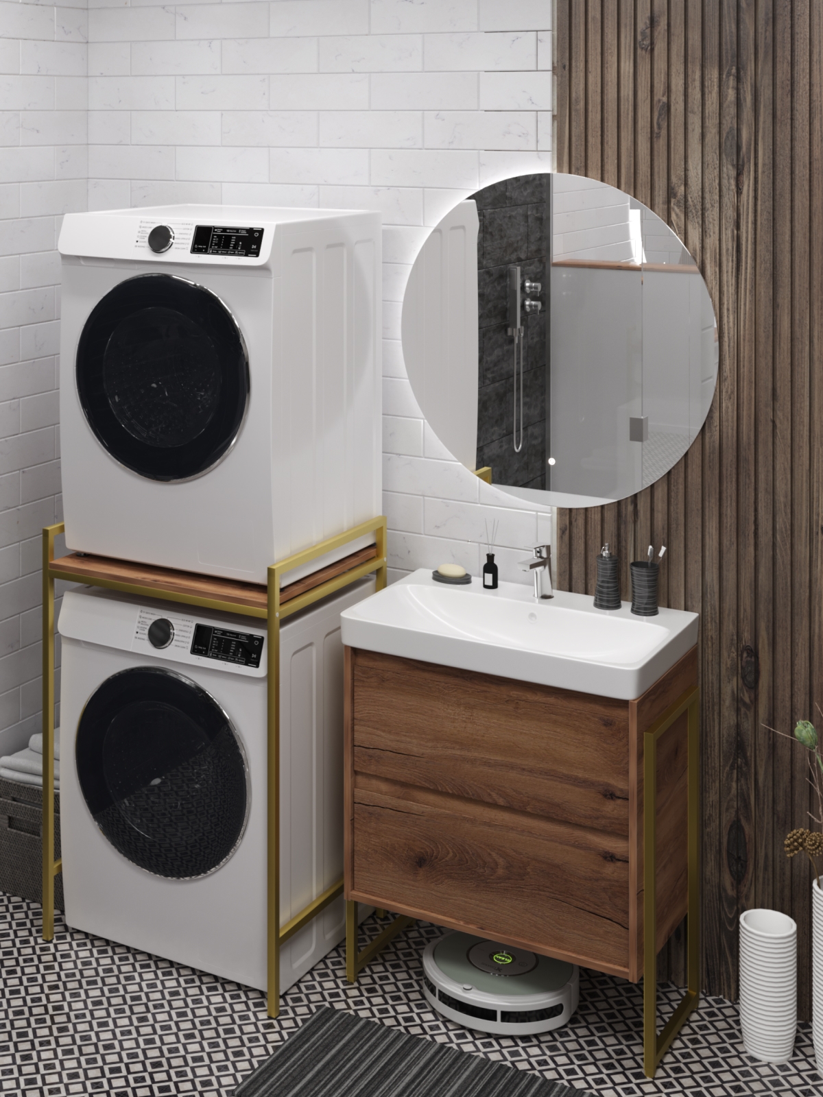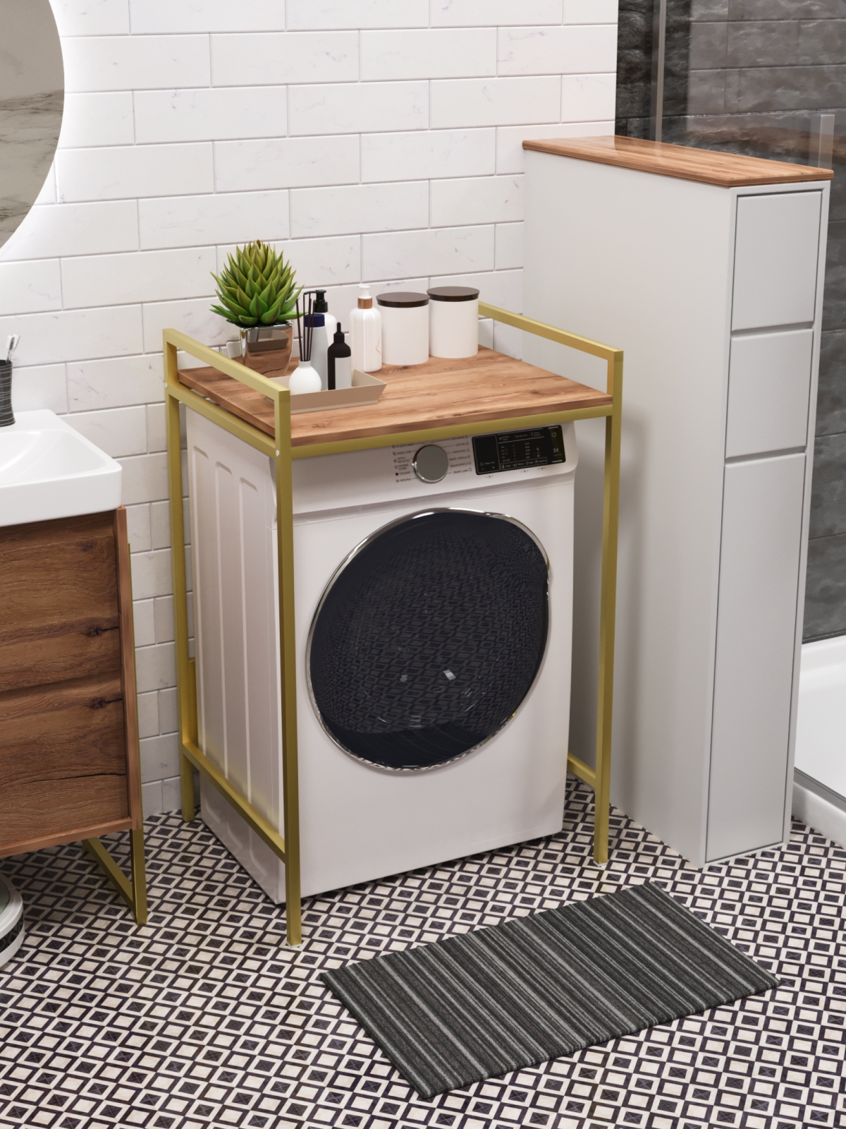 «Шексна» — больше, чем просто стеллаж над стиральной или сушильной машиной. Это декоративно-функциональный элемент, способный задать тон всему пространству. Металлический каркас, покрытый полимерно-порошковой краской благородного золотого оттенка, притягивает взгляд, добавляя интерьеру утонченности и визуального тепла.