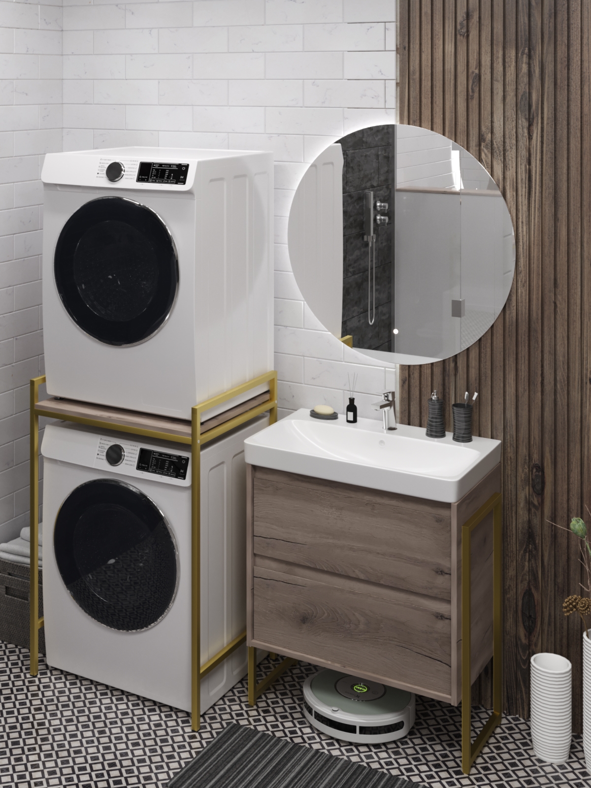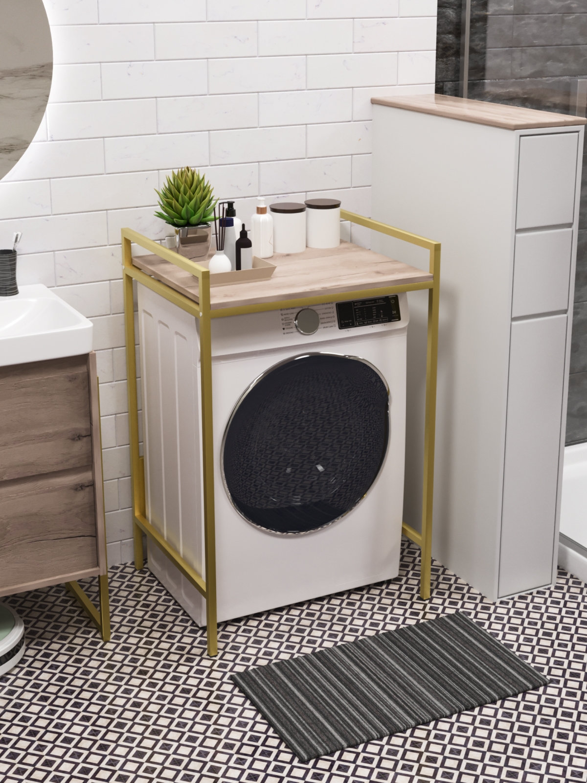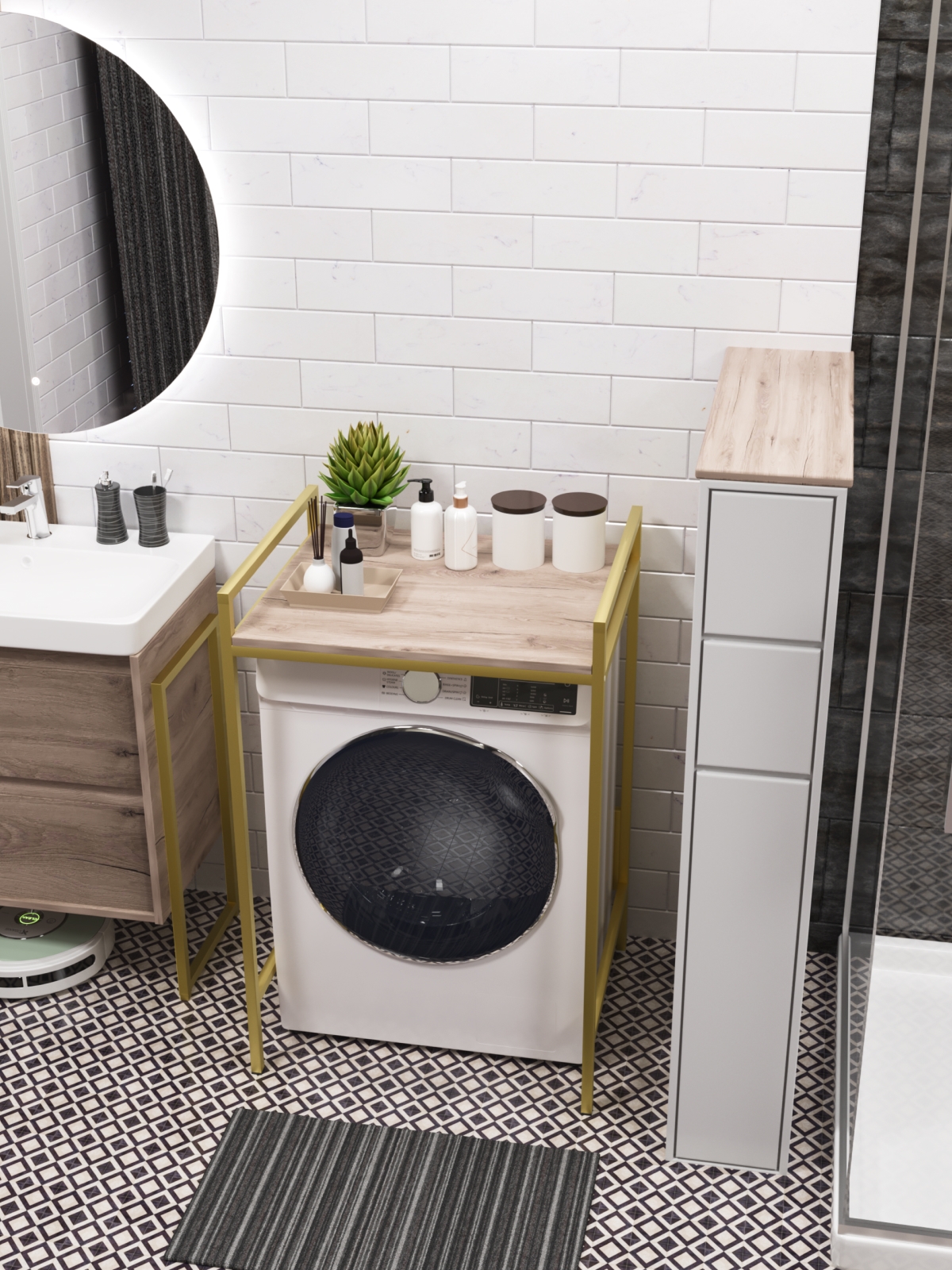 «Шексна» — больше, чем просто стеллаж над стиральной или сушильной машиной. Это декоративно-функциональный элемент, способный задать тон всему пространству. Металлический каркас, покрытый полимерно-порошковой краской благородного золотого оттенка, притягивает взгляд, добавляя интерьеру утонченности и визуального тепла.