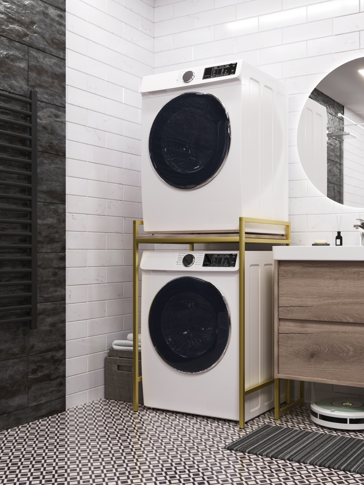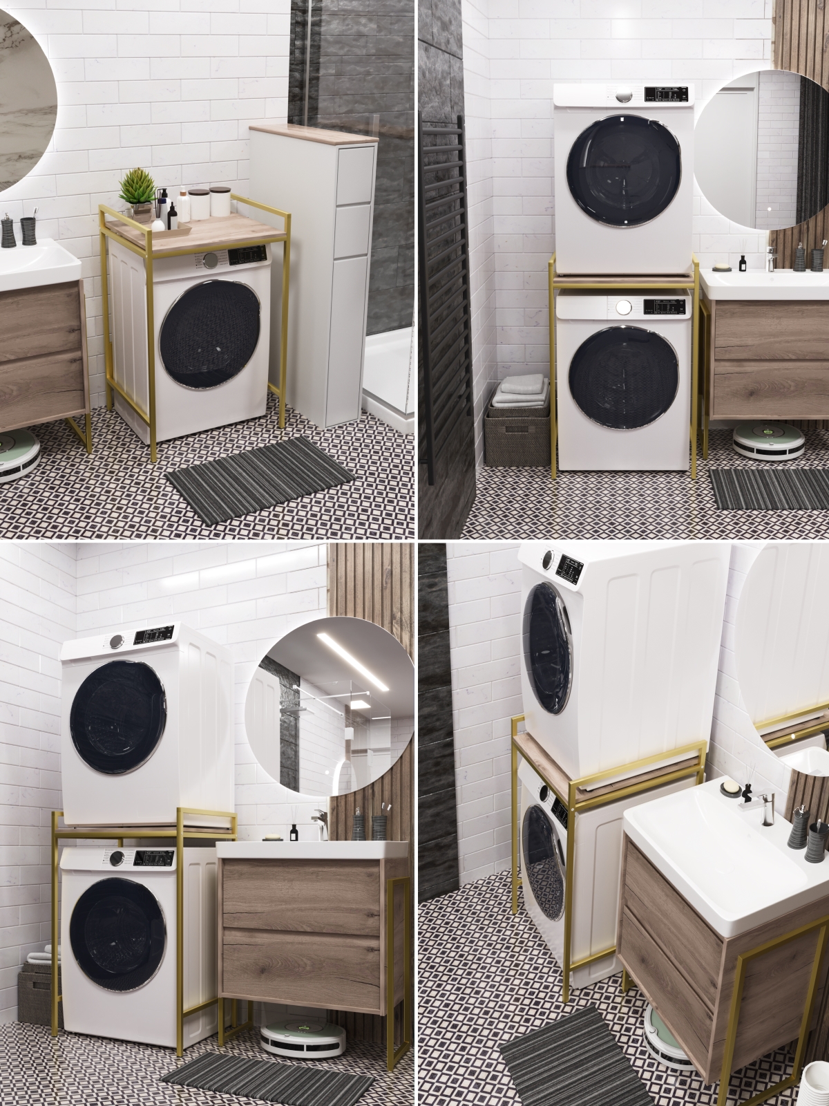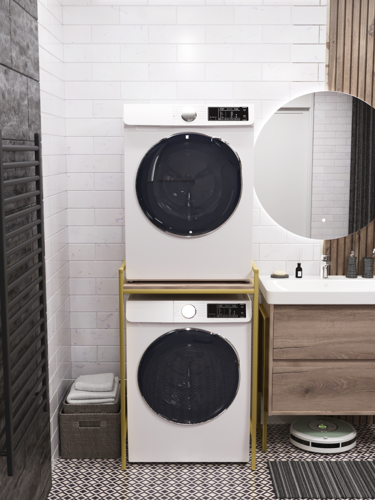 «Шексна» — больше, чем просто стеллаж над стиральной или сушильной машиной. Это декоративно-функциональный элемент, способный задать тон всему пространству. Металлический каркас, покрытый полимерно-порошковой краской благородного золотого оттенка, притягивает взгляд, добавляя интерьеру утонченности и визуального тепла.