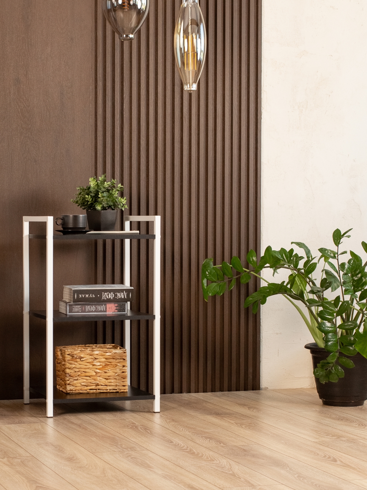 Полки изготовлены из ЛДСП с имитацией натуральной древесной текстуры, что добавляет тепла и тактильного комфорта, создавая гармоничный баланс с белым металлом. Такое сочетание материалов идеально вписывается в концепцию светлого лофта, где преобладают пастельные оттенки, минимализм и воздушность пространства. Благодаря этому «Двина» легко впишется в самые разные интерьеры — от уютных скандинавских квартир до просторных городских лофтов с кирпичными стенами и открытыми коммуникациями.