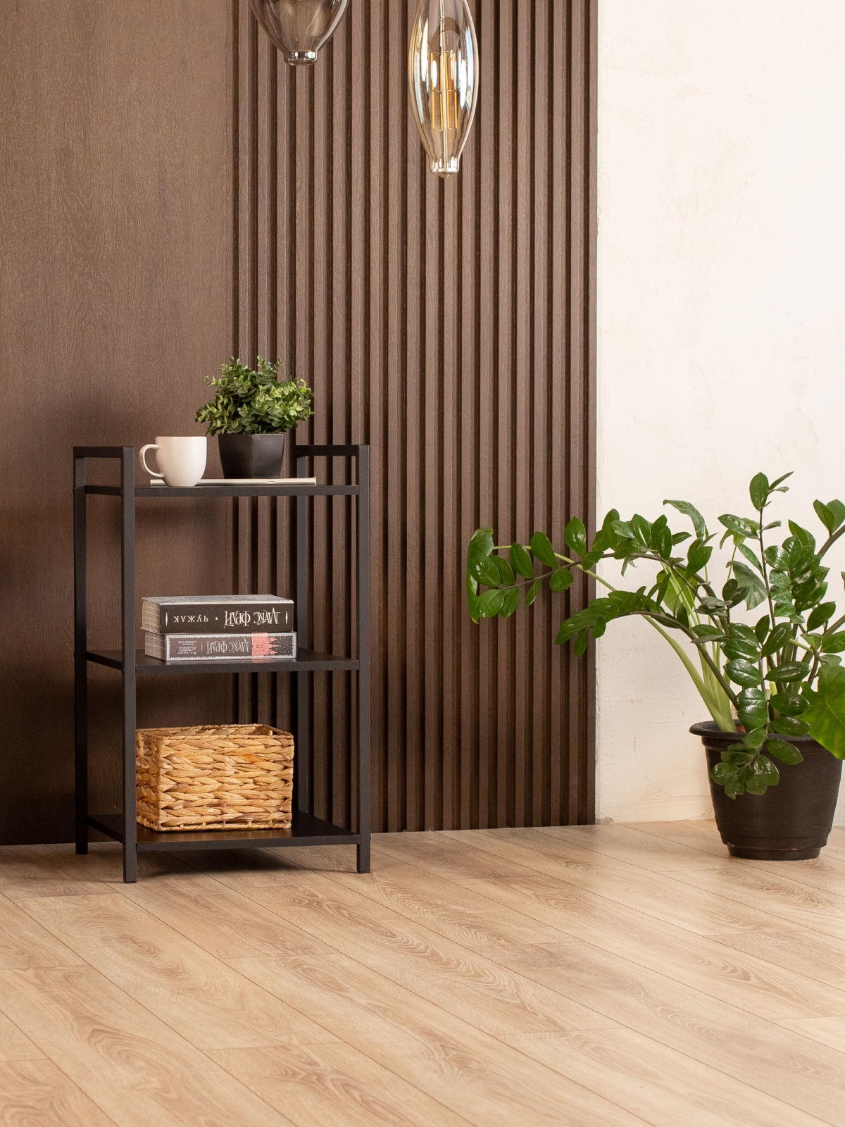 Полки изготовлены из ЛДСП с имитацией натурального дерева, что привносит в образ изделия теплую, природную фактуру и визуальную легкость. Контраст черного металла и древесного рисунка создает эффект баланса между индустриальной жесткостью и домашним уютом, характерным для классического лофта. Благодаря этому «Двина» органично вписывается в интерьерные решения с кирпичными или бетонными стенами, деревянными балками и другими индустриальными элементами. Она легко станет акцентом, подчеркивающим стиль пространства, или же гармоничным дополнением к уже существующей композиции.