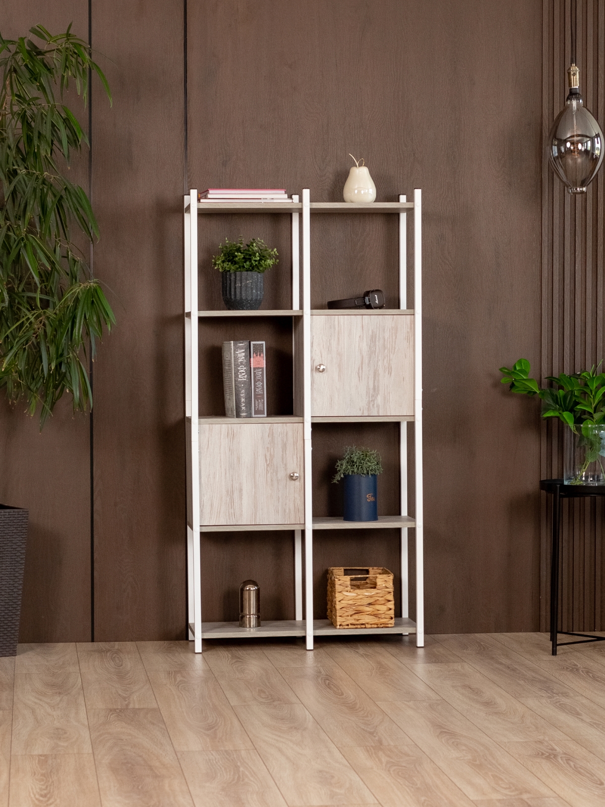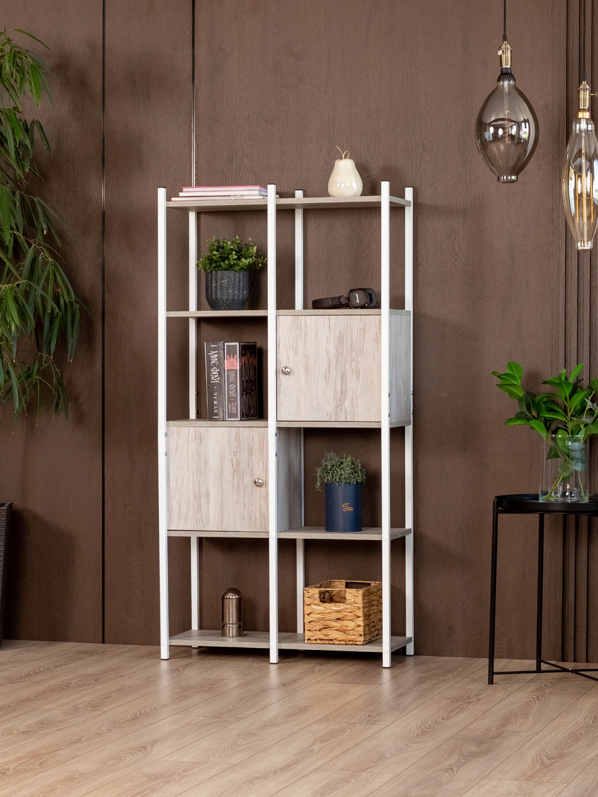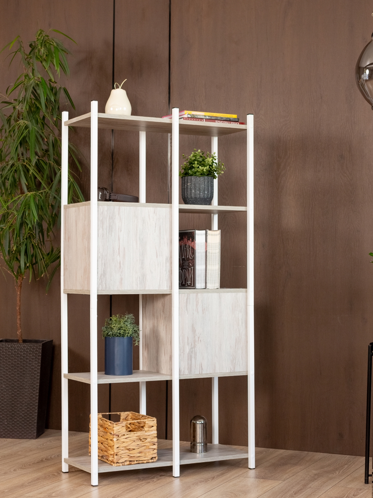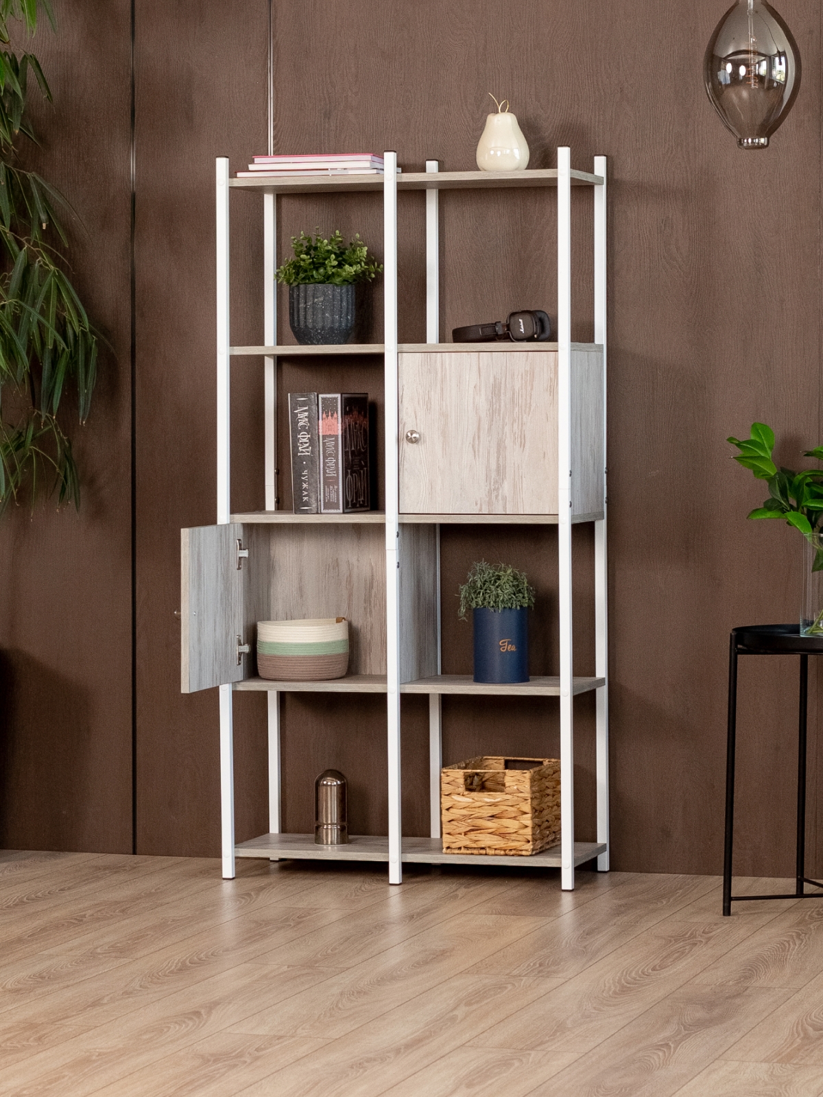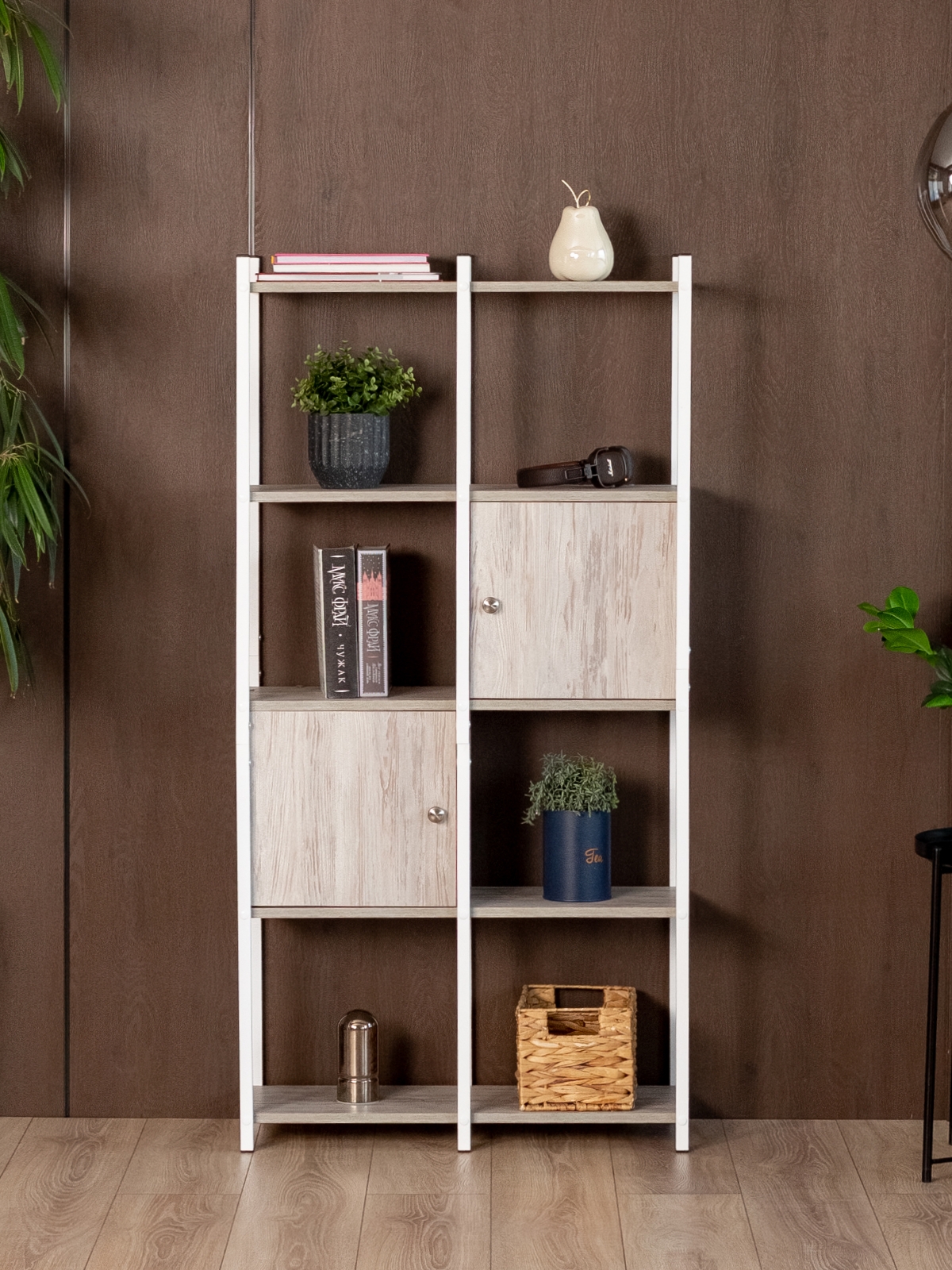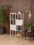 Конструкция стеллажа включает открытые и закрытые секции. Это позволяет удобно организовать хранение и визуально разгрузить пространство. Открытые полки подойдут для книг, декоративных элементов, комнатных растений и аксессуаров, в то время как за дверцами можно скрыть все лишнее — от документов до личных вещей. Стеллаж станет не только стильным, но и надежным помощником в повседневной организации пространства.