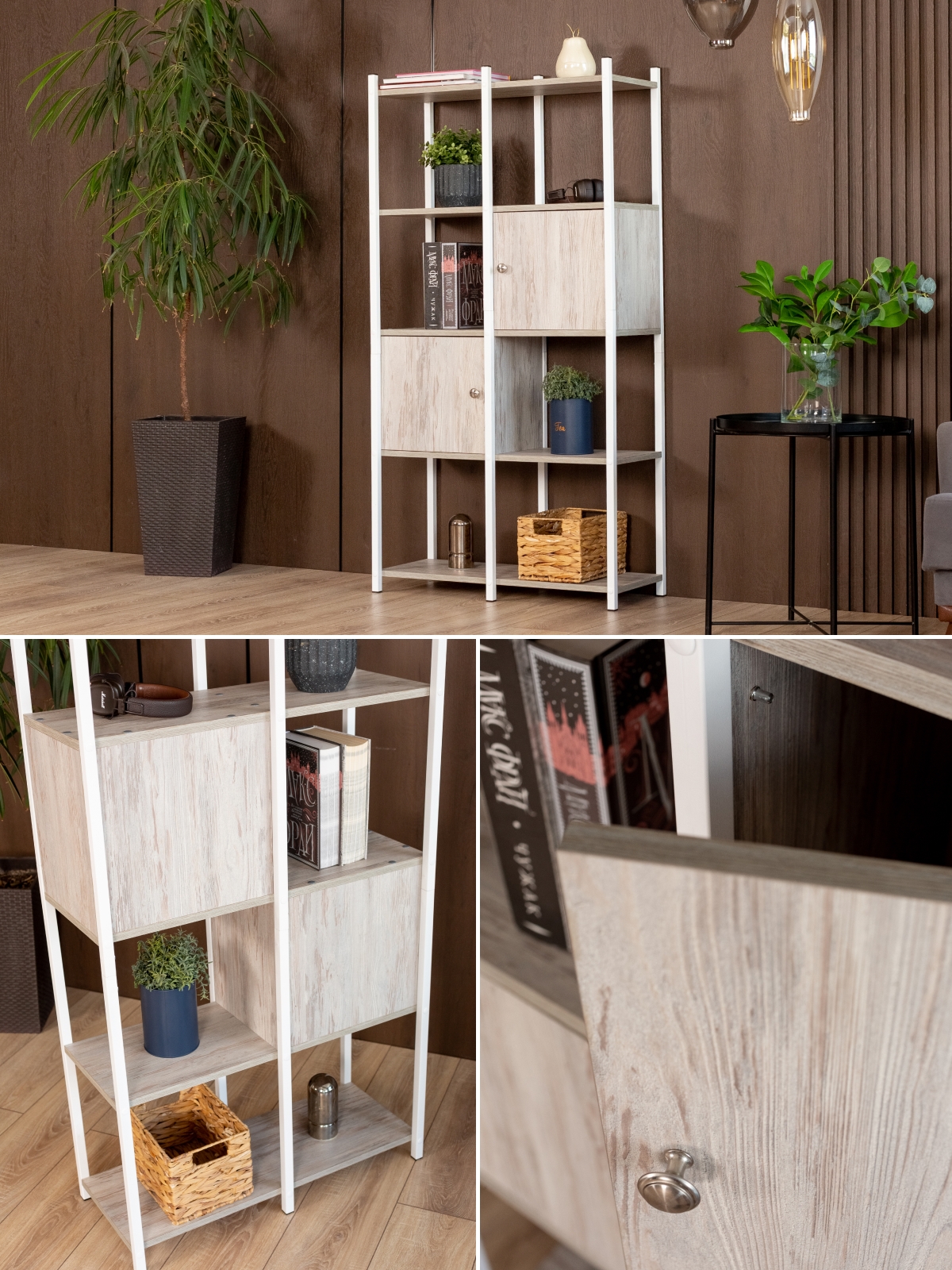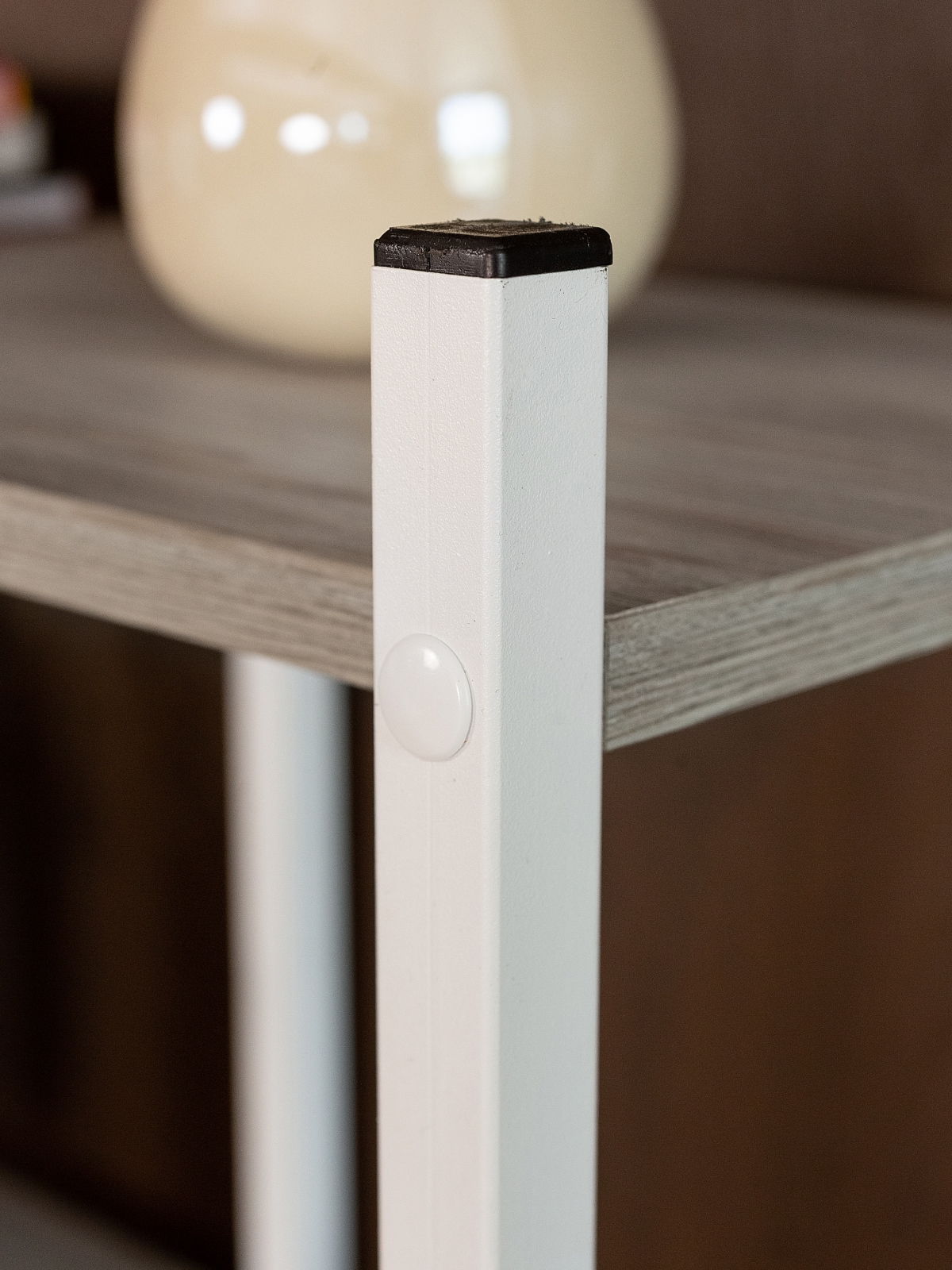 Каркас изделия выполнен из металла и окрашен полимерно-порошковой краской в чистый белый цвет. Покрытие не только подчеркивает визуальную чистоту и аккуратность изделия, но и защищает металл от царапин и коррозии. Белый каркас гармонично контрастирует с полками и дверцами из ЛДСП, оформленными с реалистичной имитацией натурального дерева — теплый оттенок древесины смягчает строгость металлической основы.