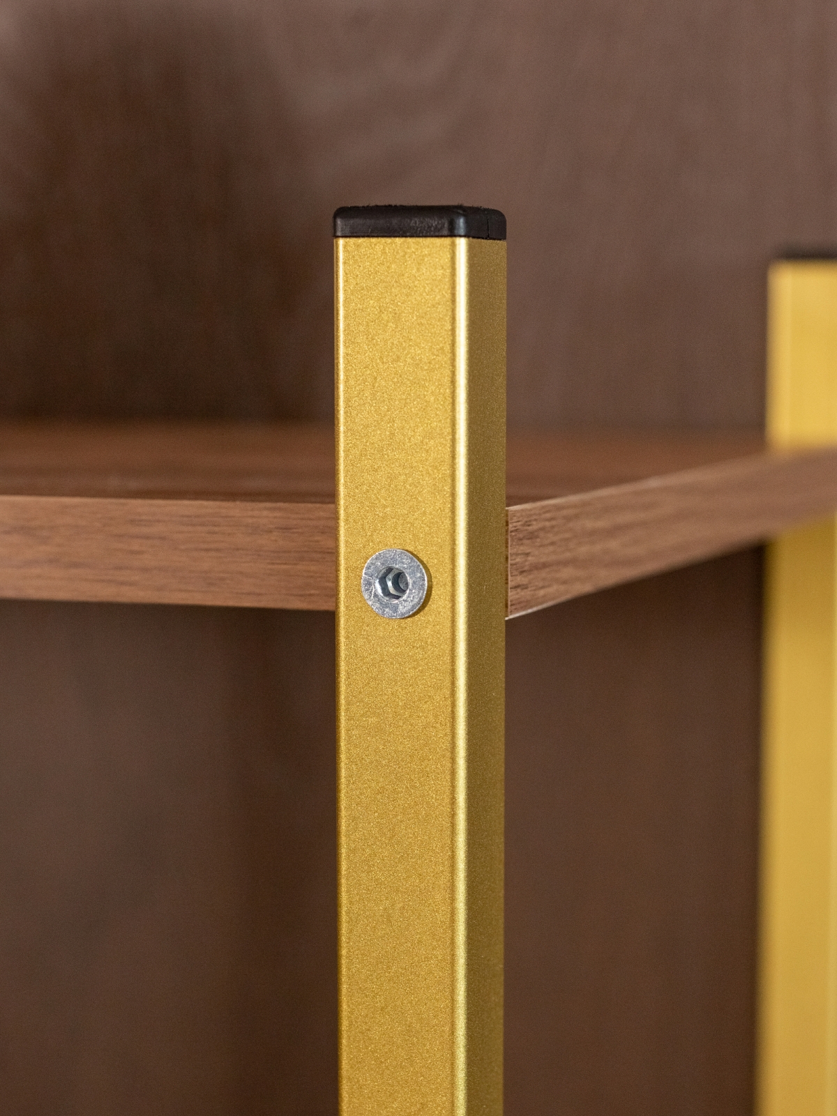 Каркас изделия выполнен из прочного металла, покрытого полимерно-порошковой краской в изысканном золотом оттенке. Блеск металла смотрится особенно эффектно в пространстве со светлыми бетонными стенами, матовыми поверхностями, мягким текстилем. Стеллаж буквально вписывается в эстетику гламурного лофта — там, где индустриальные формы сочетаются с деликатной роскошью.