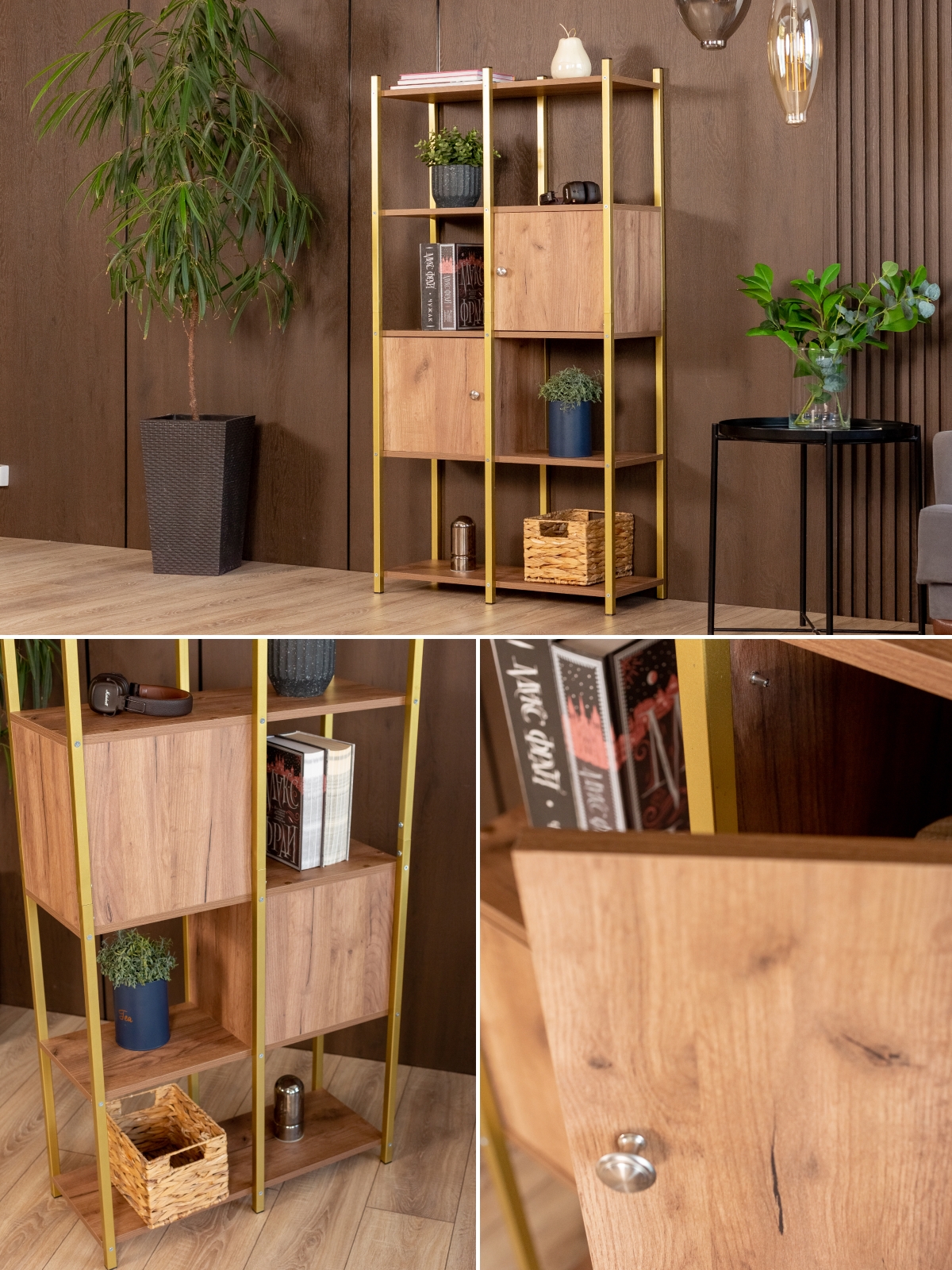 Фасады и полки выполнены из ЛДСП с текстурой натурального дерева — теплый древесный рисунок уравновешивает блеск золота и делает композицию уютной. Такое сочетание позволяет «Сагамо» органично смотреться как в богемном лофте, так и в современных интерьерах с элементами ар-деко, эклектики или неоклассики. Это не просто мебель, а инструмент для создания пространственной драматургии: вы можете обыграть его в композиции с зеркалами в золотой раме, светильниками с латунными акцентами или бархатной мебелью.