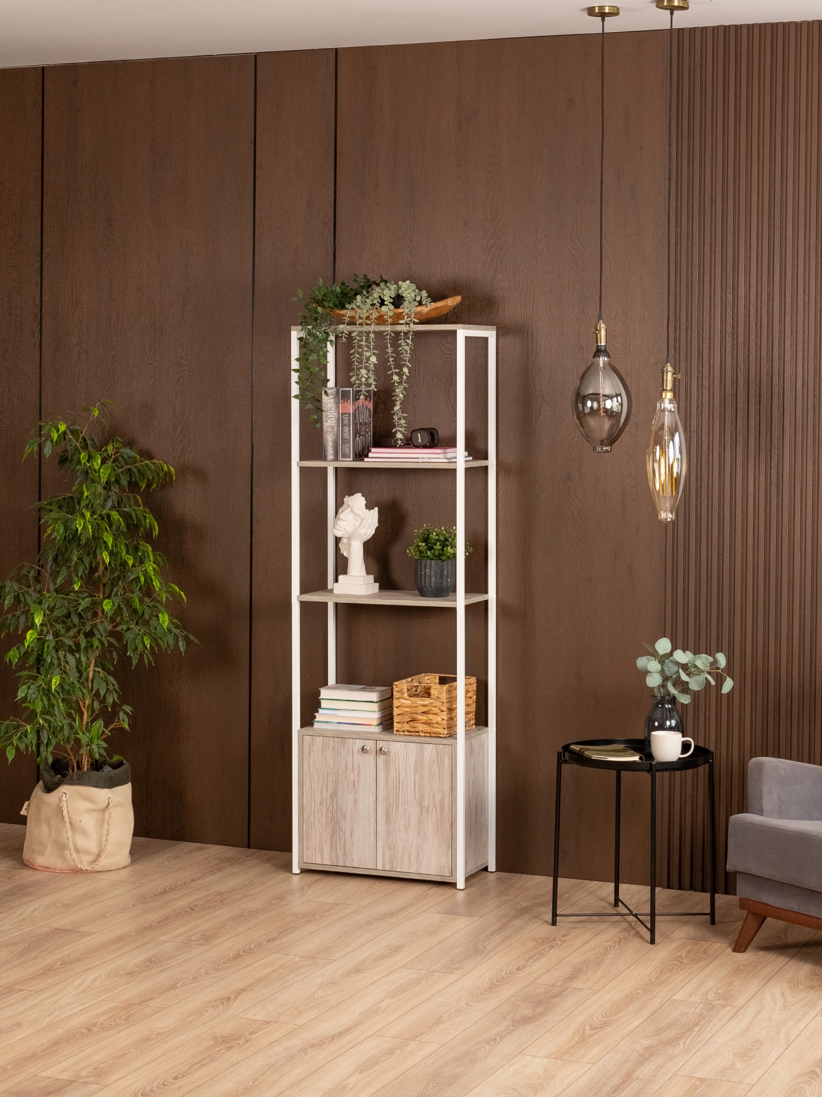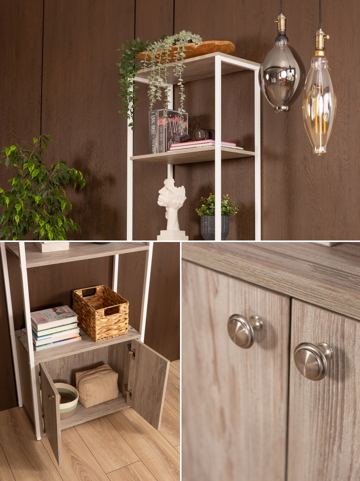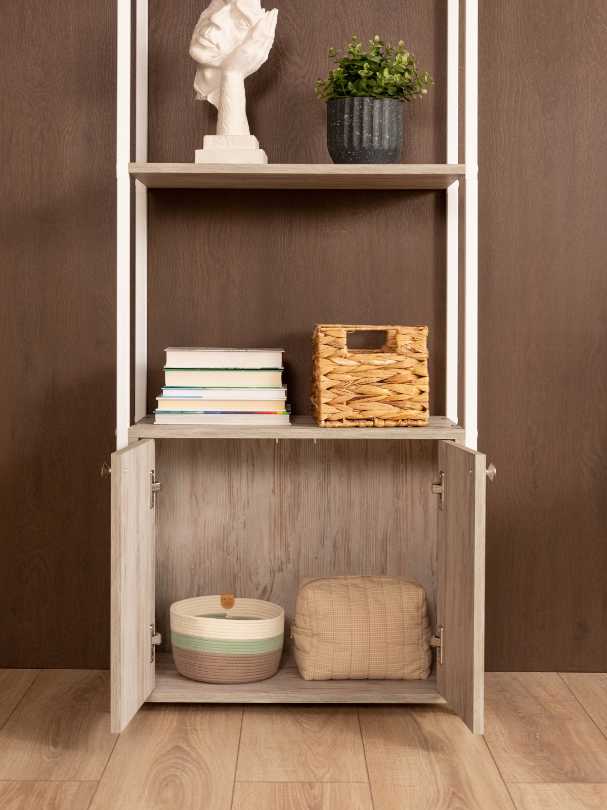 Три открытые полки — идеальное пространство для размещения книг, элементов декора, посуды и комнатных растений. Открытый формат создает ощущение упорядоченности, помогает поддерживать визуальный порядок и подчеркивает стиль интерьера. Нижняя часть стеллажа дополнена тумбой с распашными дверцами, где удобно хранить личные вещи, бытовые предметы или документы.
