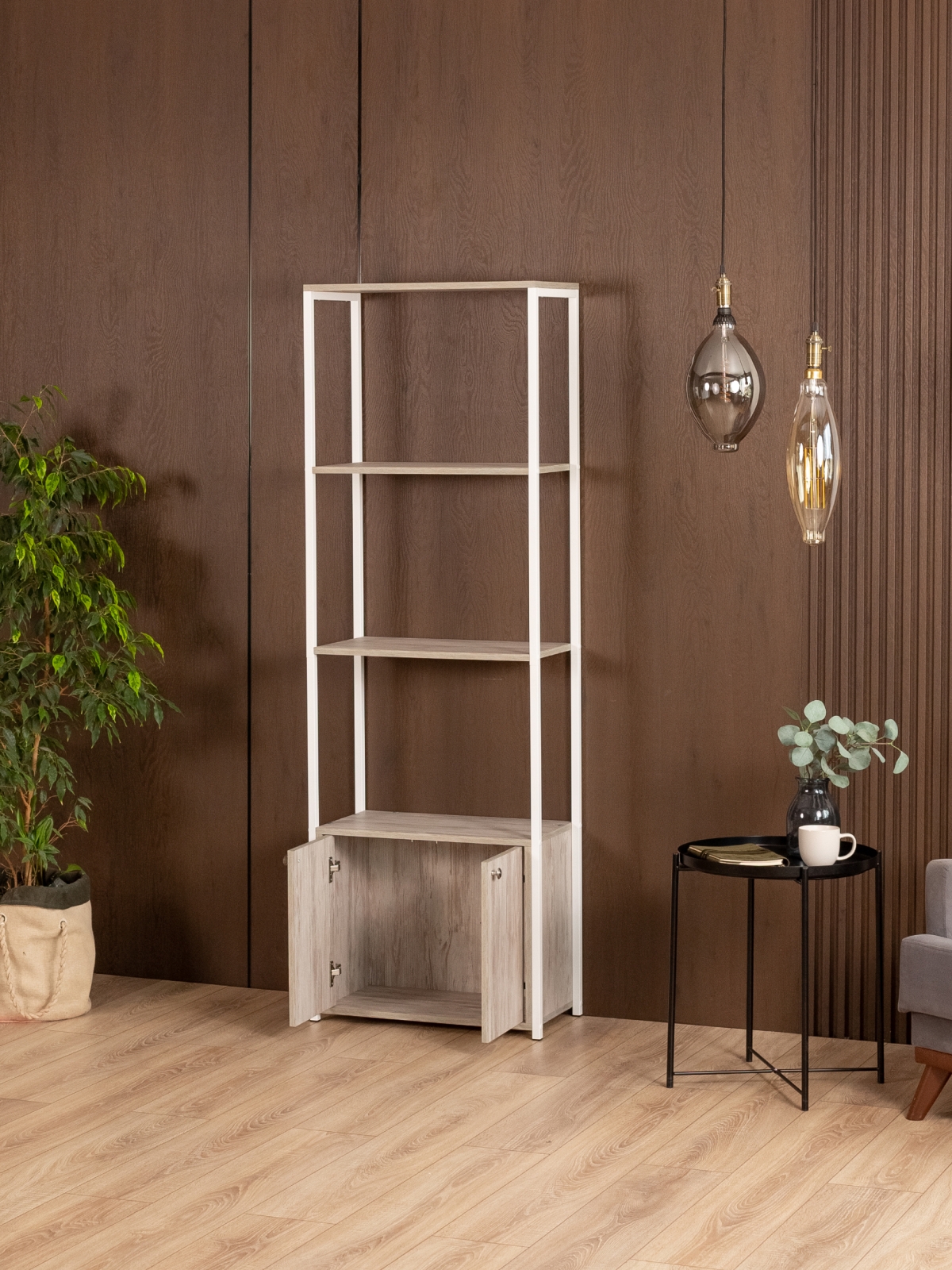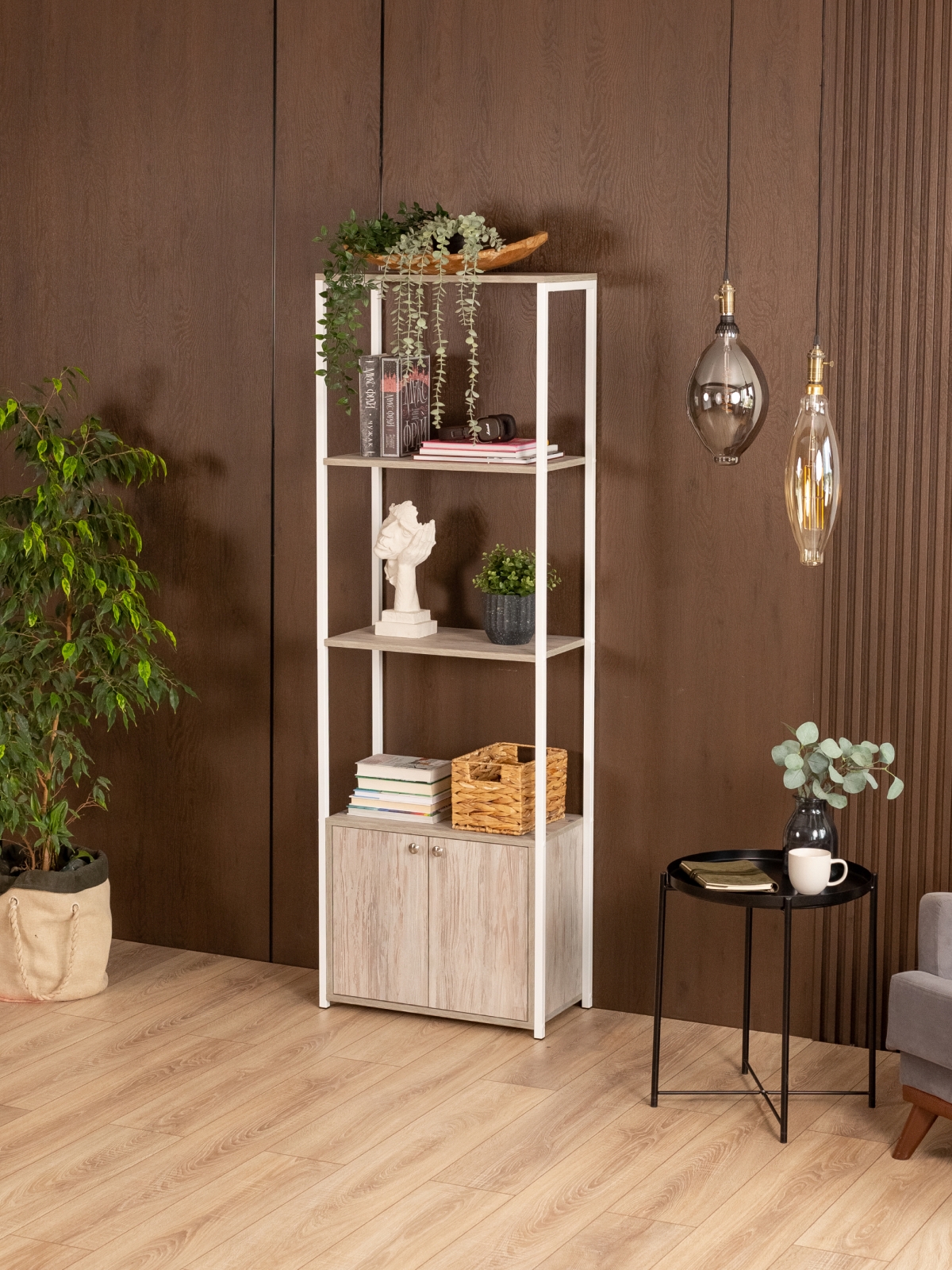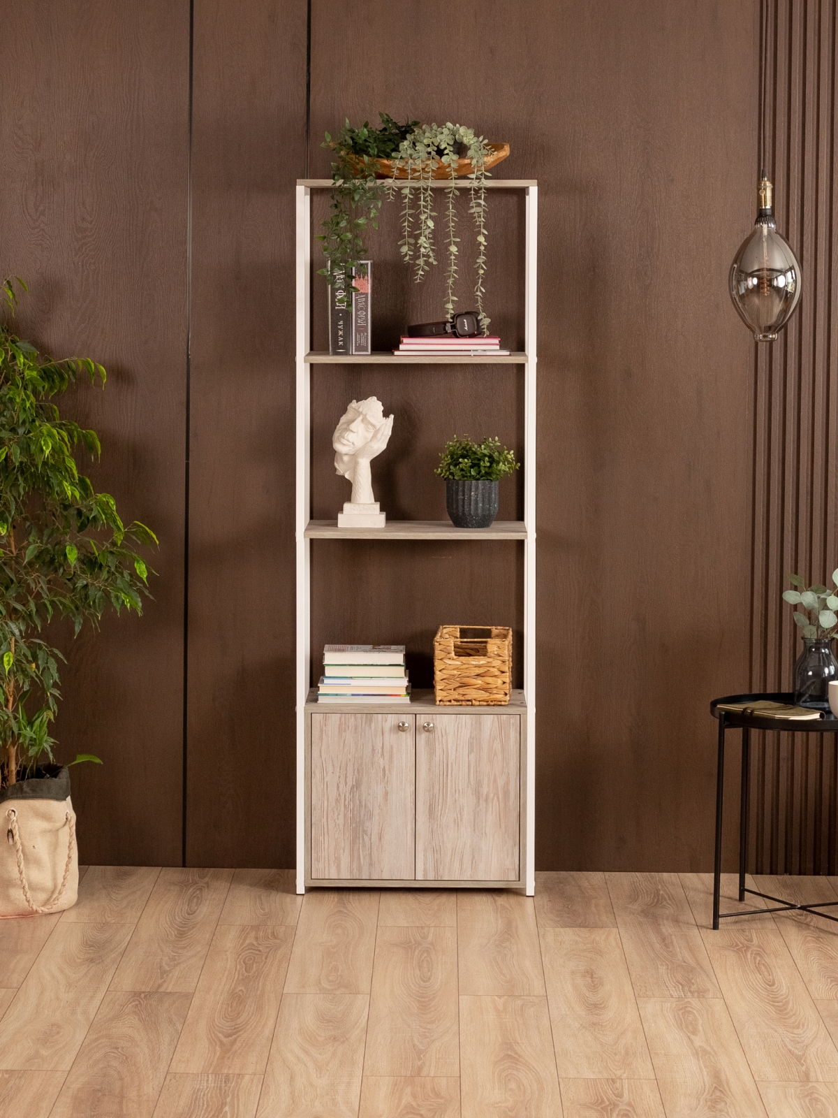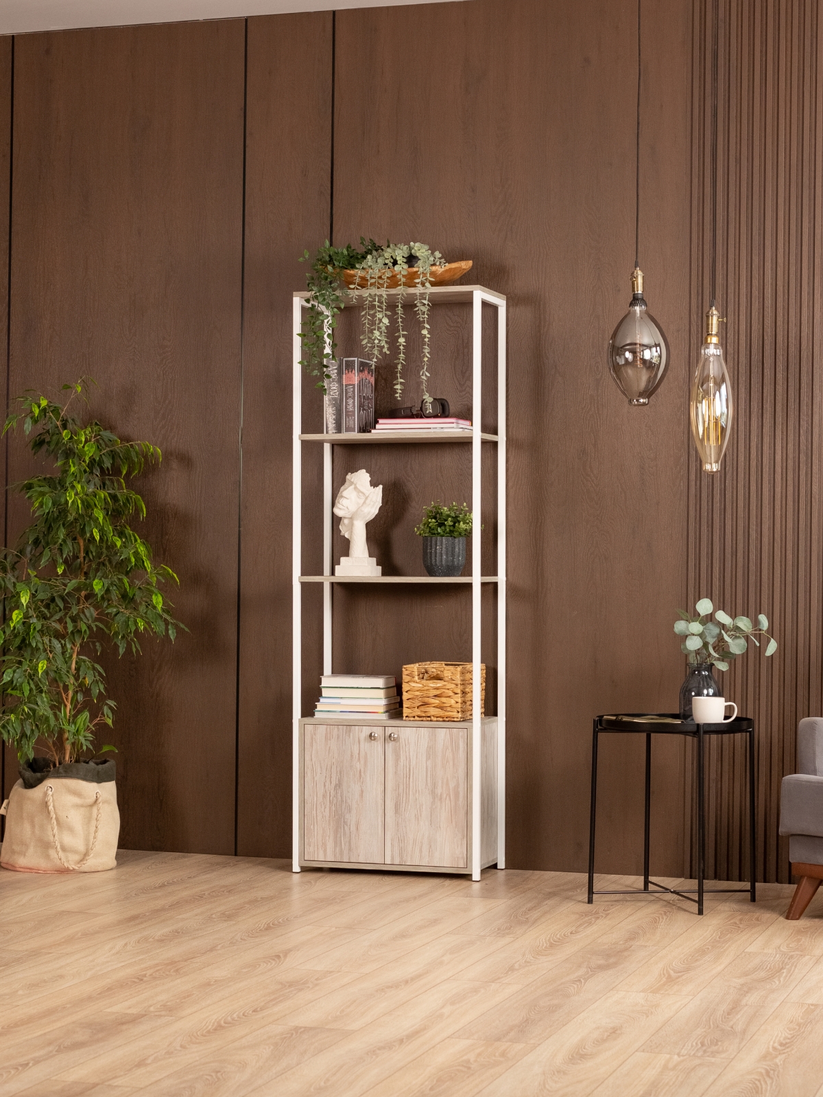 Три открытые полки — идеальное пространство для размещения книг, элементов декора, посуды и комнатных растений. Открытый формат создает ощущение упорядоченности, помогает поддерживать визуальный порядок и подчеркивает стиль интерьера. Нижняя часть стеллажа дополнена тумбой с распашными дверцами, где удобно хранить личные вещи, бытовые предметы или документы.