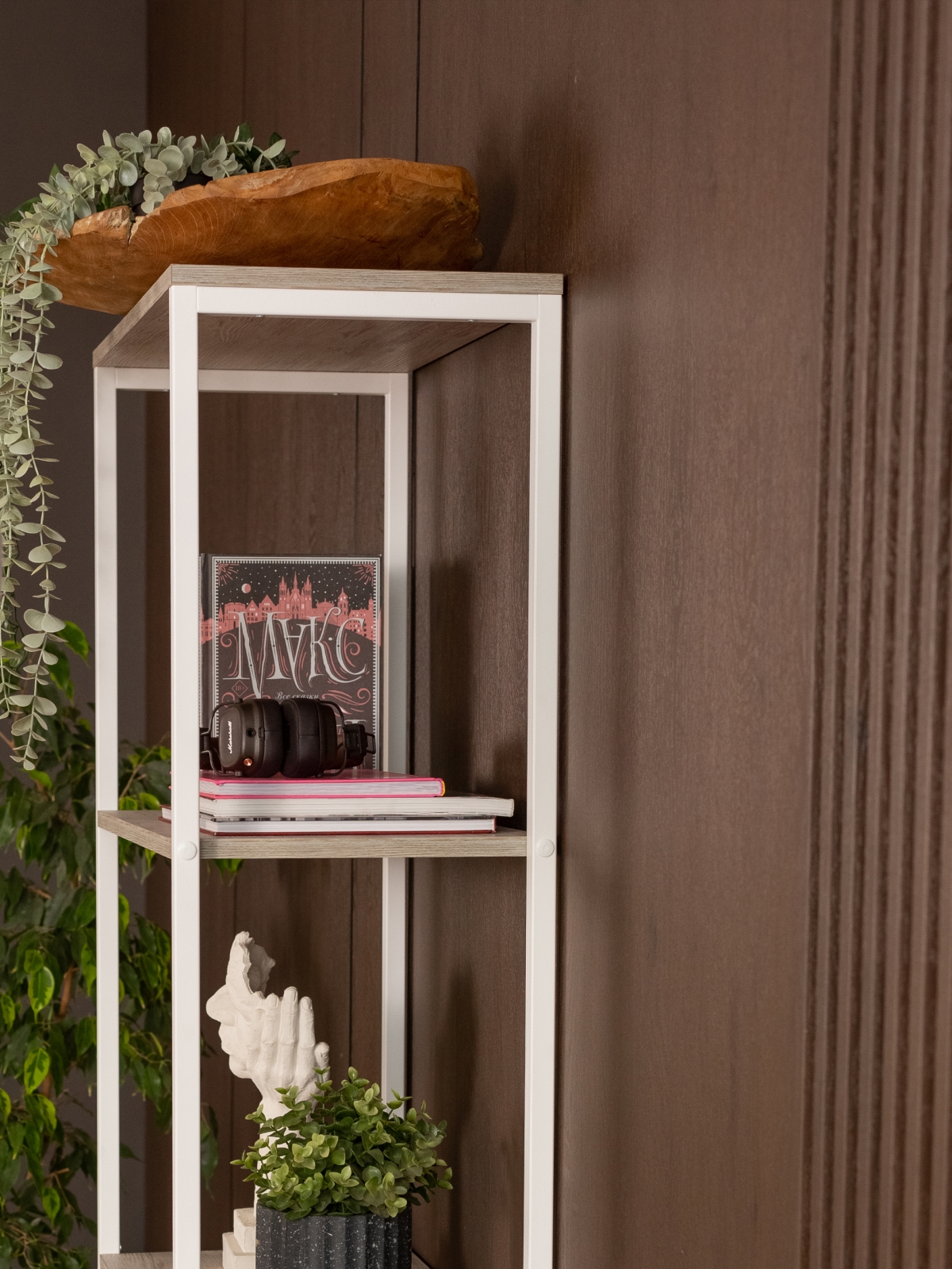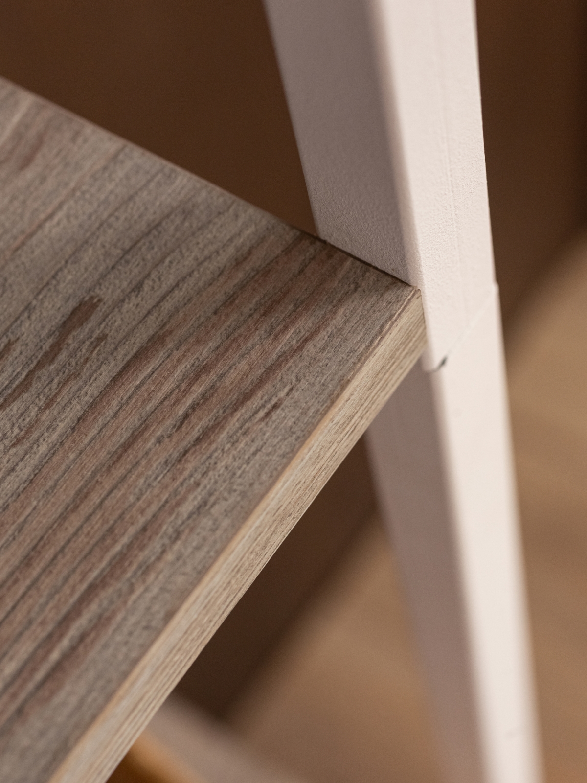 Полки и тумба изготовлены из качественной ЛДСП с текстурой, имитирующей натуральное дерево. Оттенок древесины не вычурный, что позволяет комбинировать изделие с пастельной палитрой — пыльно-розовыми, оливковыми, кремовыми и бежевыми оттенками. Такой контраст между белым металлом и деревом делает конструкцию выразительной, но не перегруженной, сохраняя чистоту формы и визуальную легкость.