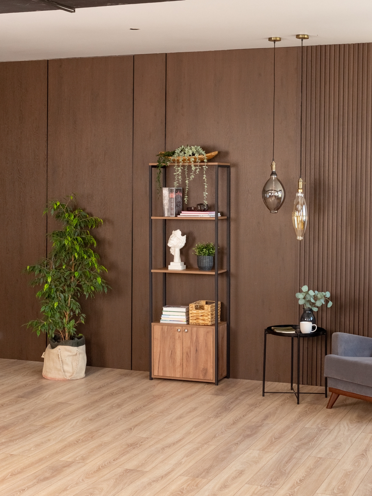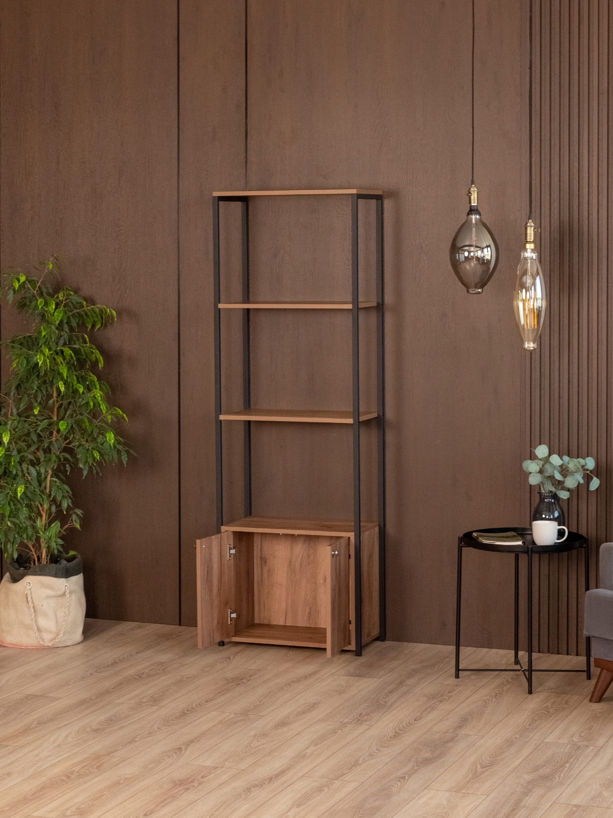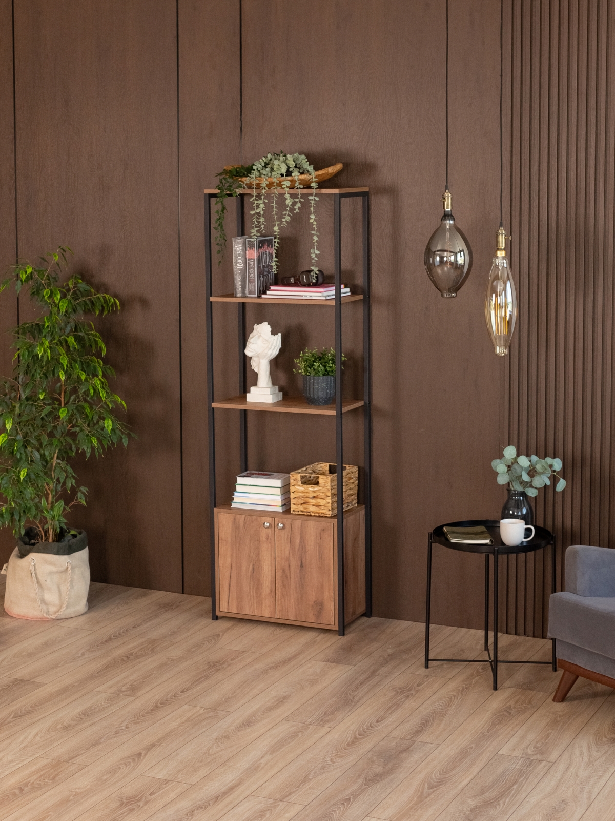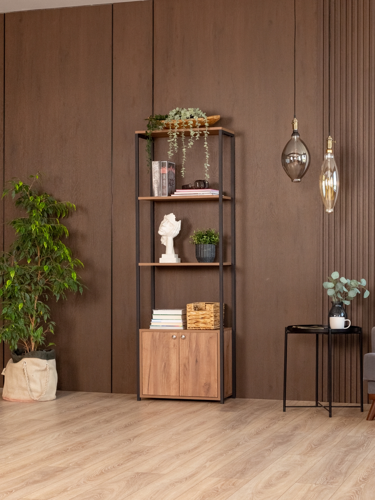 Стеллаж «Семуа» — это продуманное сочетание выразительного дизайна, практичности и современного подхода к оформлению интерьера. Он создан в духе классического лофта, где строгие линии металла сочетаются с теплой фактурой дерева. Такой стиль позволяет использовать изделие как в жилых помещениях, так и в коммерческих пространствах — от уютных гостиных до студий, офисов и кафе.