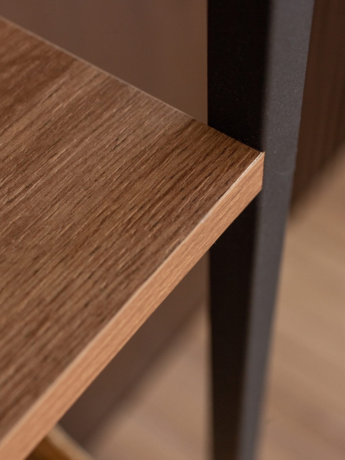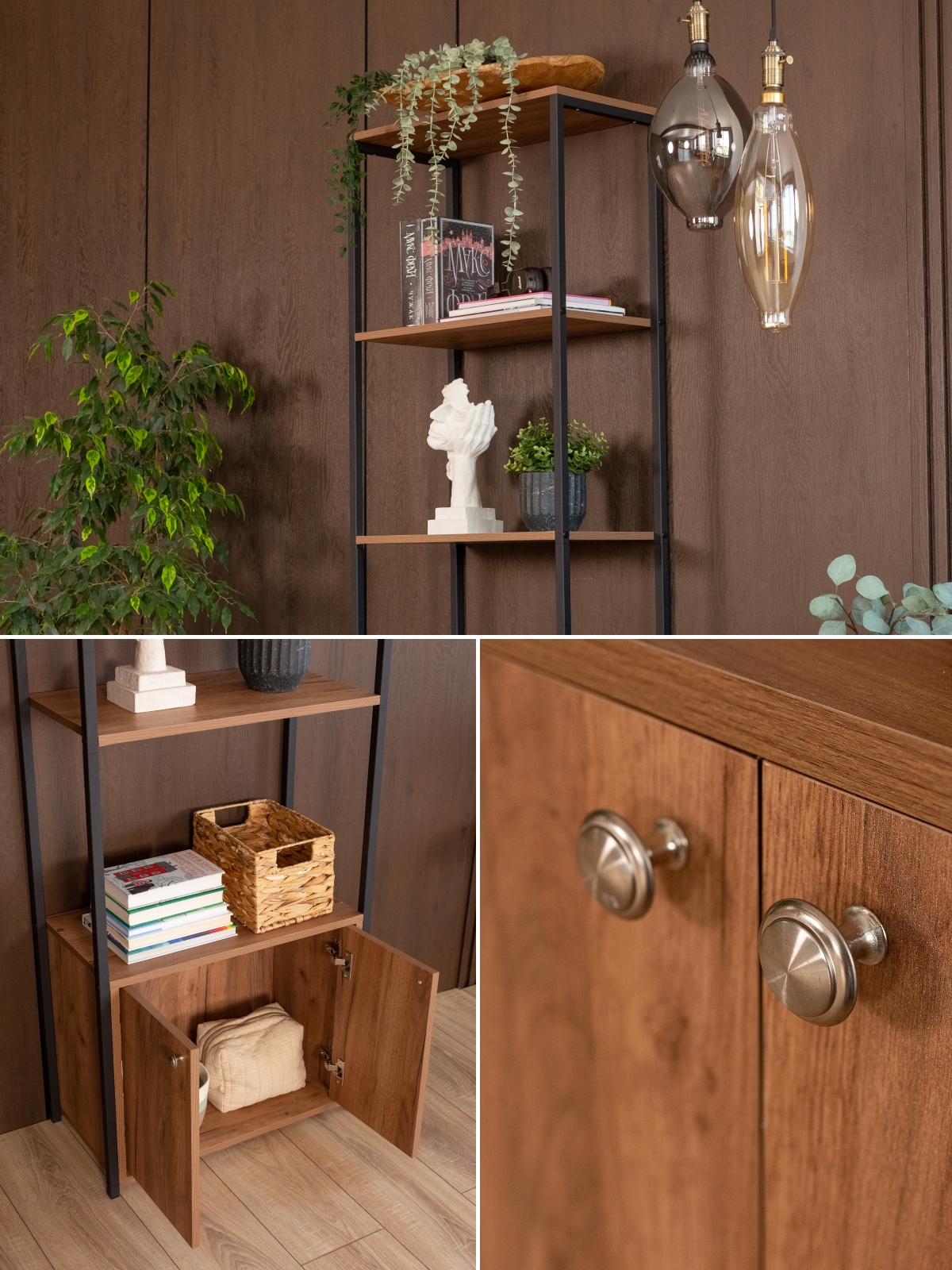 Полки и нижняя тумба выполнены из высококачественной ЛДСП с фактурой, имитирующей натуральное дерево. Этот материал сочетает в себе эстетическую привлекательность и практичность: он не требует особого ухода и легко вписывается в повседневный ритм городской жизни.