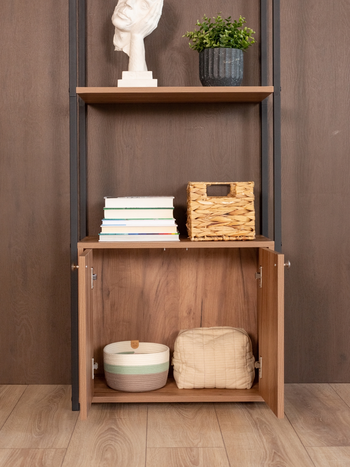 Верхняя часть стеллажа представлена тремя открытыми полками, которые идеально подходят для размещения книг, декоративных предметов, комнатных растений, посуды. Полки не перегружают пространство, сохраняя ощущение порядка и легкости. Нижняя тумба с дверцами добавляет конструкции функциональности и позволяет хранить те вещи, которые не хочется оставлять на виду — документы, технику, мелкий текстиль или бытовые предметы.