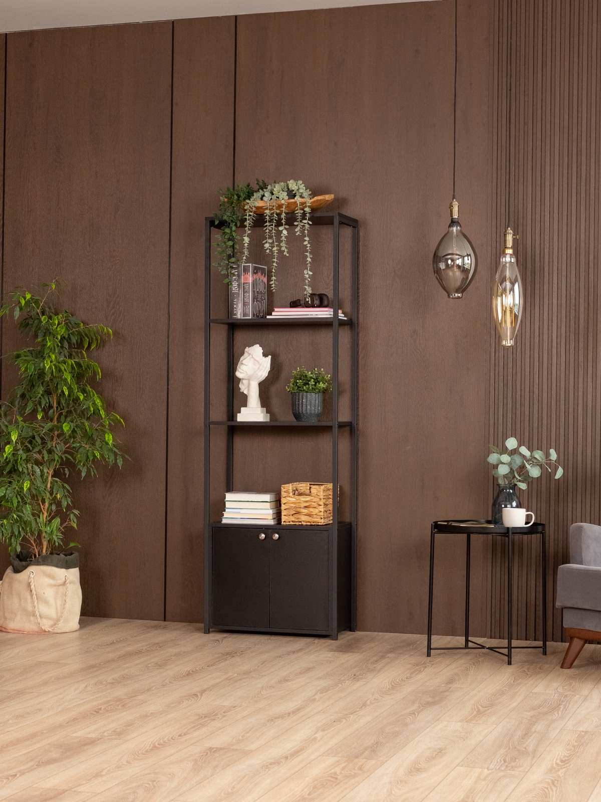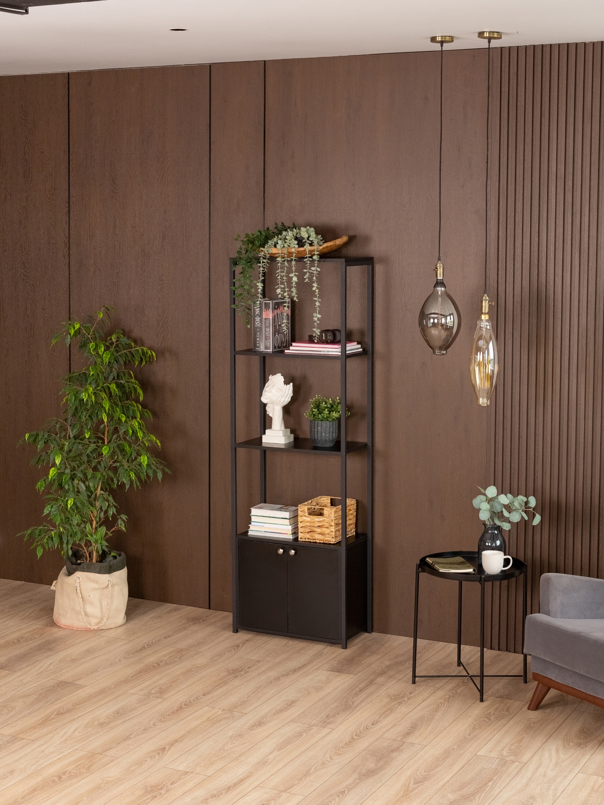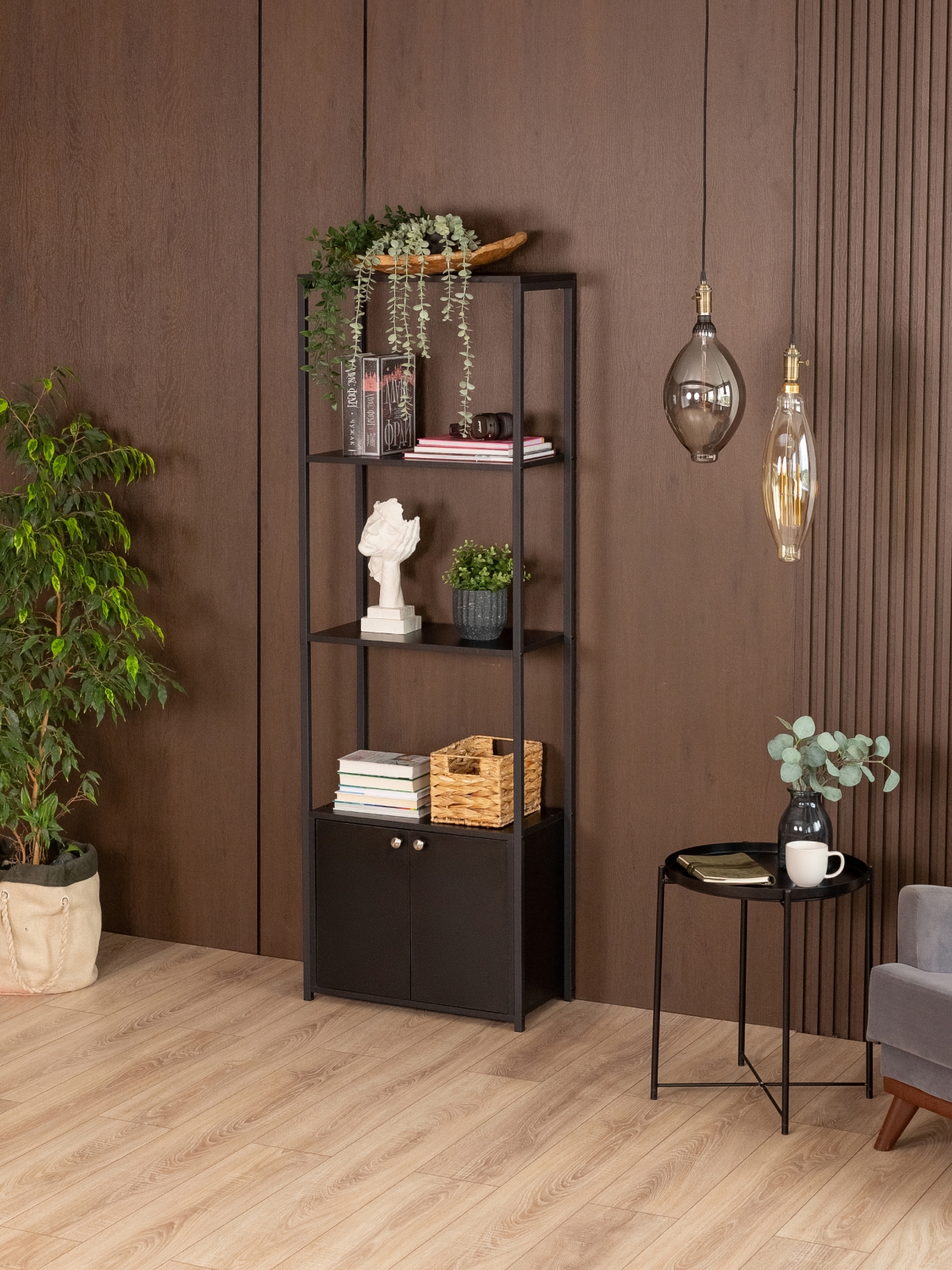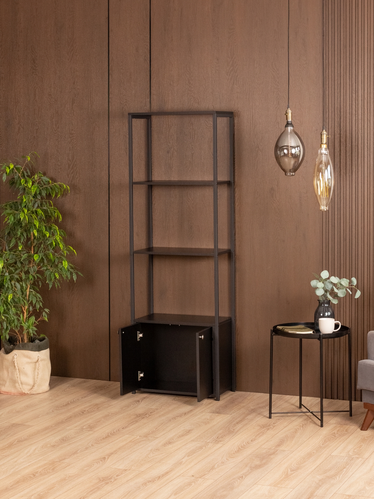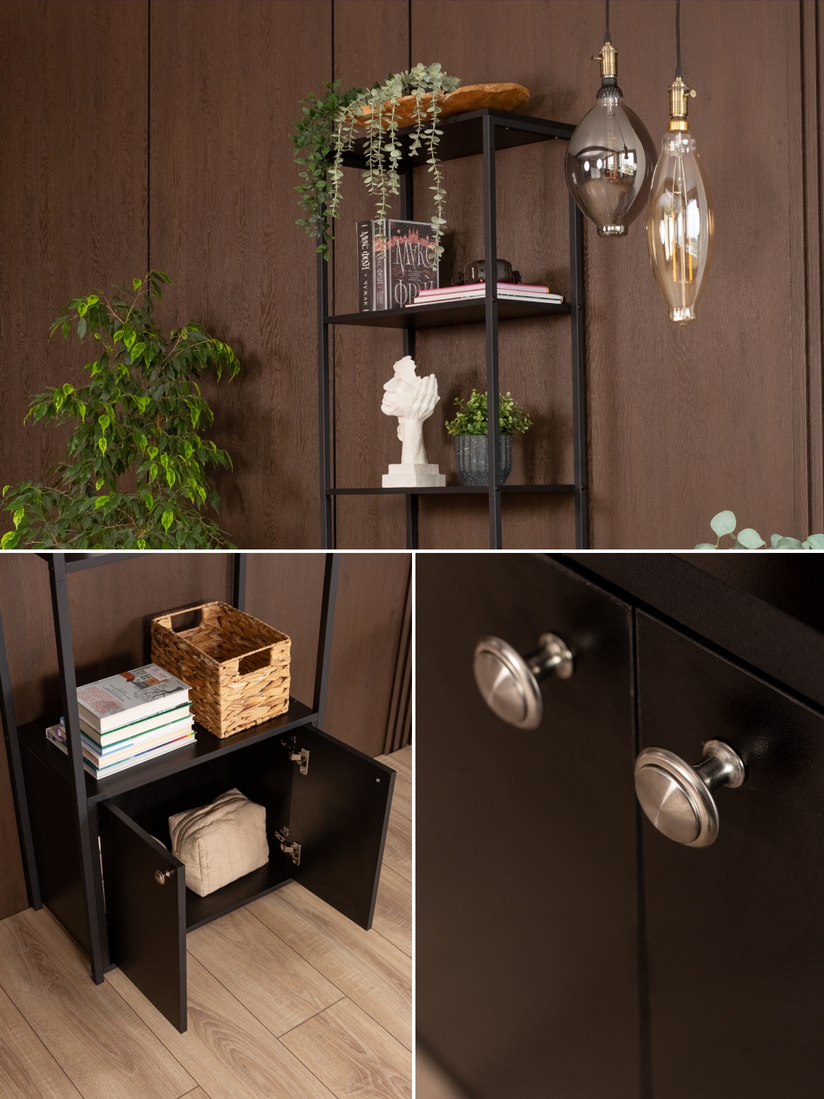 Верхняя часть стеллажа представлена тремя открытыми полками, которые идеально подходят для размещения книг, декоративных предметов, комнатных растений, посуды. Полки не перегружают пространство, сохраняя ощущение порядка и легкости. Нижняя тумба с дверцами добавляет конструкции функциональности и позволяет хранить те вещи, которые не хочется оставлять на виду — документы, технику, мелкий текстиль или бытовые предметы.