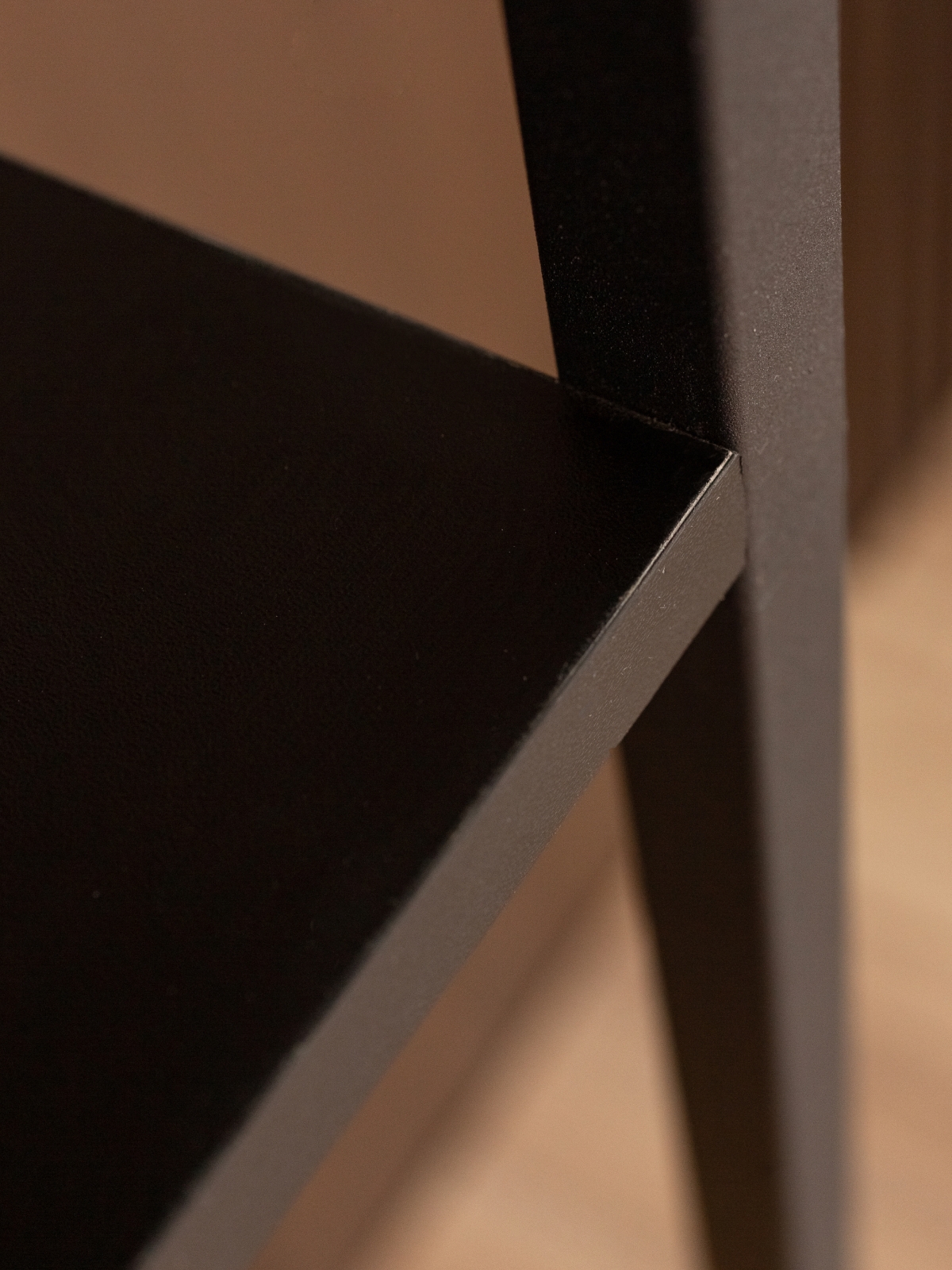 Конструкция стеллажа основана на прочном металлическом каркасе с матовым черным покрытием. Каркас окрашен по технологии полимерно-порошковой покраски, благодаря чему обладает устойчивостью к износу и механическим повреждениям. Поверхность не боится царапин и легко очищается, а само изделие надолго сохраняет безупречный внешний вид даже при активной эксплуатации. Строгая геометрия металлических элементов подчеркивает архитектурный характер конструкции и делает ее визуально легкой несмотря на вместительность и устойчивость.