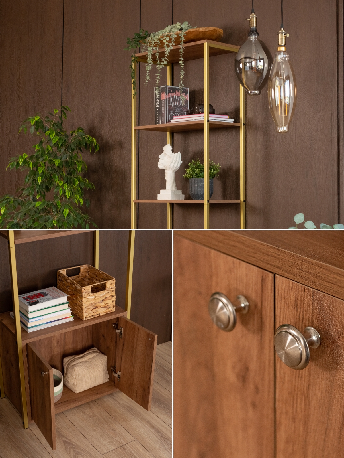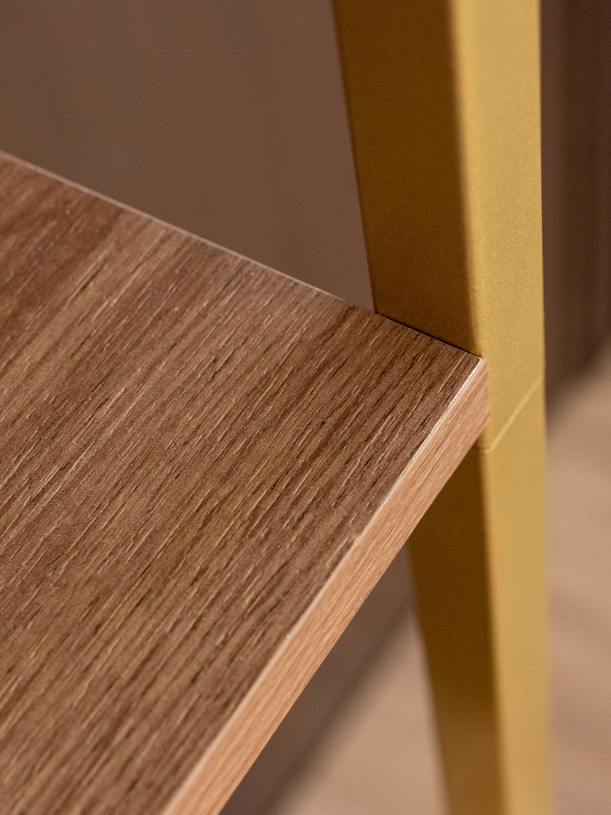 Полки и тумба выполнены из ЛДСП с текстурой, имитирующей натуральное дерево. Такая комбинация придает стеллажу выразительный контраст: тепло дерева уравновешивает металл, добавляя уют и визуальное спокойствие. Оттенок древесины мягкий, благородный — легко сочетается с насыщенными интерьерными палитрами.