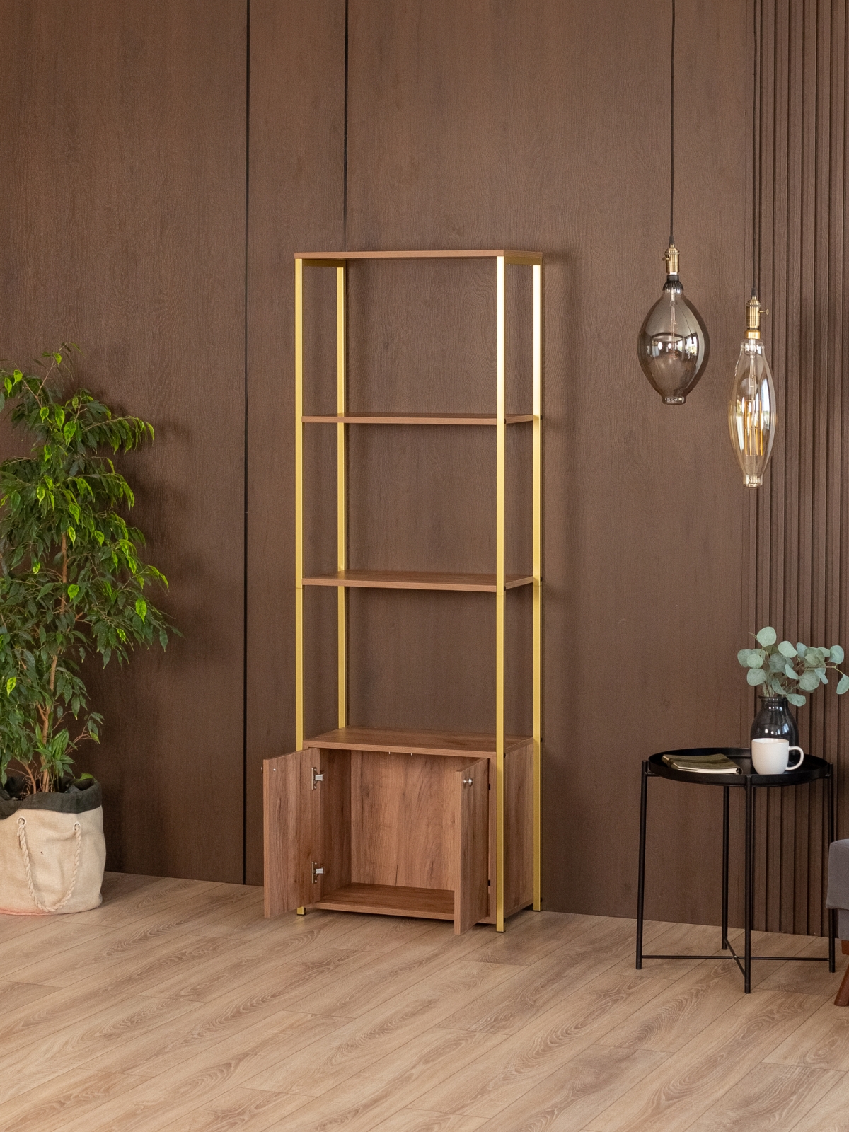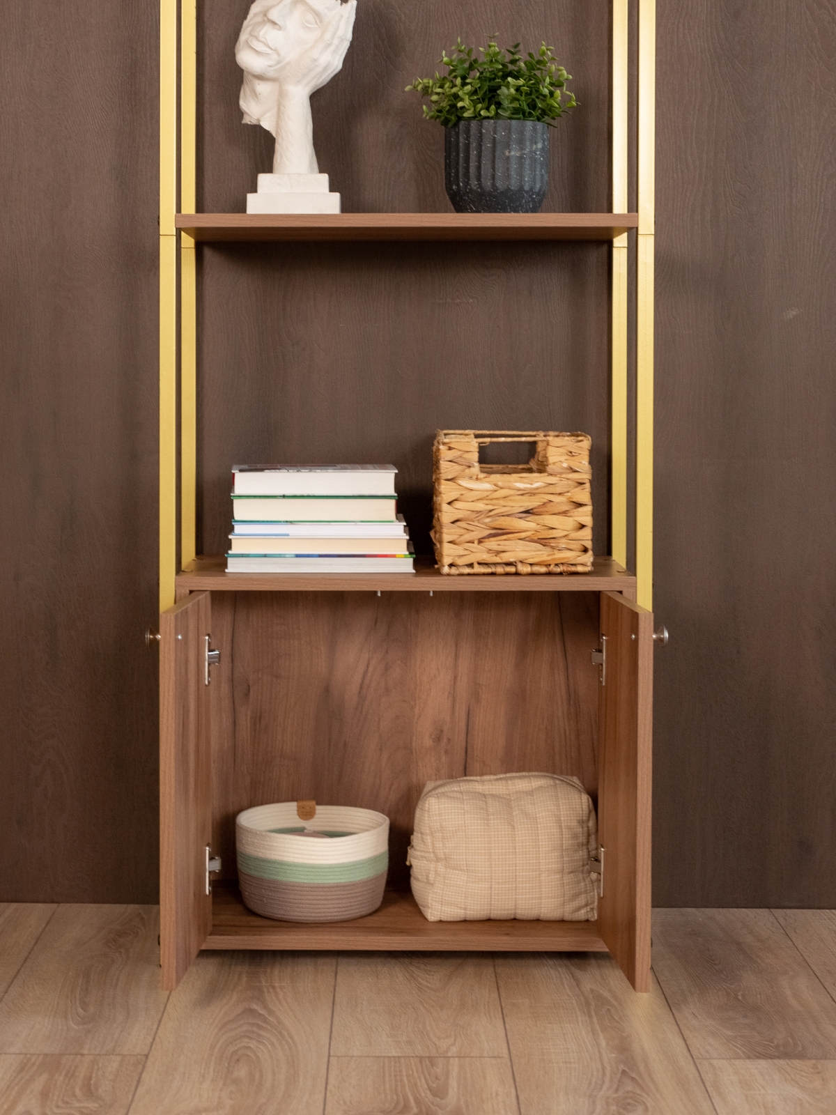 Нижняя тумба с распашными дверцами дополняет образ и делает стеллаж максимально функциональным. Здесь удобно хранить все, что хочется скрыть от глаз — документы, технику или личные вещи. При этом тумба не утяжеляет конструкцию, а наоборот — усиливает ее статусность и завершенность.