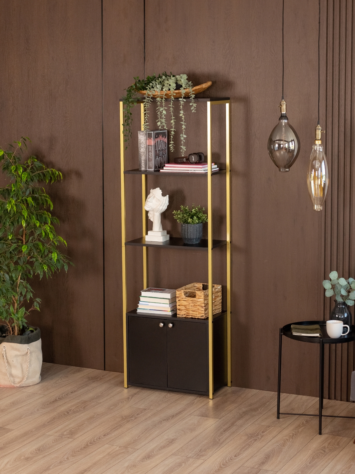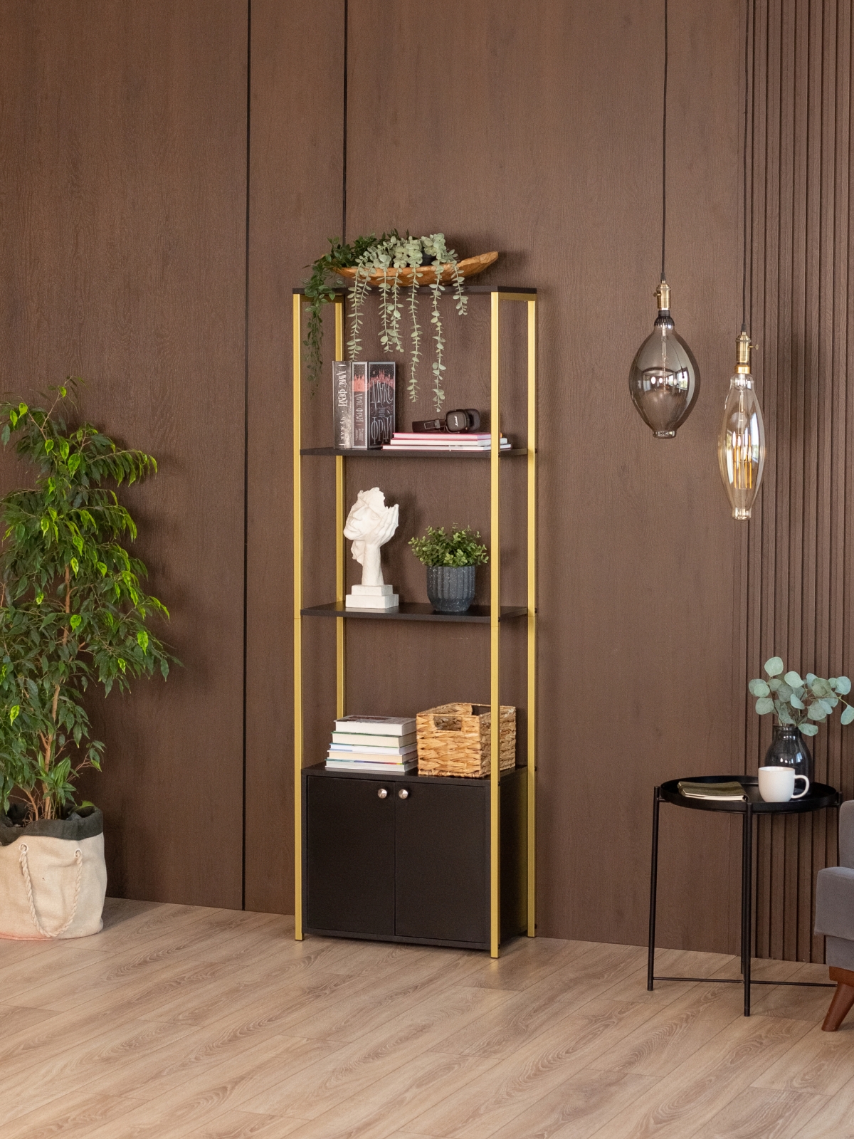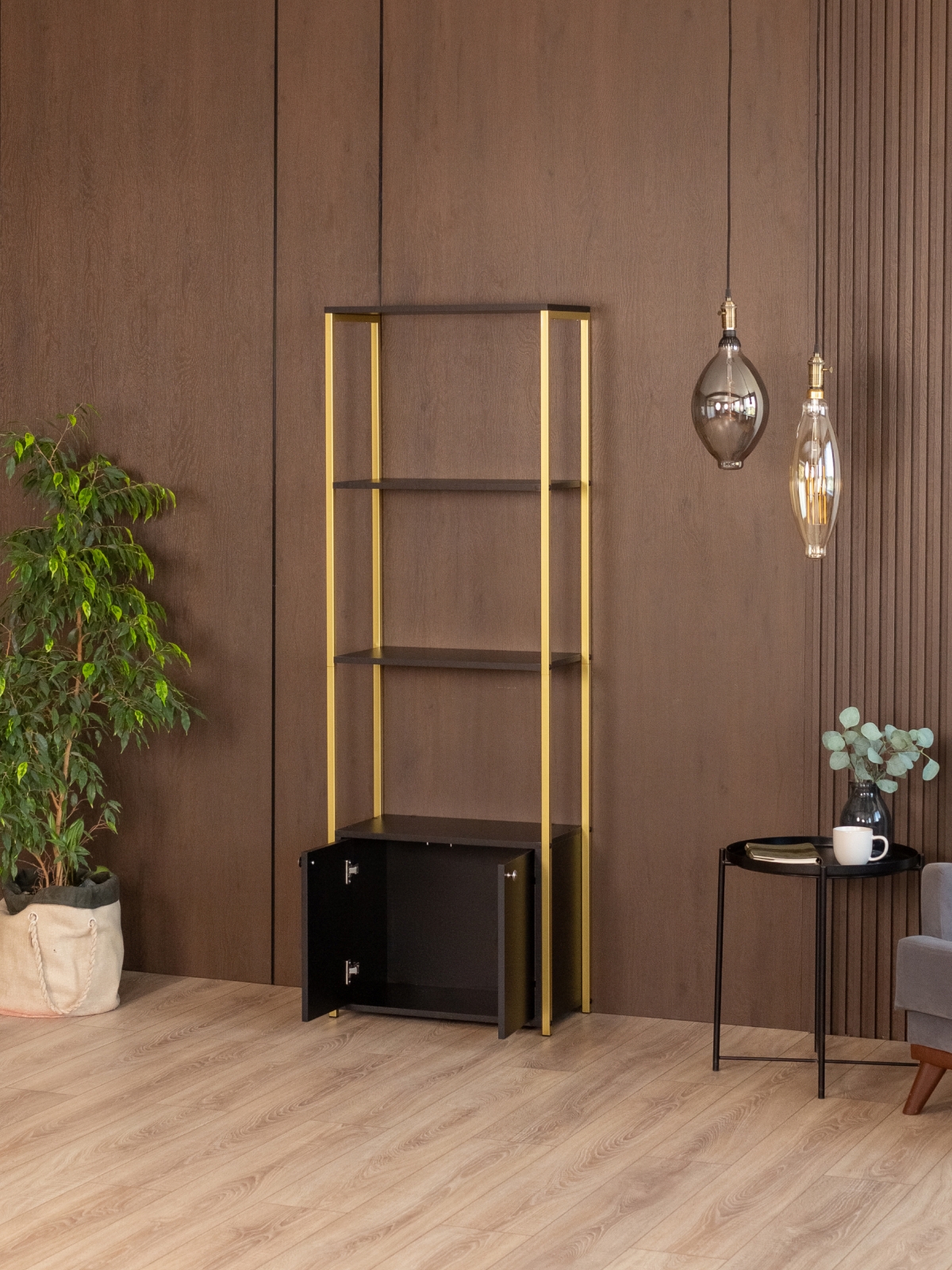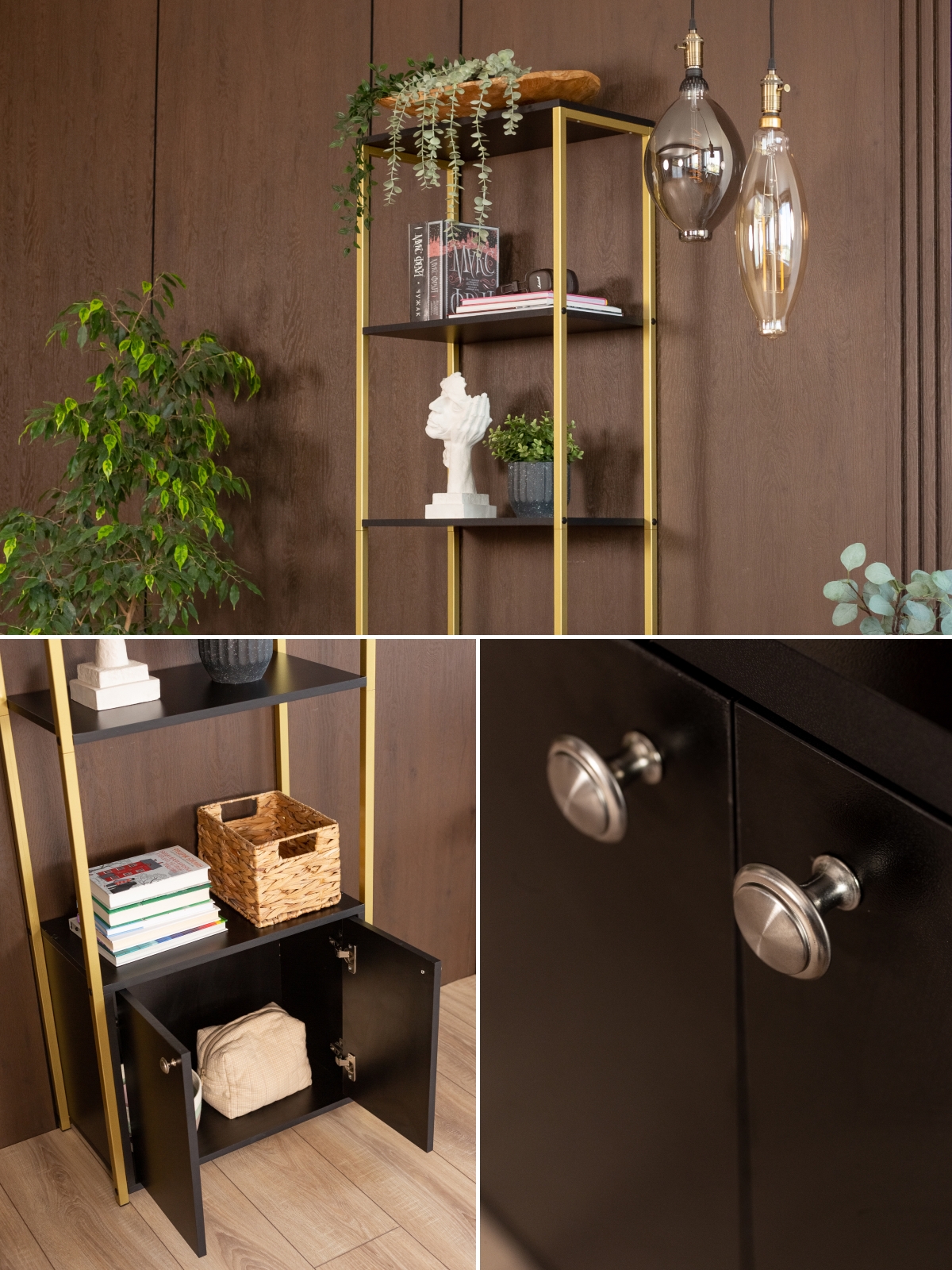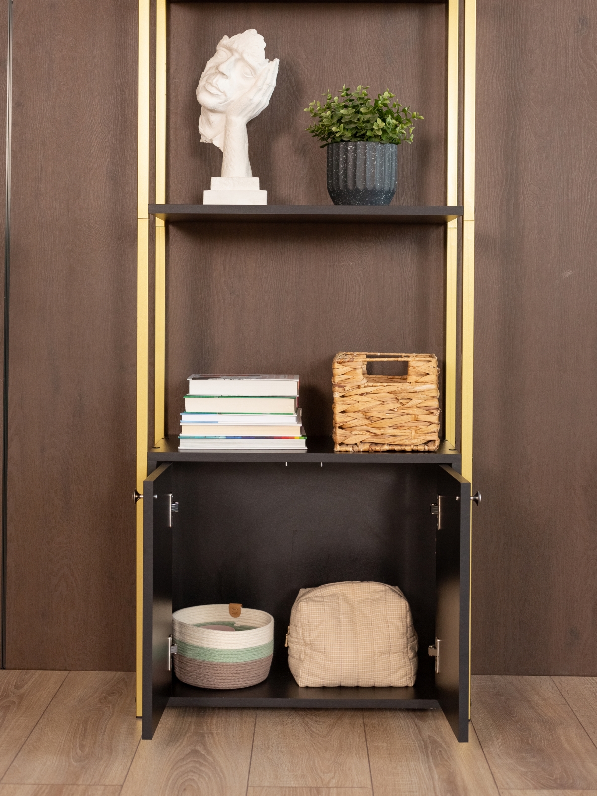 Нижняя тумба с распашными дверцами дополняет образ и делает стеллаж максимально функциональным. Здесь удобно хранить все, что хочется скрыть от глаз — документы, технику или личные вещи. При этом тумба не утяжеляет конструкцию, а наоборот — усиливает ее статусность и завершенность.