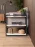 Конструкция с тремя полками из ЛДСП позволяет удобно хранить книги, журналы и мелочи под рукой, создавая порядок в зоне отдыха. Металлический каркас окрашен в черный цвет, что добавляет строгость и элегантность, подчеркивая индустриальный стиль с элементами лофта. Темный каркас гармонично сочетается с кирпичными стенами и насыщенной мебелью, создавая выразительный эффектный контраст.