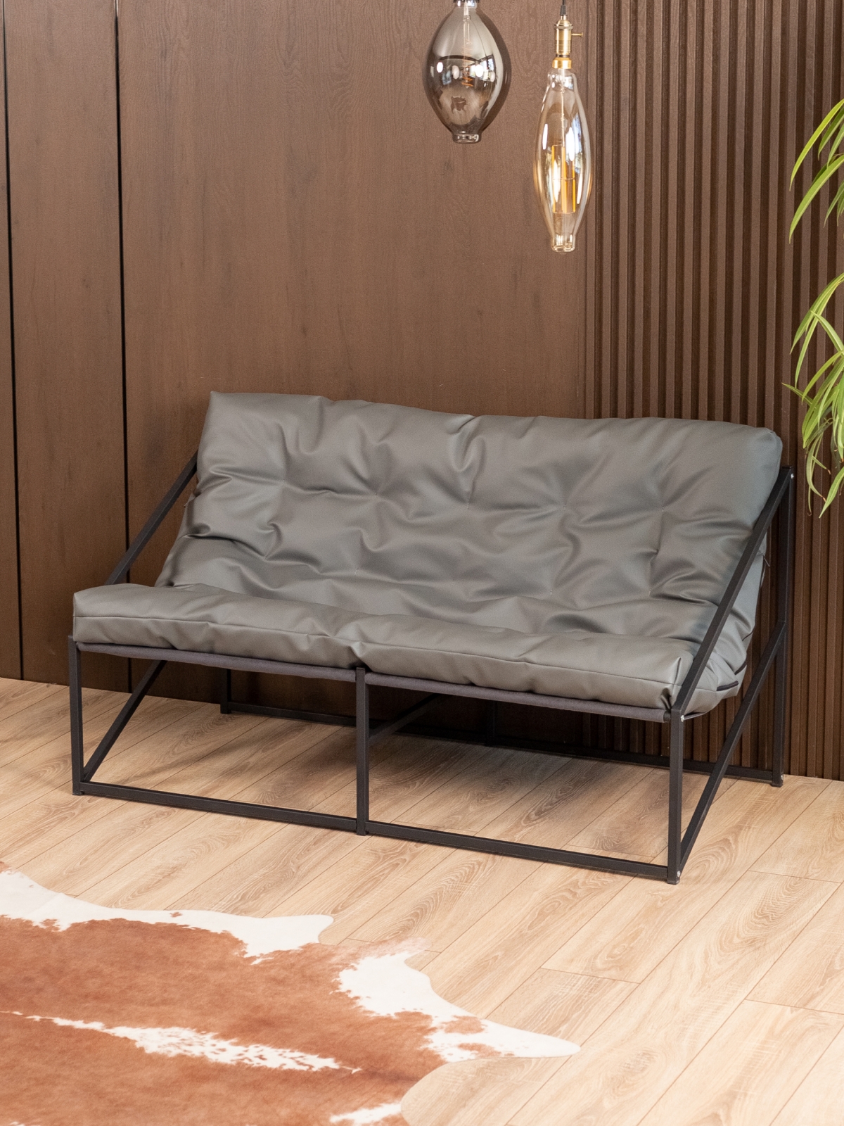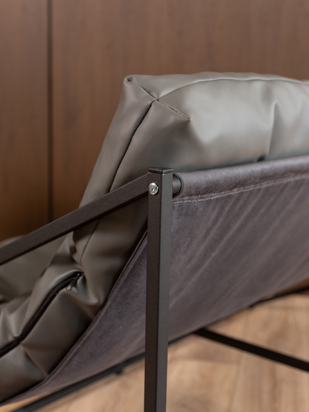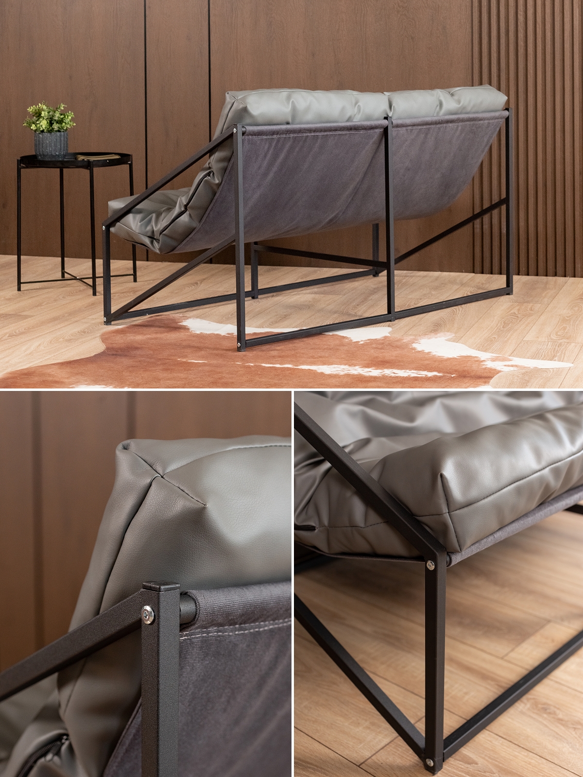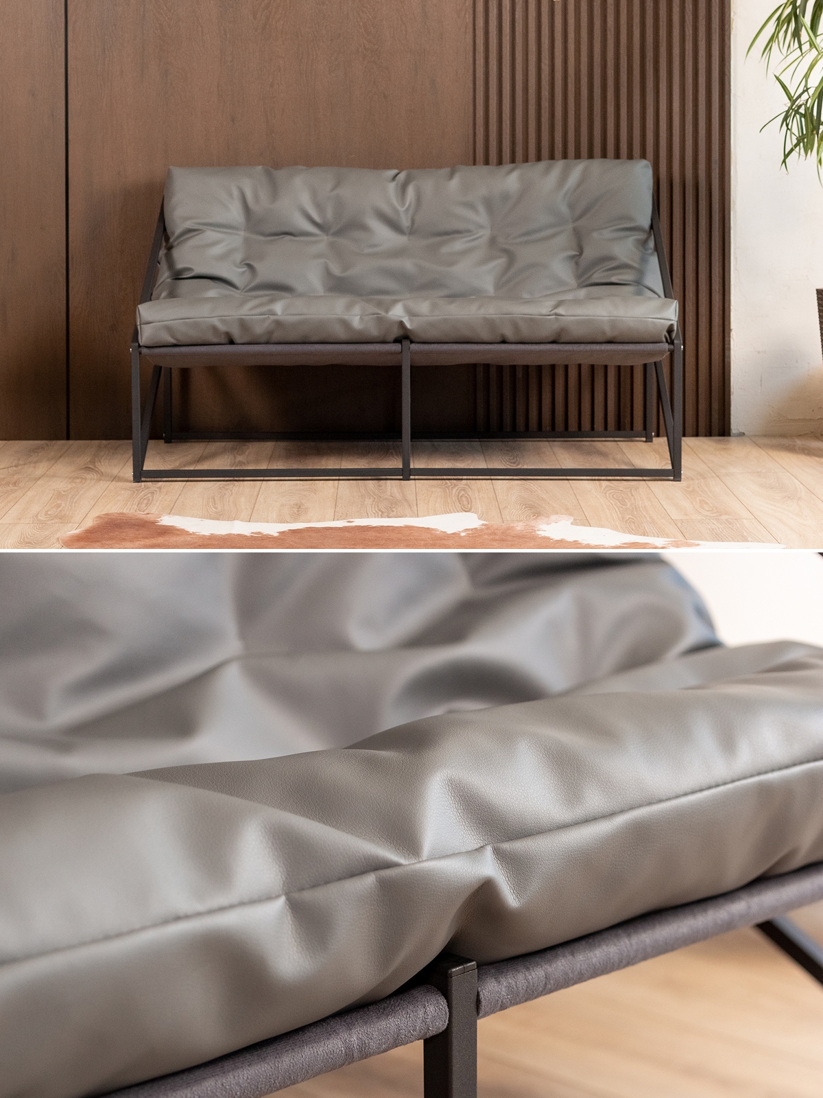 Мягкая подушка обтянута приятным на ощупь велюром, который вносит уют и визуально смягчает строгость металлической основы, или экокожей, по внешнему виду не уступающей натуральному аналогу. В качестве наполнителя используется синтепон — износостойкий материал, сохраняющий форму при ежедневной эксплуатации. Это делает диван не только стильным, но и удобным для отдыха, чтения или непринужденных бесед.