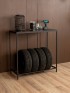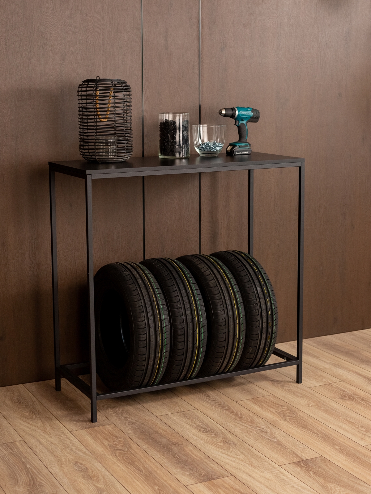 Стеллаж «Аксай» — практичная мебель для размещения колес и в то же время стильный элемент интерьера, выполненный в эстетике современного индустриального дизайна. Его можно разместить в гараже, мастерской или кладовой. Также его можно расположить на балконе или в подсобном помещении. Каркас выполнен из прочного металла и покрыт полимерно-порошковой краской черного цвета. Такое покрытие не только защищает металл от коррозии и мелких повреждений, но и обеспечивает эстетичный внешний вид — без потеков и других визуальных дефектов. Лаконичный черный каркас — это классика стиля лофт: строгость линий, выразительность и отсутствие лишних деталей. Сварная конструкция придает стеллажу дополнительную устойчивость, исключая шаткость и перекосы. Общая допустимая нагрузка до 80 кг позволяет хранить комплект из четырех автомобильных шин в вертикальном положении — без риска деформации или потери формы. Верхняя часть стеллажа представлена удобной столешницей из ЛДСП, которая может использоваться как рабочая поверхность или как дополнительное место для хранения аксессуаров и инструментов. Однако на этом функциональность «Аксая» не заканчивается. Благодаря своей конструкции и стильному внешнему виду он с легкостью выходит за рамки мебели, предназначенной исключительно для хранения шин. Стеллаж можно адаптировать под интерьерное решение — использовать как консольный столик в прихожей, на балконе или даже в гостиной. Это универсальное решение — как для размещения шин, так и для оформления пространства с характером. Стеллаж подчеркнет интерьер с темной мебелью, дополнит мастерскую с акцентом на металл и дерево, идеально встанет на фоне графитовых стен или индустриальных деталей. На ножках предусмотрены пластиковые заглушки, которые защищают напольное покрытие от повреждений. Это особенно важно при установке на плитку, ламинат или бетон — вы можете быть уверены, что при перемещении или установке мебель не оставит следов.