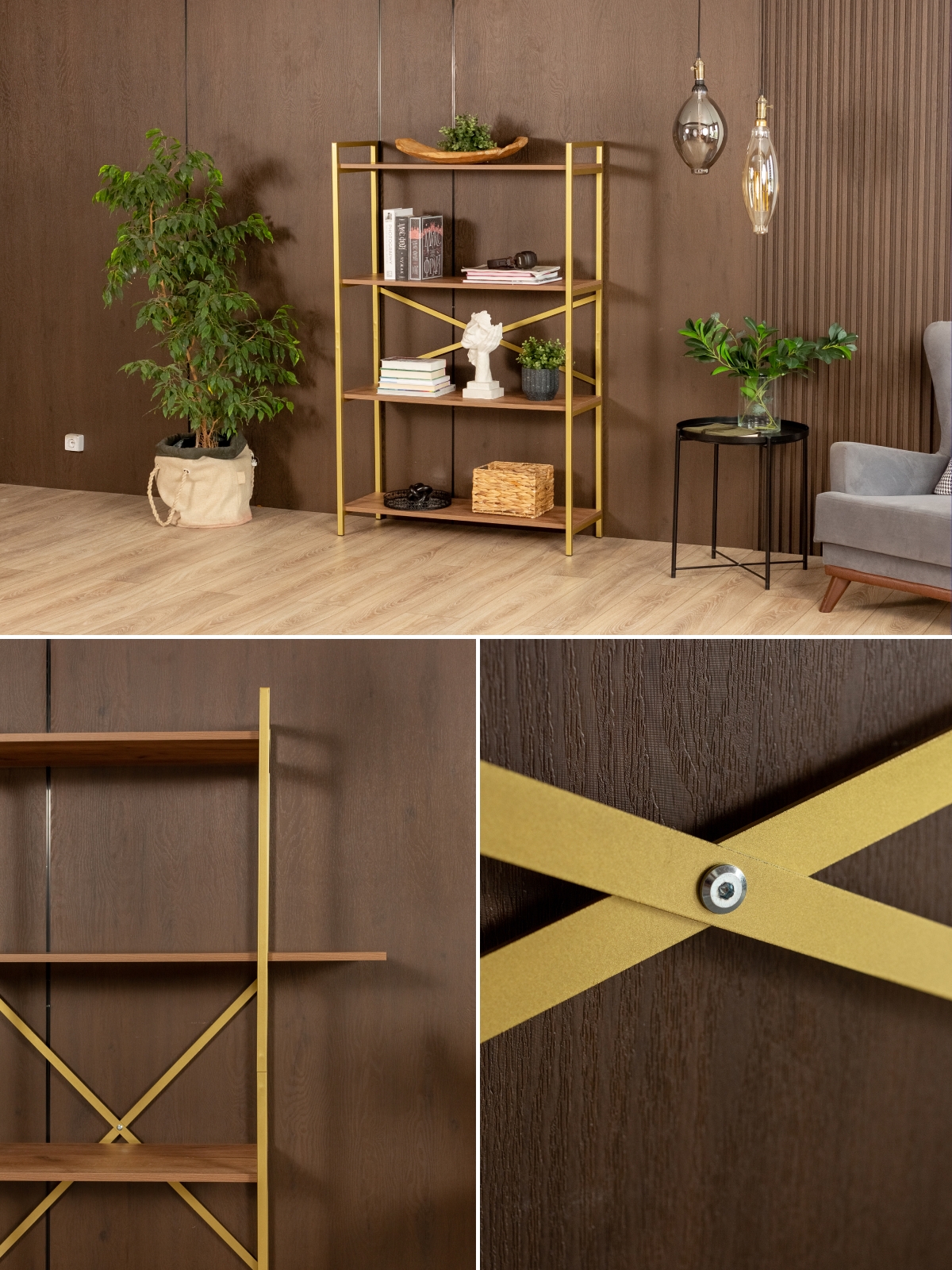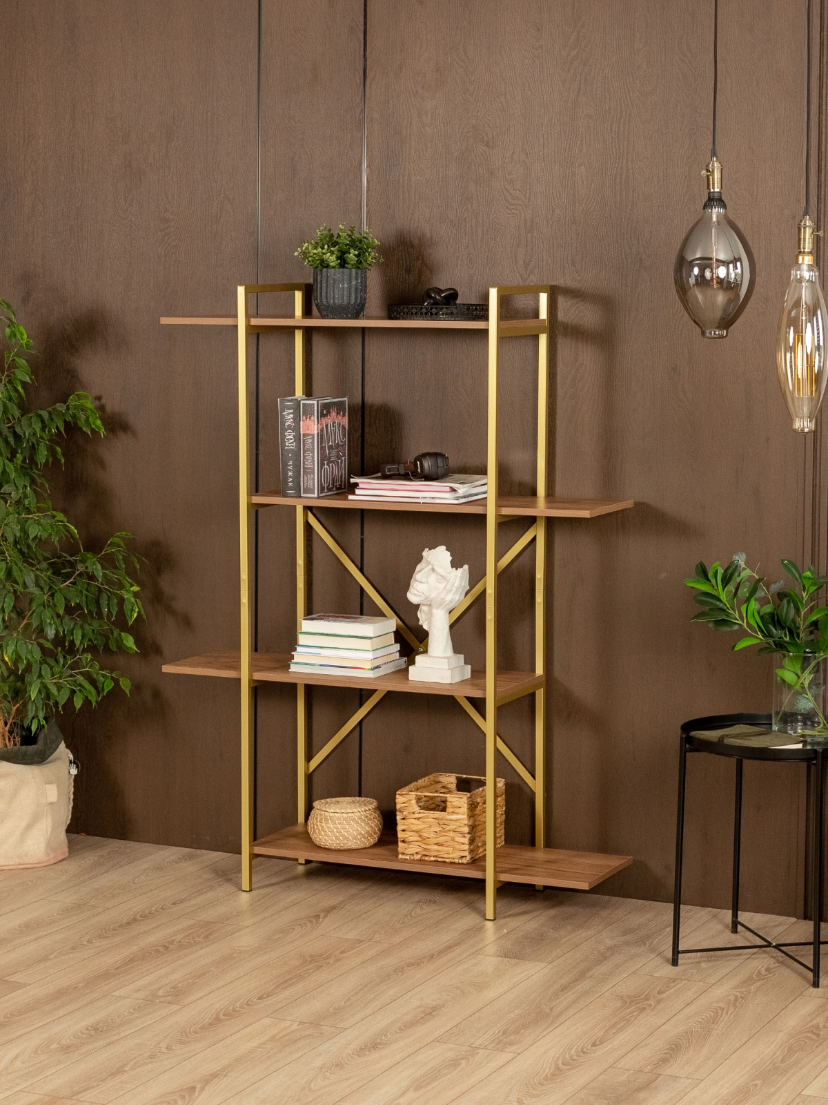 Золотой каркас и естественная палитра полок делают напольный металлический стеллаж с полками «Катунь» особенно универсальным в интерьере. Он органично впишется в пространство в стиле глэм-лофт, ар-деко или современный эклектичный интерьер. В сочетании с бархатной обивкой, мраморными или стеклянными элементами напольная полка-стеллаж усиливает эффект роскоши. В более нейтральной обстановке — например, с пастельными стенами и деревянной мебелью — он становится стильным акцентом, добавляющим объем и ритм.