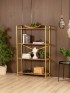 Каркас стеллажа для хранения изготовлен из металла и окрашен прочной полимерно-порошковой краской в золотой цвет. Благодаря крестовине конструкция остается устойчивой и надежной даже при максимальной нагрузке. Полки выполнены из ЛДСП с текстурой натурального дерева — материал легко выдерживает ежедневное использование, а визуально напоминает благородный шпон. На ножках металлического стеллажа с полками для кухни — пластиковые заглушки, защищающие напольное покрытие от царапин.