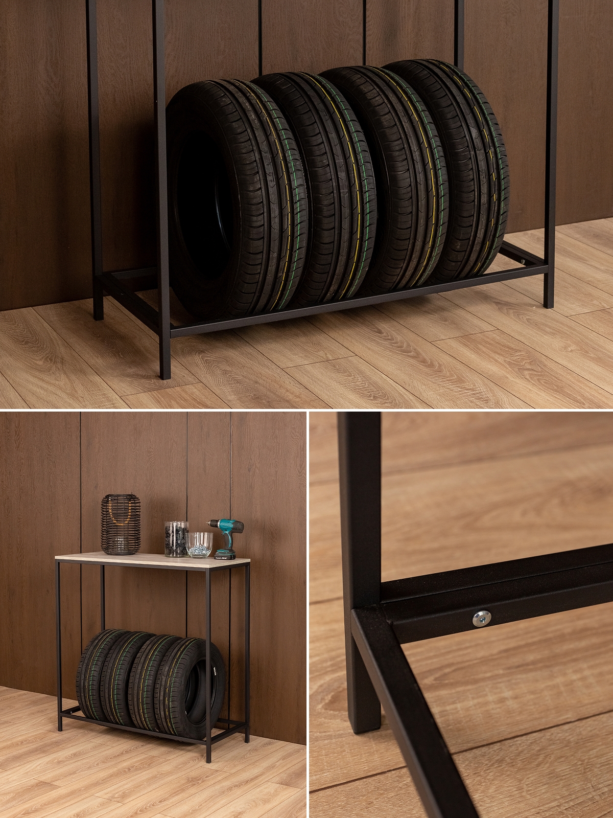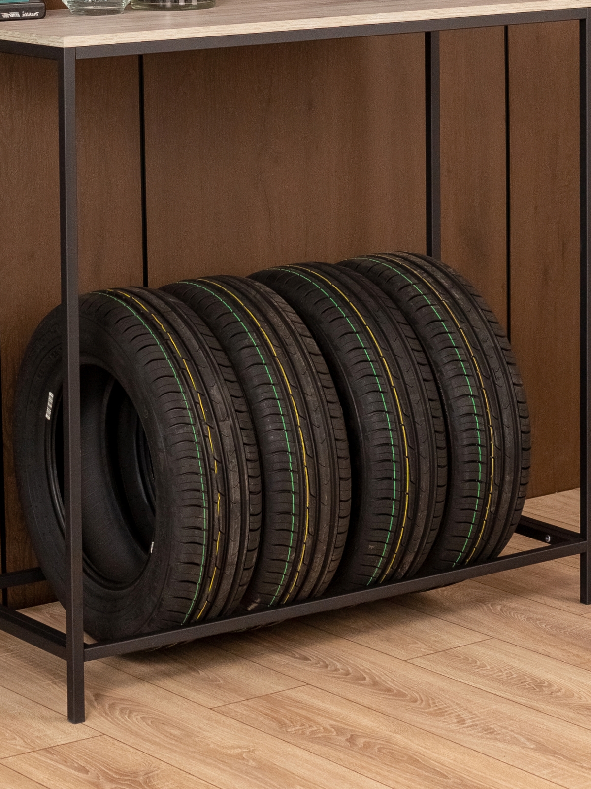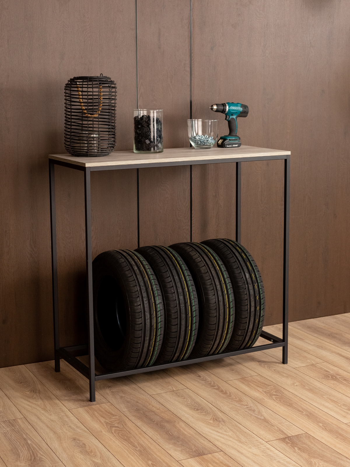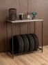 Стеллаж «Аксай» — практичная мебель для размещения колес и в то же время стильный элемент интерьера, выполненный в эстетике современного индустриального дизайна. Его можно разместить в гараже, мастерской или кладовой. Также его можно расположить на балконе или в подсобном помещении. Каркас выполнен из прочного металла и покрыт полимерно-порошковой краской черного цвета. Такое покрытие не только защищает металл от коррозии и мелких повреждений, но и обеспечивает эстетичный внешний вид — без потеков и других визуальных дефектов. Лаконичный черный каркас — это классика стиля лофт: строгость линий, выразительность и отсутствие лишних деталей. Сварная конструкция придает стеллажу дополнительную устойчивость, исключая шаткость и перекосы. Общая допустимая нагрузка до 80 кг позволяет хранить комплект из четырех автомобильных шин в вертикальном положении — без риска деформации или потери формы. Верхняя часть стеллажа представлена удобной столешницей из ЛДСП, которая может использоваться как рабочая поверхность или как дополнительное место для хранения аксессуаров и инструментов. Однако на этом функциональность «Аксая» не заканчивается. Благодаря своей конструкции и стильному внешнему виду он с легкостью выходит за рамки мебели, предназначенной исключительно для хранения шин. Стеллаж можно адаптировать под интерьерное решение — использовать как консольный столик в прихожей, на балконе или даже в гостиной. Это универсальное решение — как для размещения шин, так и для оформления пространства с характером. Стеллаж подчеркнет интерьер с темной мебелью, дополнит мастерскую с акцентом на металл и дерево, идеально встанет на фоне графитовых стен или индустриальных деталей. На ножках предусмотрены пластиковые заглушки, которые защищают напольное покрытие от повреждений. Это особенно важно при установке на плитку, ламинат или бетон — вы можете быть уверены, что при перемещении или установке мебель не оставит следов.