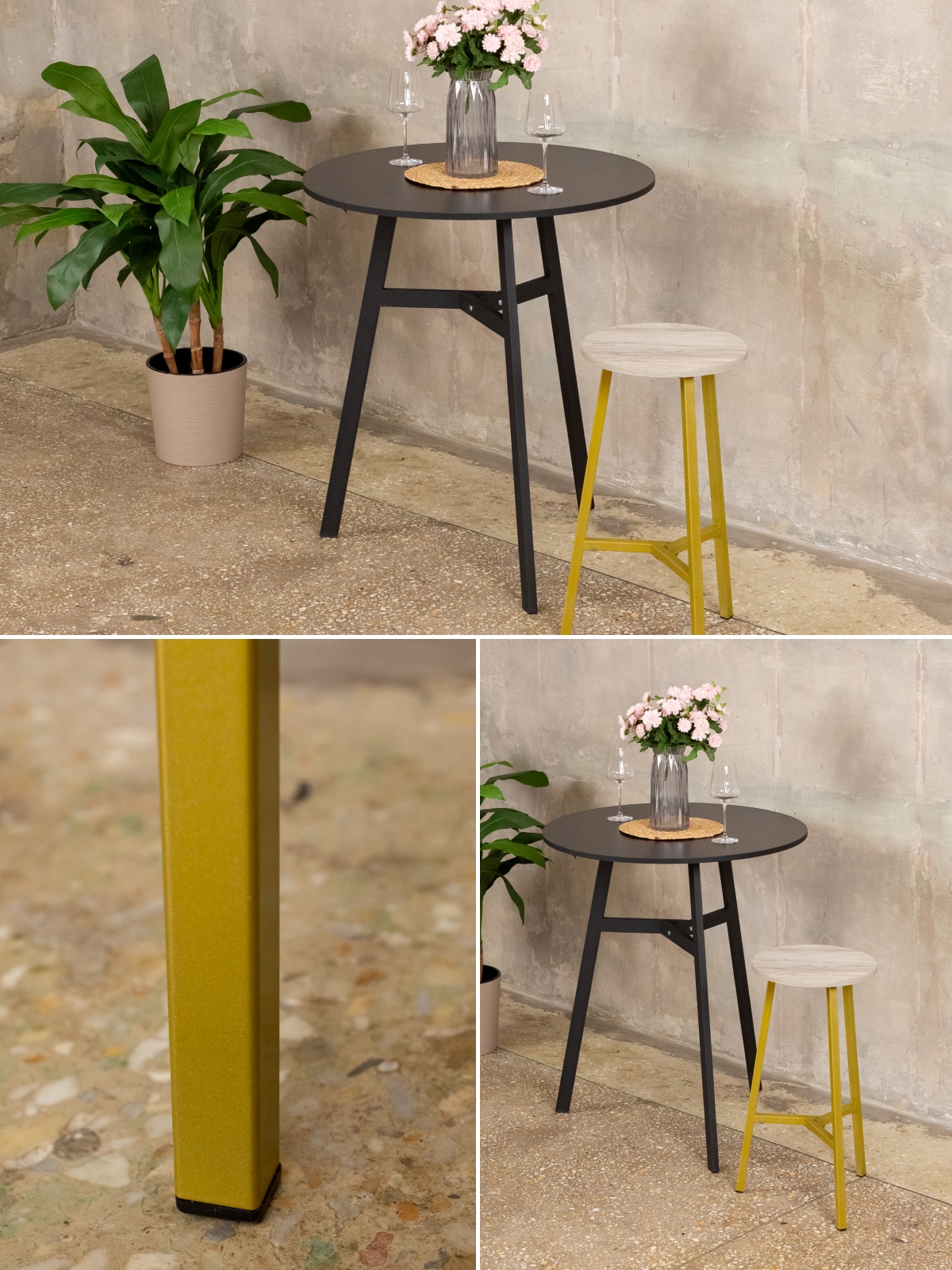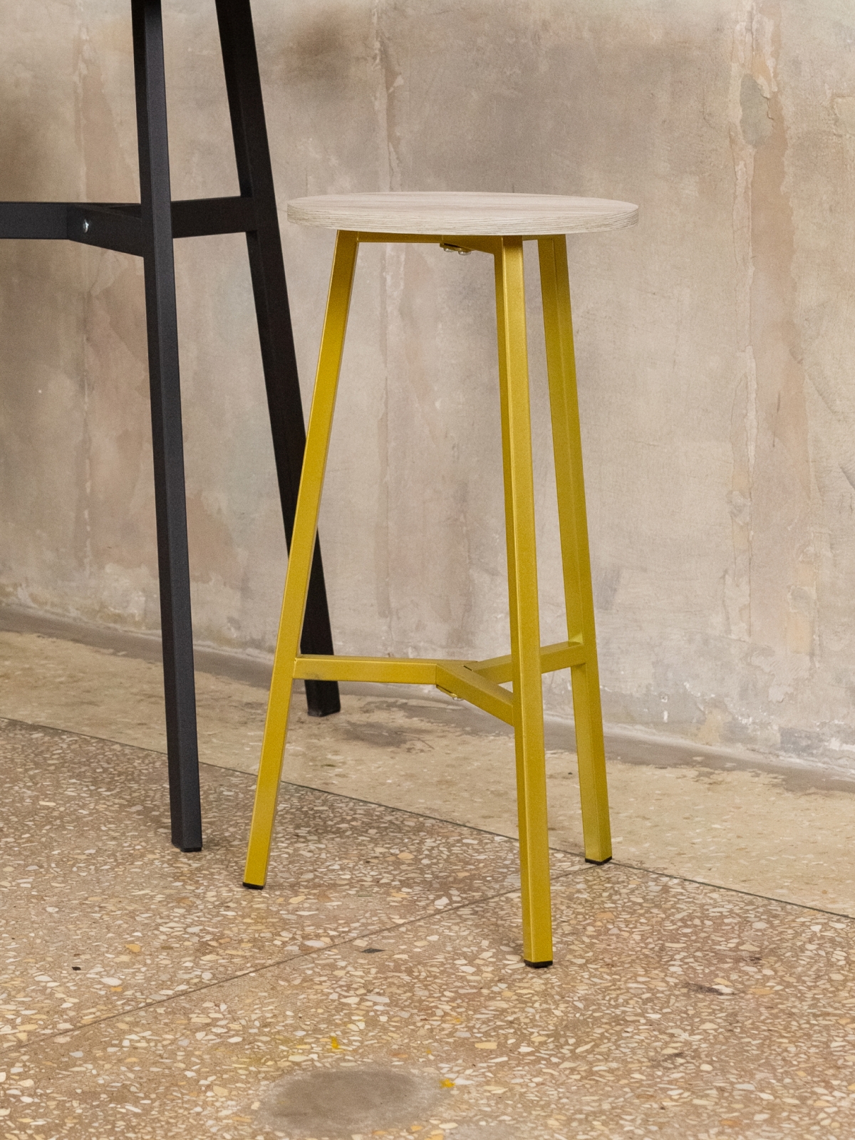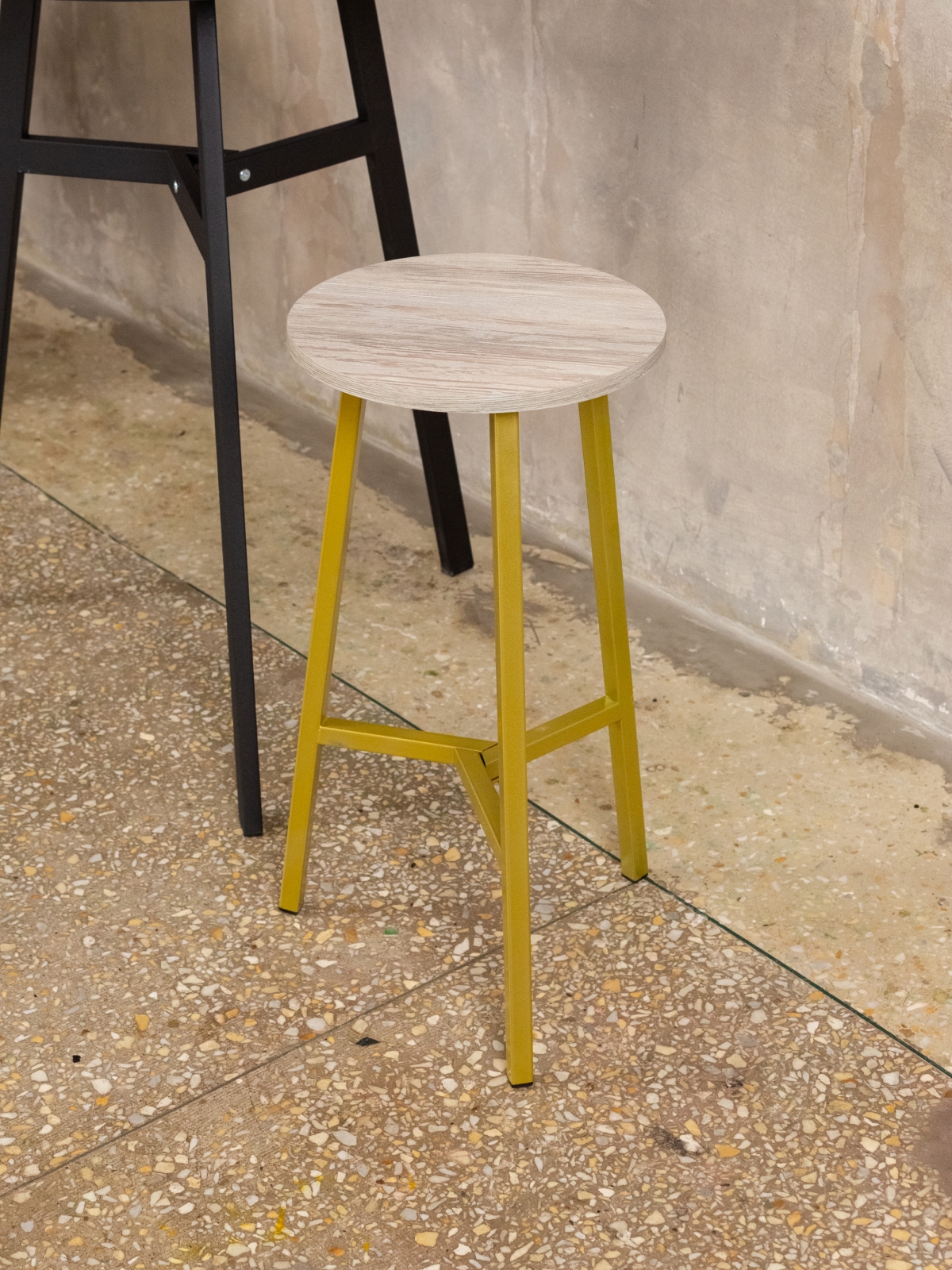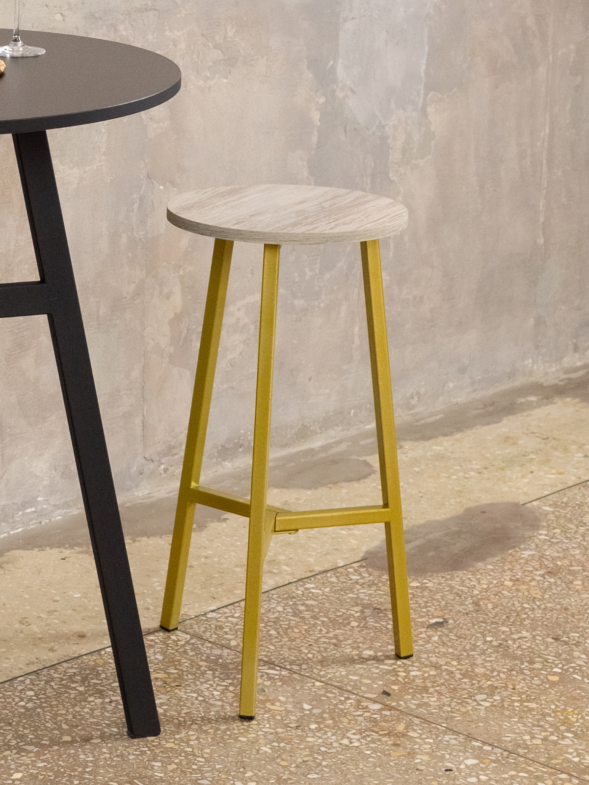 Сиденье изготовлено из ламинированной древесно-стружечной плиты. Универсальный оттенок древесины добавляет композиции уюта и текстурности, уравновешивая сияние металла и создавая тонкий контраст. Благодаря этому полубарный табурет «Эна» органично вписывается в интерьеры, где важен баланс между индустриальной геометрией и природными материалами.