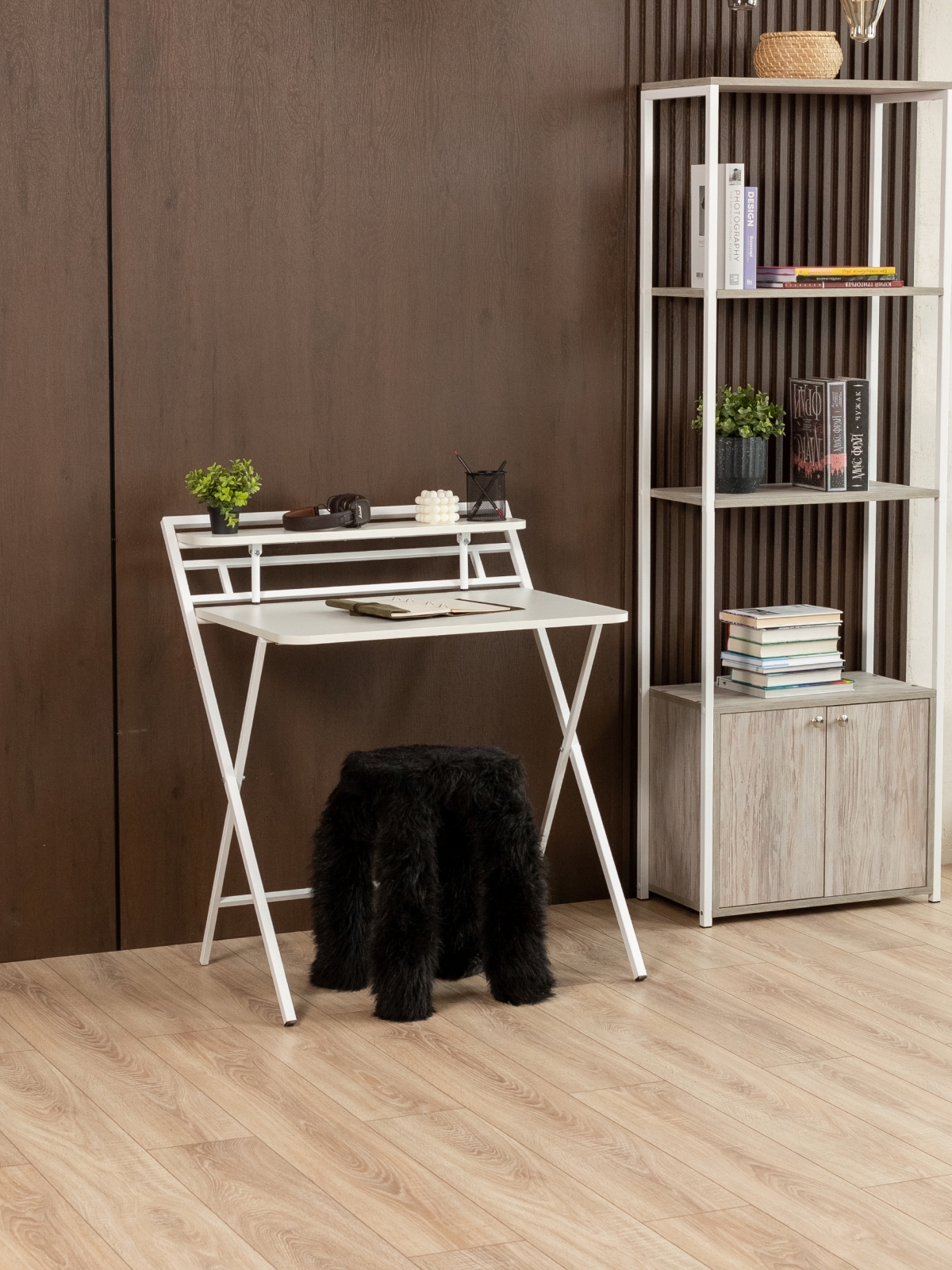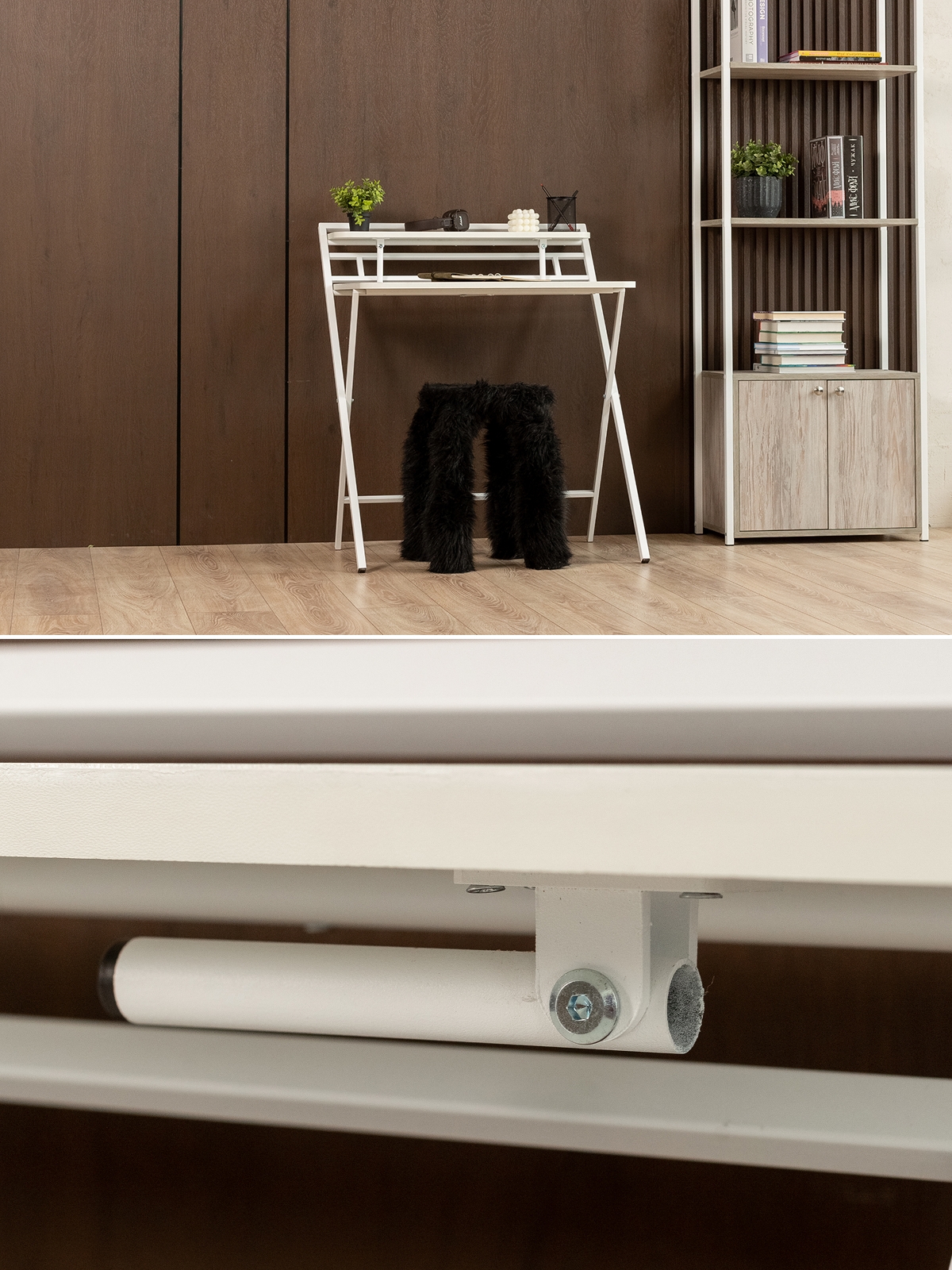 Столешница выполнена из ЛДСП толщиной 16 мм — это практичный материал, устойчивый к повседневным нагрузкам. Поверхность письменного стола-трансформера имитирует текстуру натурального дерева, благодаря чему рабочая поверхность смотрится естественно и уютно, создавая баланс между современным минимализмом и природной фактурой. Белый металлический каркас из профильной трубы подчеркивает прямые линии и аккуратность силуэта, придавая конструкции прочность и долговечность. Такой контраст дерева и металла — характерный прием стиля лофт, который позволяет мебели выглядеть современно и в то же время по-домашнему уютно.