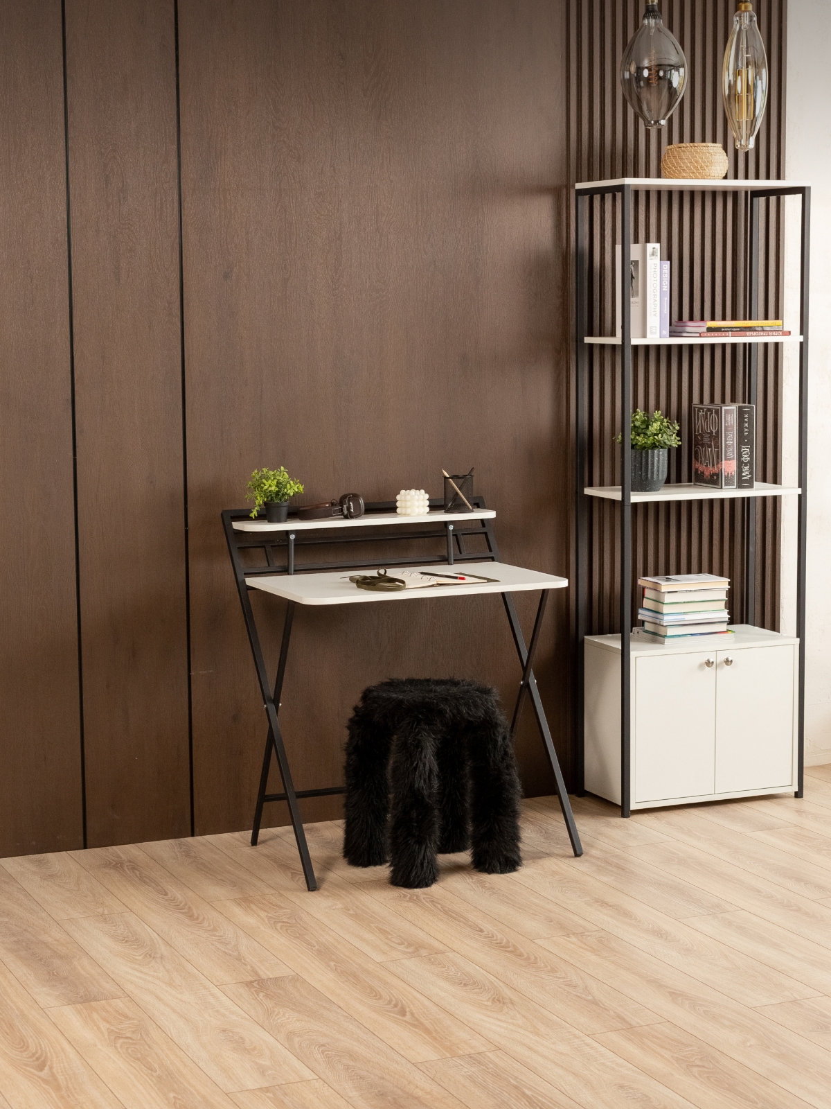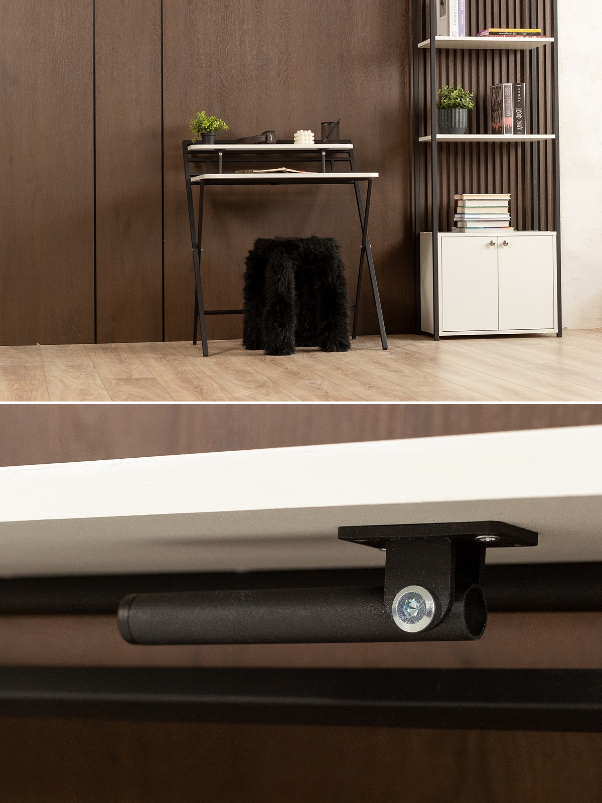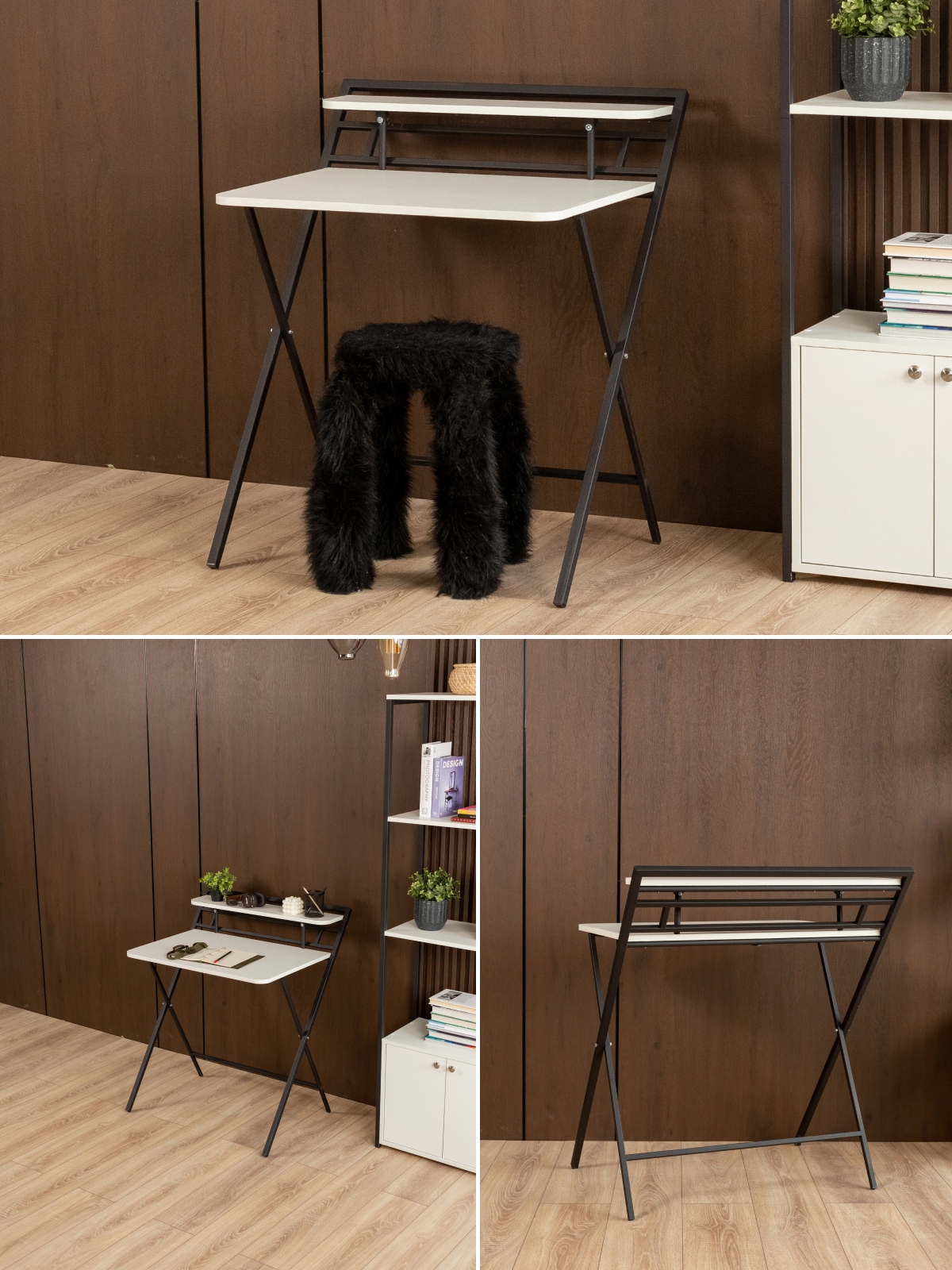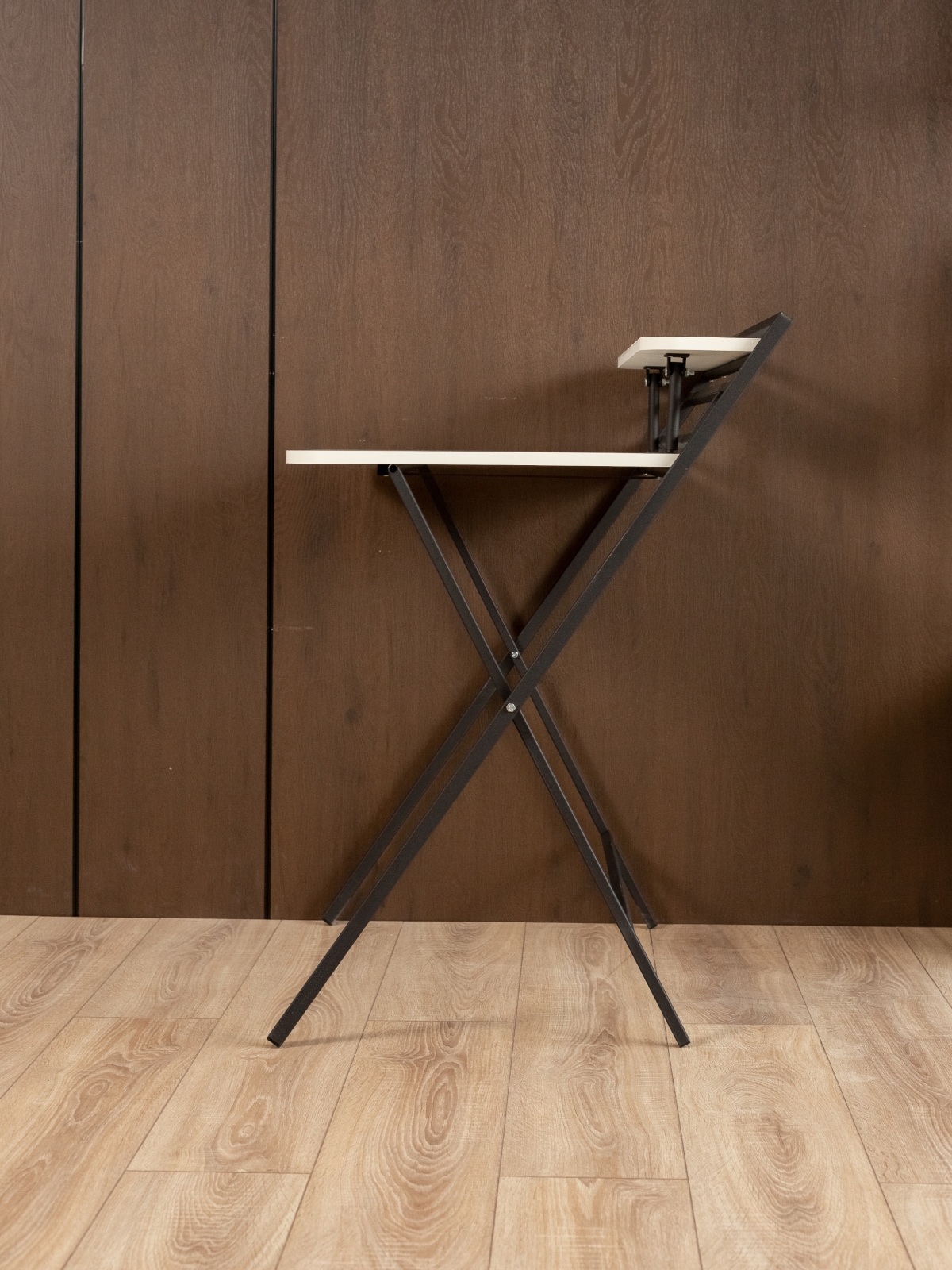 Особое внимание заслуживает продуманная конструкция, которая делает стол в спальню не просто предметом мебели, а умным решением для динамичного образа жизни. Складная система позволяет мгновенно трансформировать изделие: раскройте его за пару секунд, чтобы организовать рабочую зону, и так же легко сложите, когда он не нужен. В конструкции раскладного письменного стола предусмотрена полка. Такую деталь особенно оценят школьники, студенты и те, кто работает из дома.