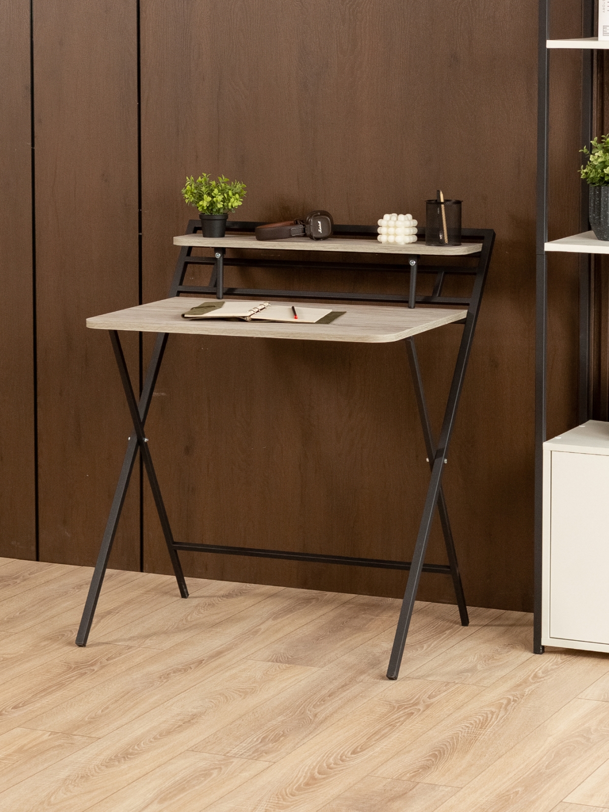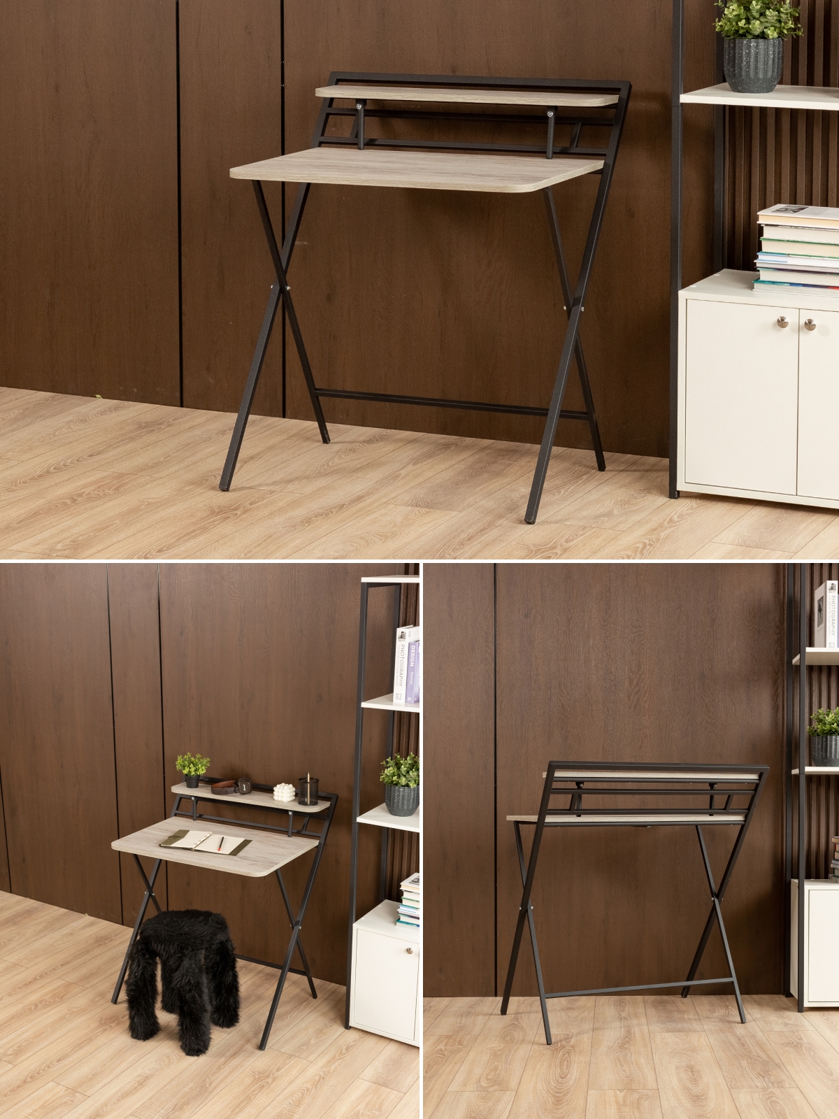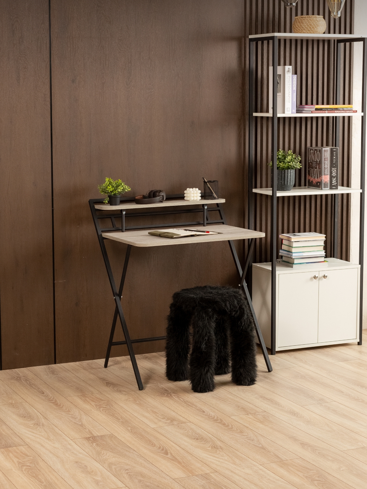 Дизайн складного письменного стола вдохновлен индустриальной эстетикой: грубоватые текстуры, металлические акценты и минималистичные формы. Черный каркас контрастирует с теплыми оттенками дерева, бетонными поверхностями или кирпичной кладкой, создавая эффектный визуальный дисбаланс, который так ценится в современных интерьерах. Представьте, как компьютерный стол в стиле лофт гармонично вписывается в квартиру с открытыми балками и голыми кирпичными стенами. В скандинавском интерьере с белыми стенами и светлым паркетом раскладной стол для дома станет смелым акцентом, а в минималистичной обстановке — функциональным элементом без излишеств. Если вы предпочитаете яркие акценты, добавьте к композиции элементы в бордовых, изумрудных или золотистых цветах — черный каркас подчеркнет их насыщенность, не перебивая общую гармонию.