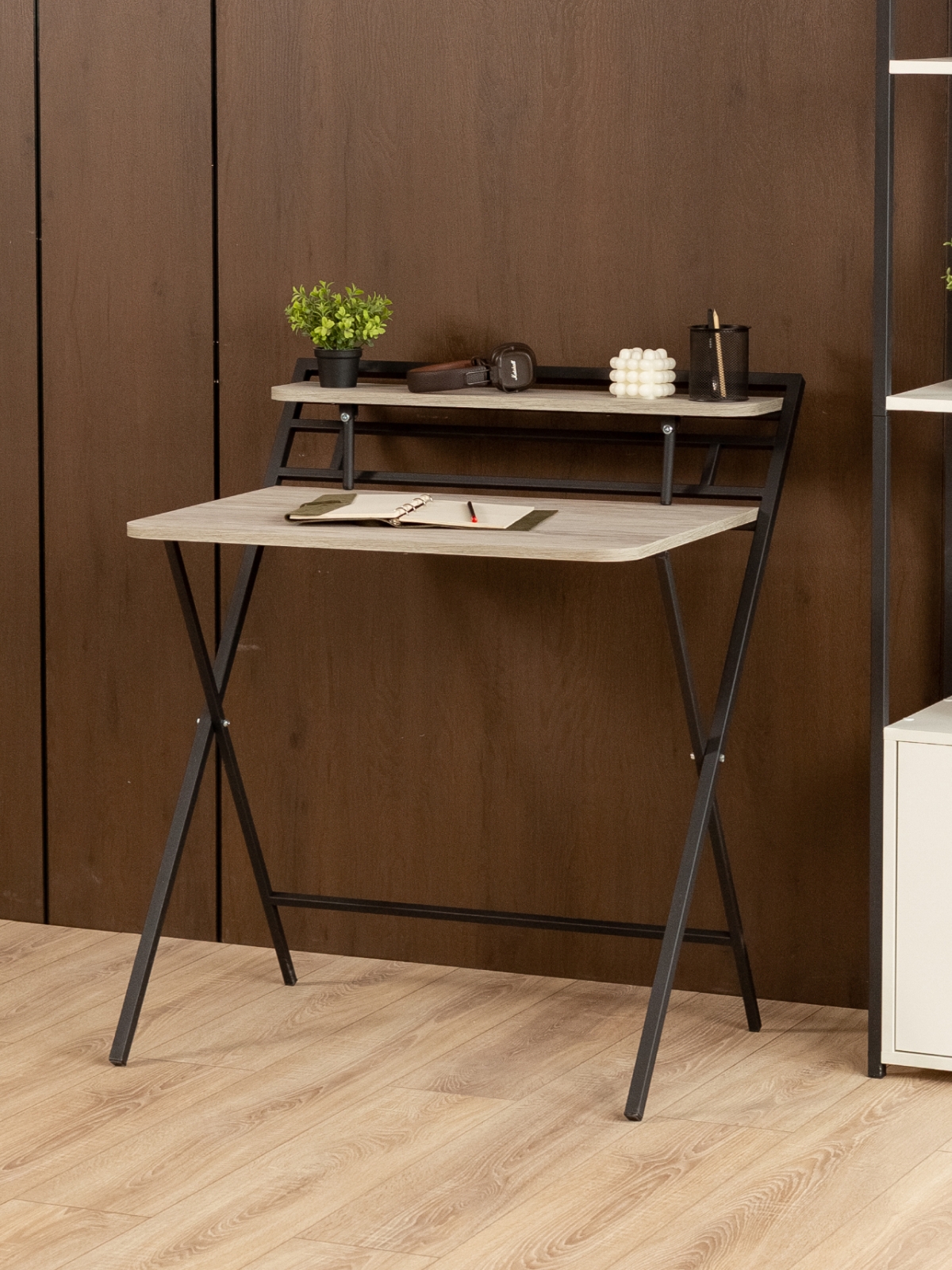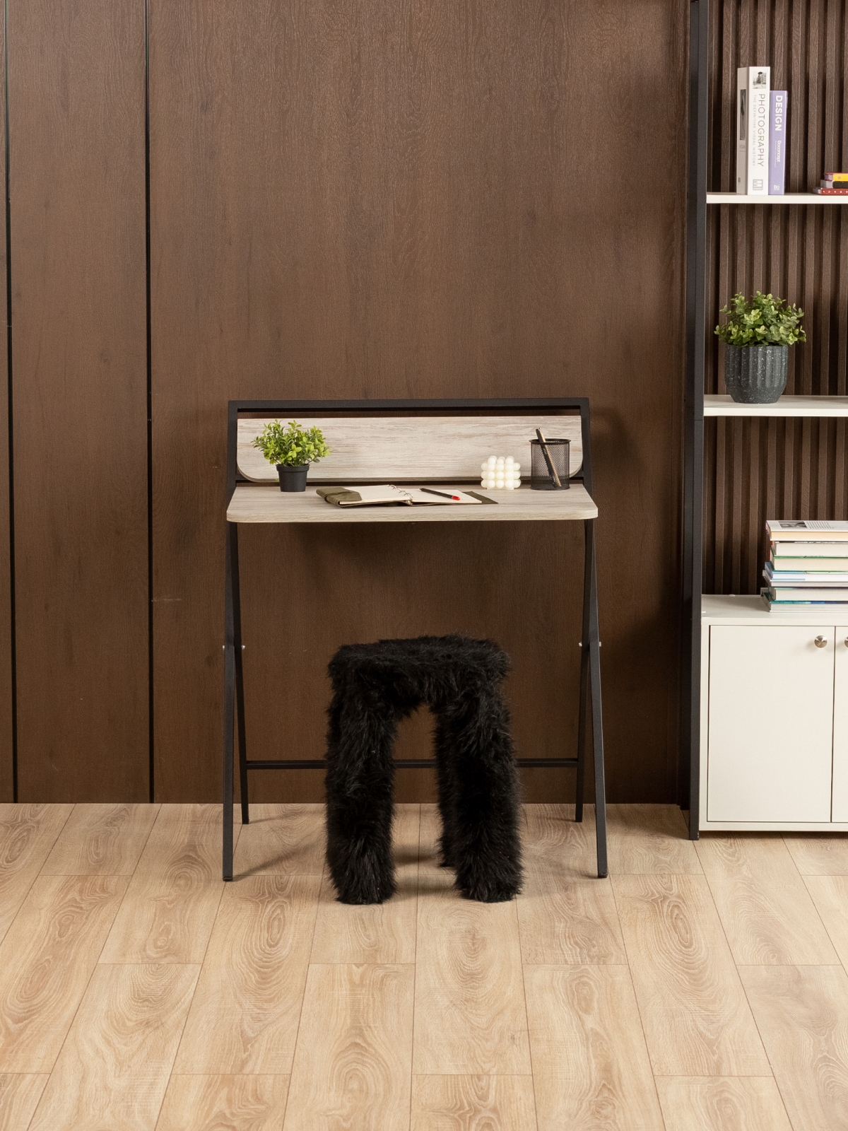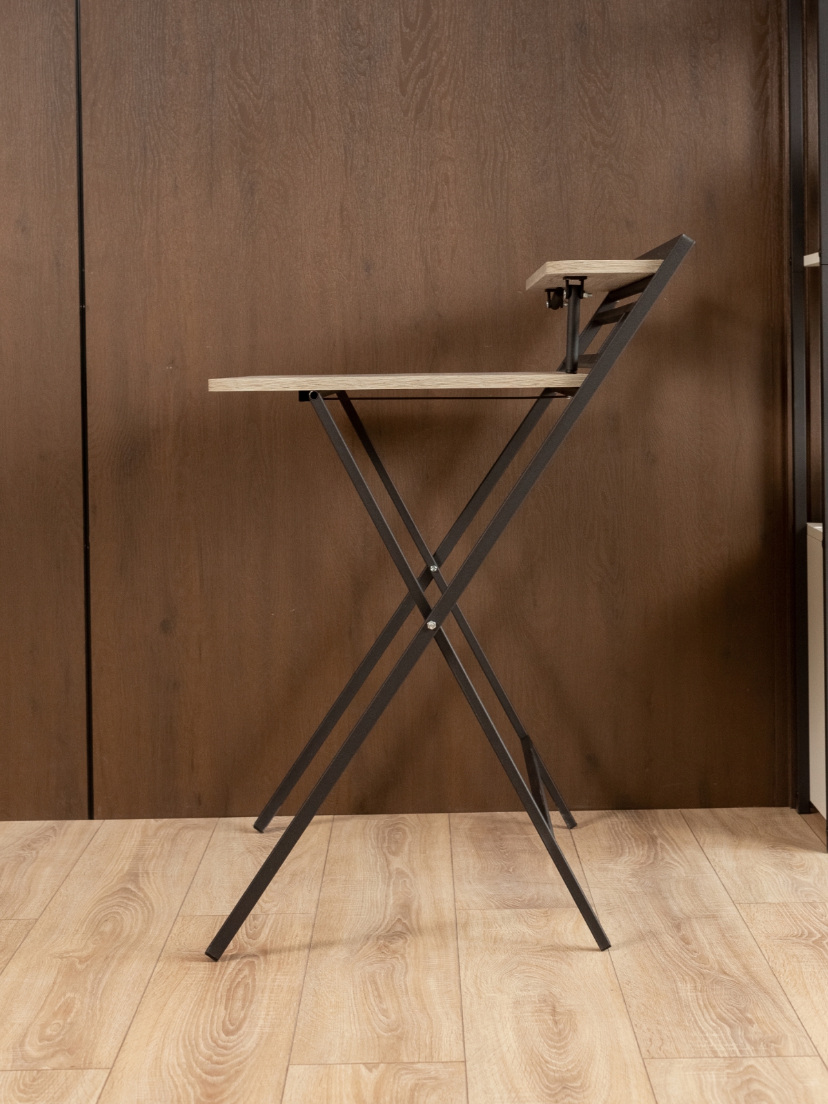 Дизайн складного письменного стола вдохновлен индустриальной эстетикой: грубоватые текстуры, металлические акценты и минималистичные формы. Черный каркас контрастирует с теплыми оттенками дерева, бетонными поверхностями или кирпичной кладкой, создавая эффектный визуальный дисбаланс, который так ценится в современных интерьерах. Представьте, как компьютерный стол в стиле лофт гармонично вписывается в квартиру с открытыми балками и голыми кирпичными стенами. В скандинавском интерьере с белыми стенами и светлым паркетом раскладной стол для дома станет смелым акцентом, а в минималистичной обстановке — функциональным элементом без излишеств. Если вы предпочитаете яркие акценты, добавьте к композиции элементы в бордовых, изумрудных или золотистых цветах — черный каркас подчеркнет их насыщенность, не перебивая общую гармонию.
