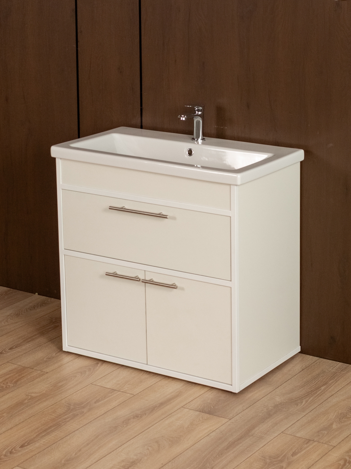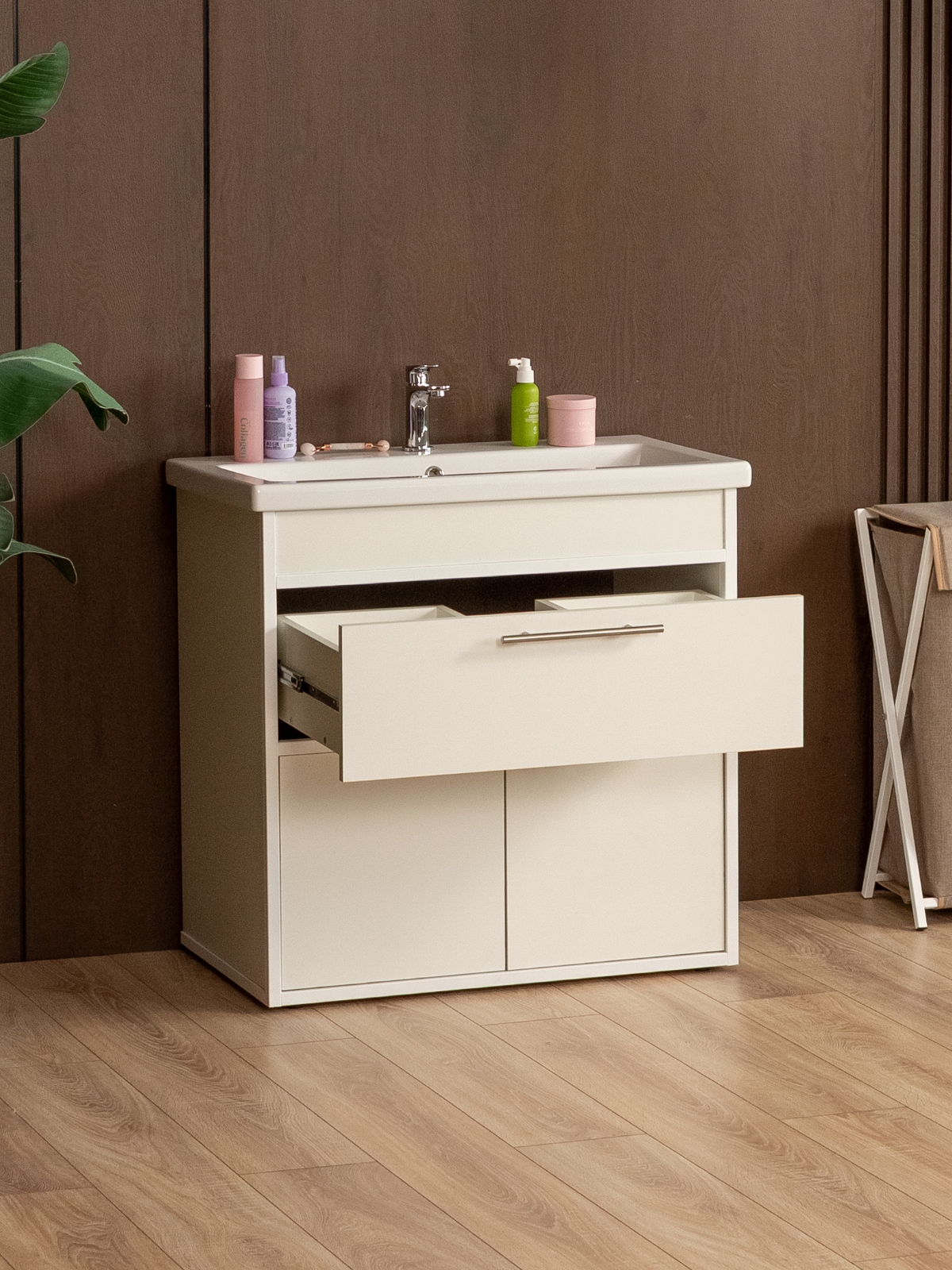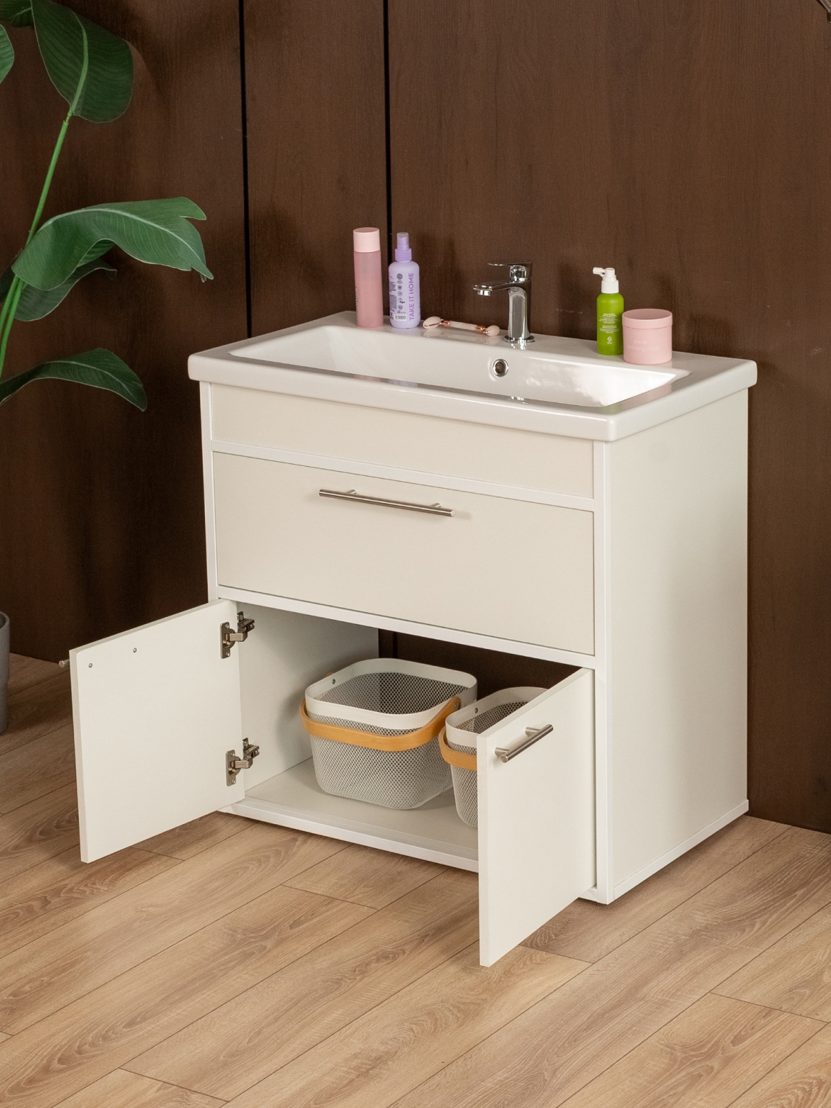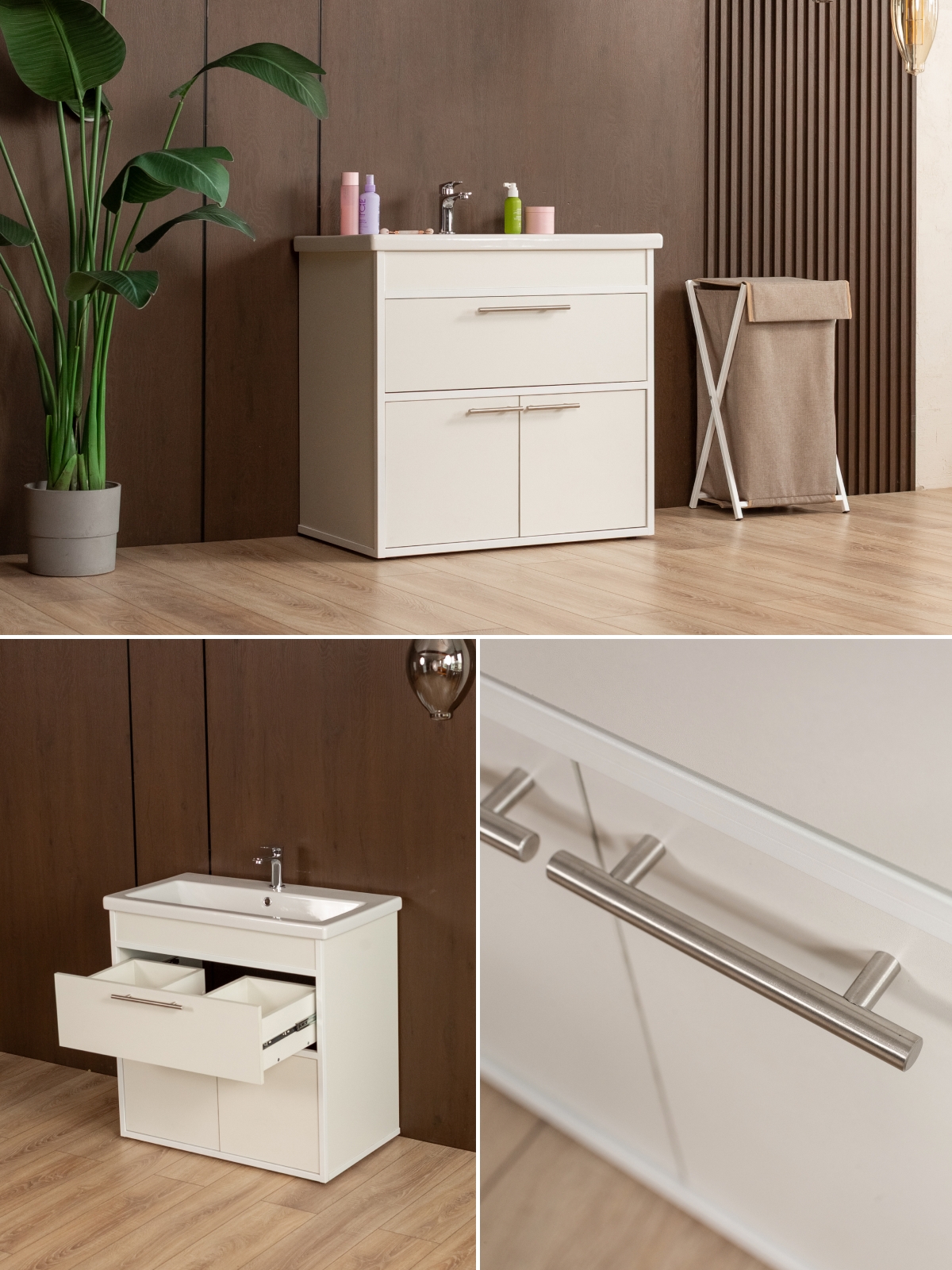 Тумбочка подходит для установки под накладную раковину или умывальник, обеспечивая удобство использования и дополнительное место для хранения. Безупречный выбор для светлых квартир и офисов, где важна гармония, простота и аккуратность. Металлический каркас обеспечивает прочность и долговечность изделия. Такая напольная конструкция будет уместна как в просторных ванных комнатах, так и в небольших санузлах.