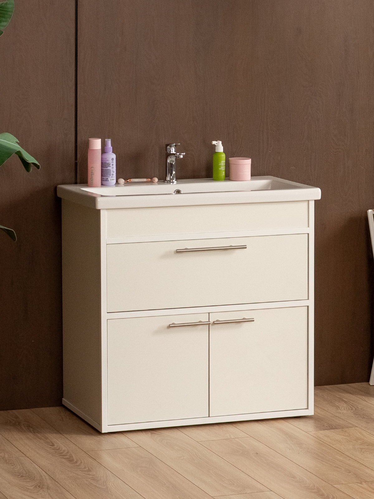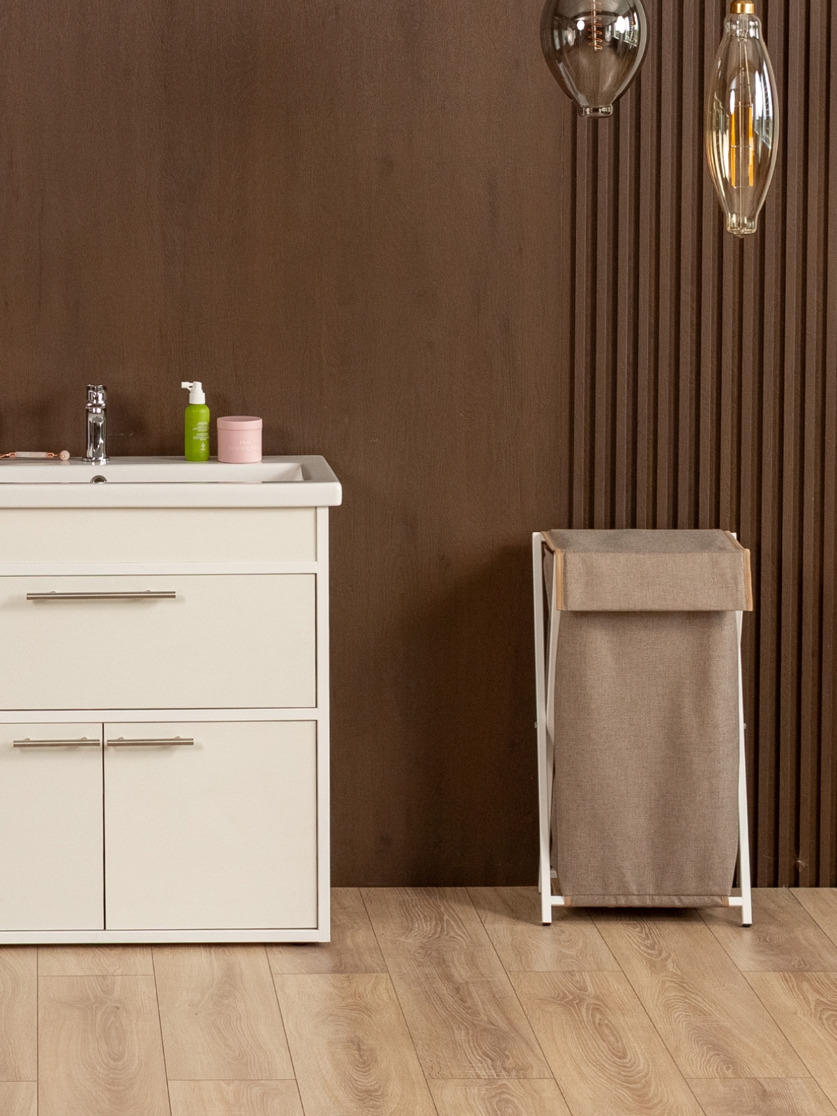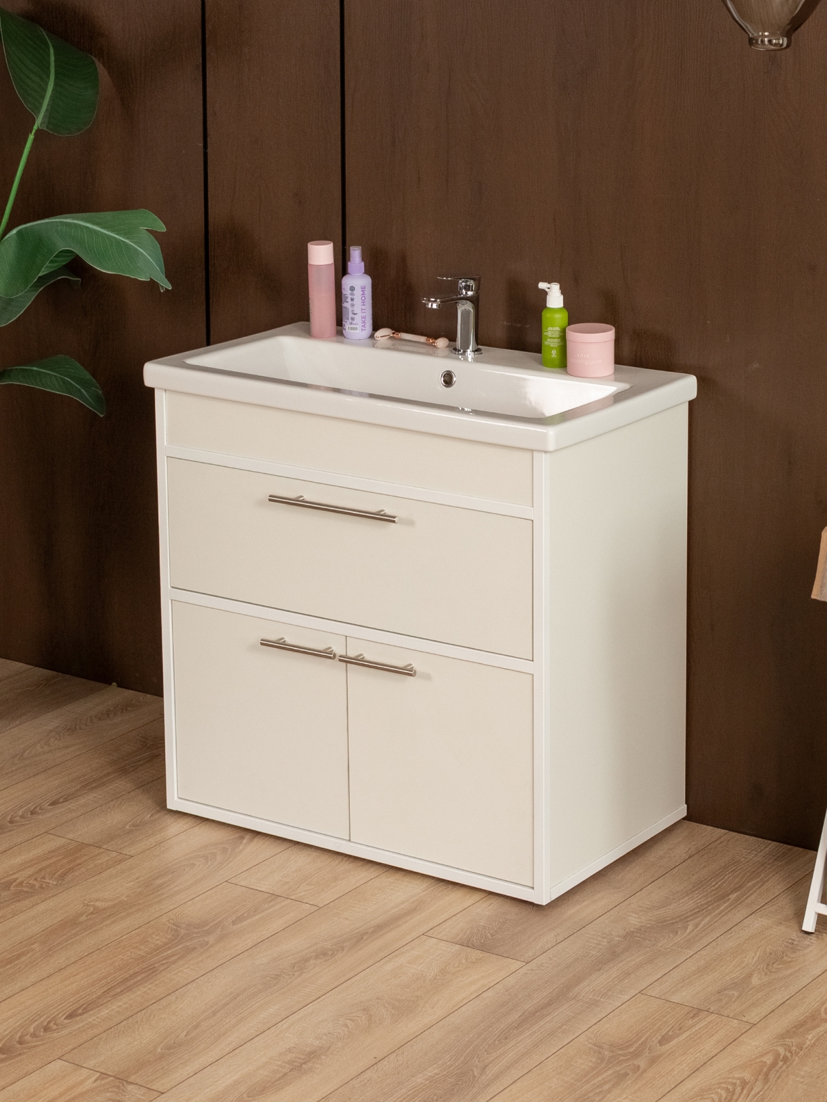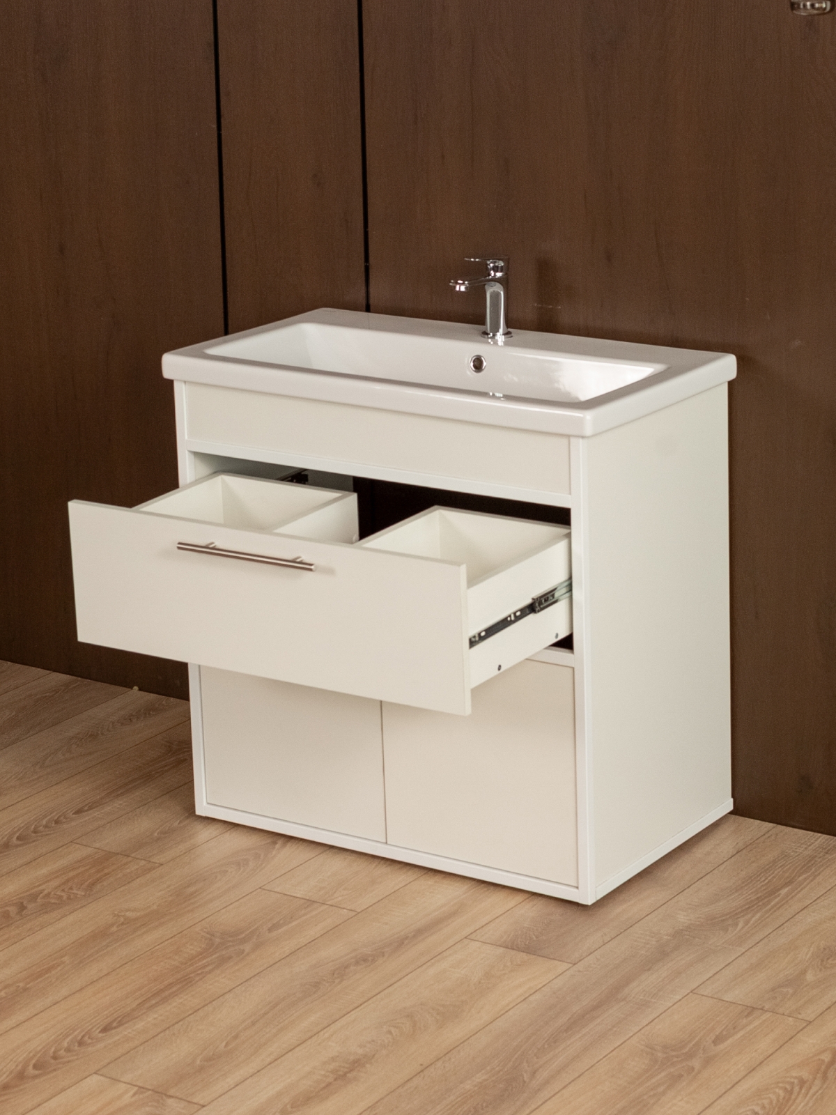 Тумбочка подходит для установки под накладную раковину или умывальник, обеспечивая удобство использования и дополнительное место для хранения. Безупречный выбор для светлых квартир и офисов, где важна гармония, простота и аккуратность. Металлический каркас обеспечивает прочность и долговечность изделия. Такая напольная конструкция будет уместна как в просторных ванных комнатах, так и в небольших санузлах.