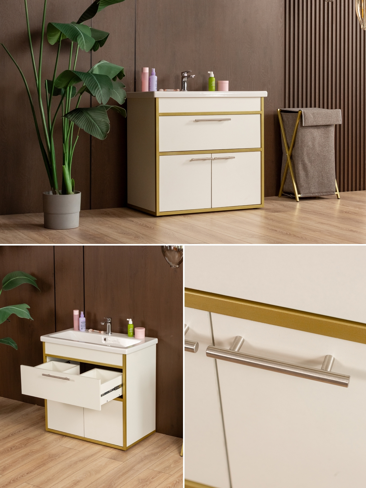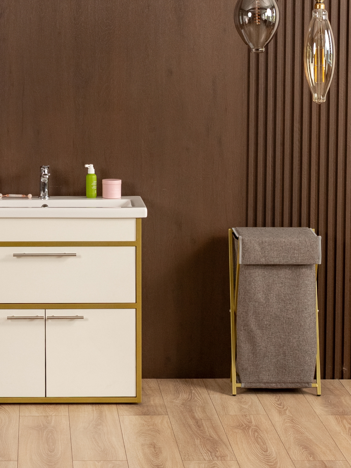 Напольная тумба «Шимри» — стильное и современное решение для ванной и других комнат, где требуется сочетание функциональности и эстетики. Напольная тумба идеально подходит для создания уютной и роскошной атмосферы в интерьере с акцентом на glam-лофт, добавляя интерьеру блеск, элегантность и индивидуальность. Благодаря золотому металлическому каркасу изделие сразу привлекает внимание, подчеркивает изысканность вкуса владельца и создает ощущение роскоши.