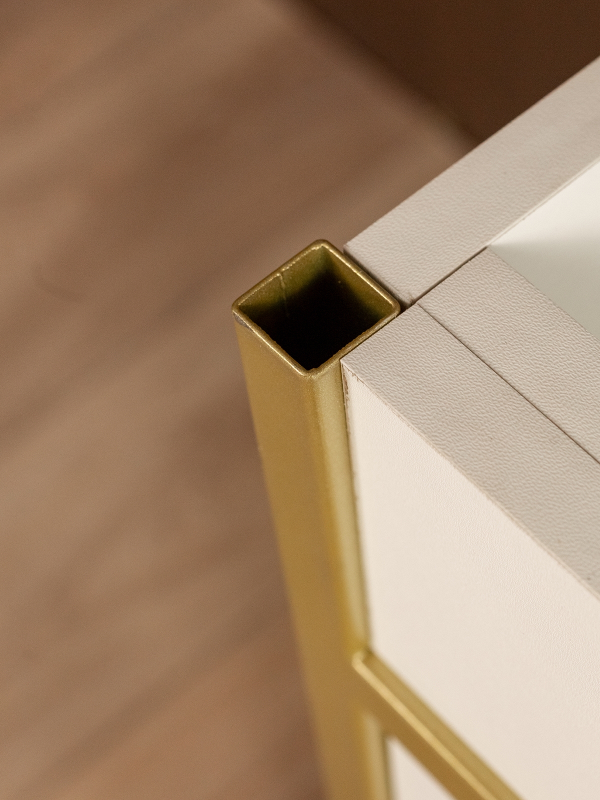 Золотой акцент на каркасе напольной тумбочки — настоящая находка для тех, кто стремится создать роскошный и стильный интерьер. Он добавляет пространству тепло и шик. Такая тумбочка станет не только функциональным, но и эстетически привлекательным элементом интерьера.