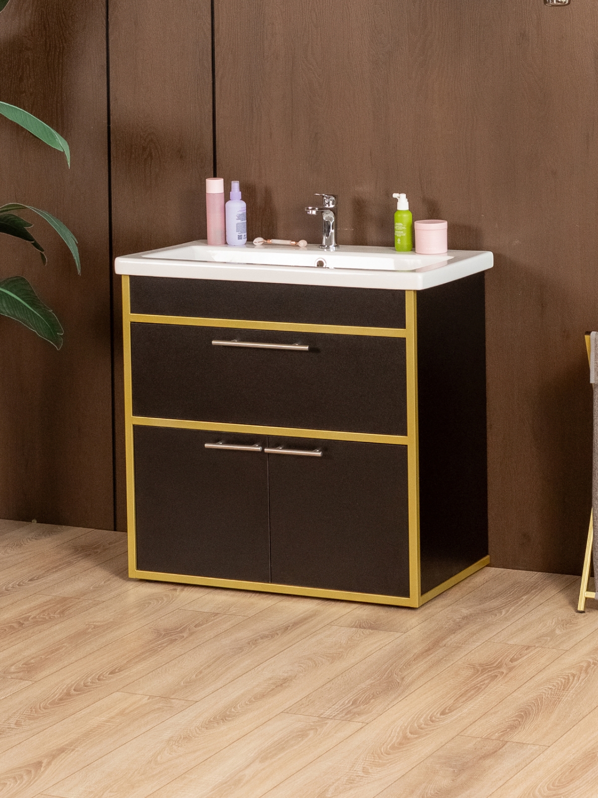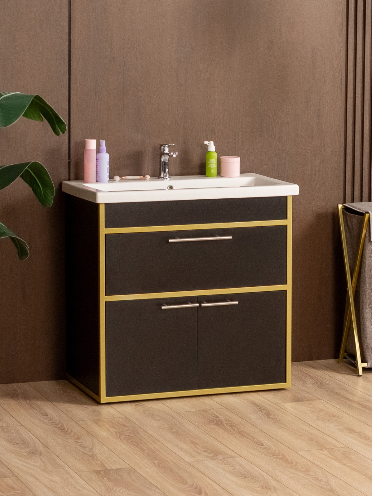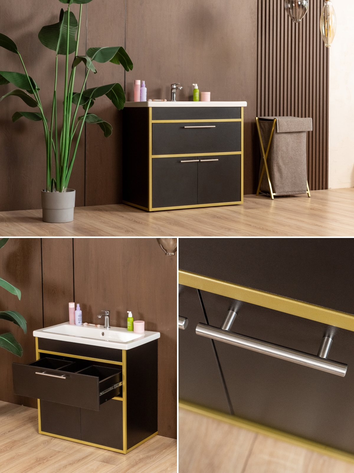 Напольная тумба «Шимри» — стильное и современное решение для ванной и других комнат, где требуется сочетание функциональности и эстетики. Напольная тумба идеально подходит для создания уютной и роскошной атмосферы в интерьере с акцентом на glam-лофт, добавляя интерьеру блеск, элегантность и индивидуальность. Благодаря золотому металлическому каркасу изделие сразу привлекает внимание, подчеркивает изысканность вкуса владельца и создает ощущение роскоши.