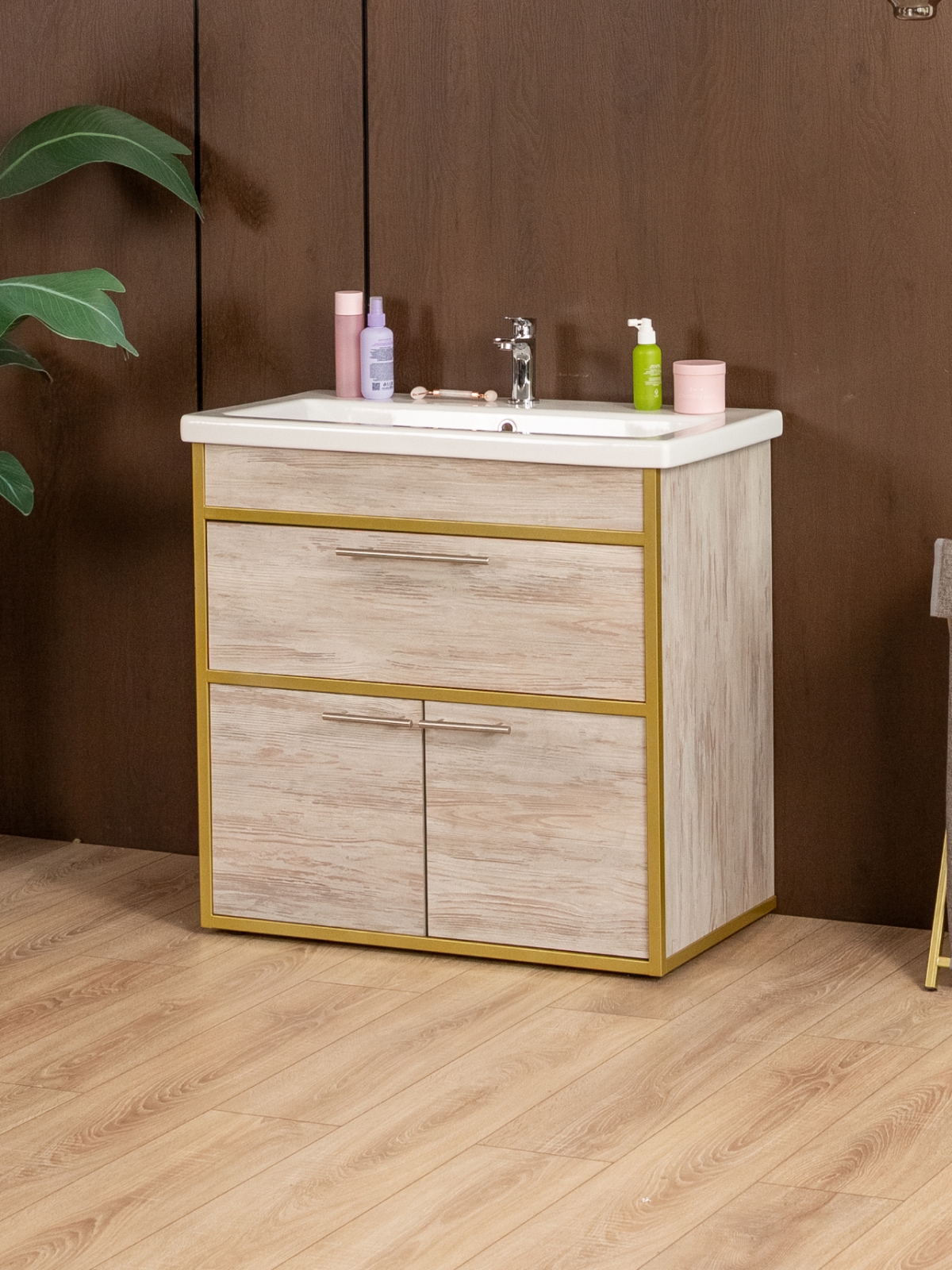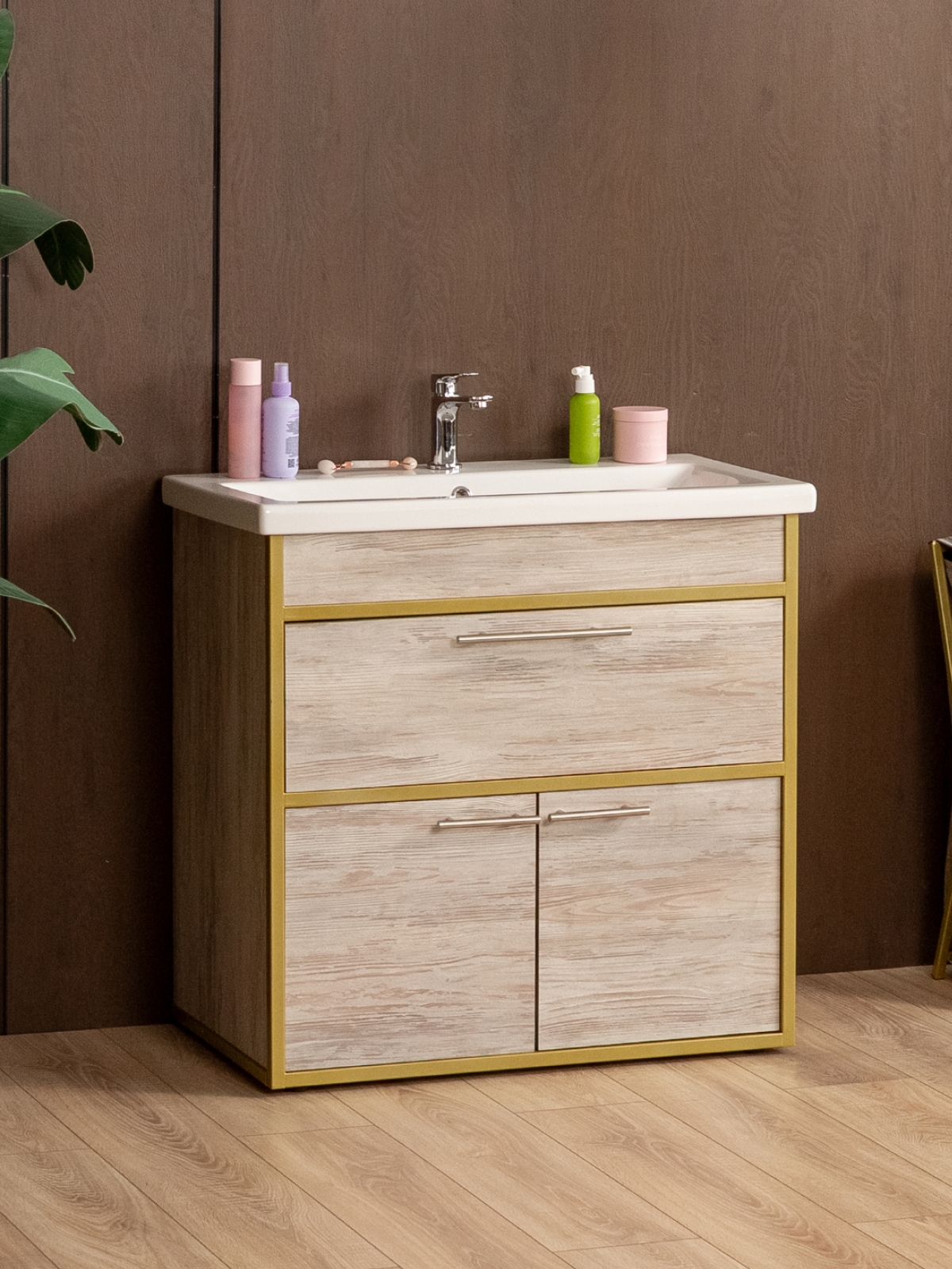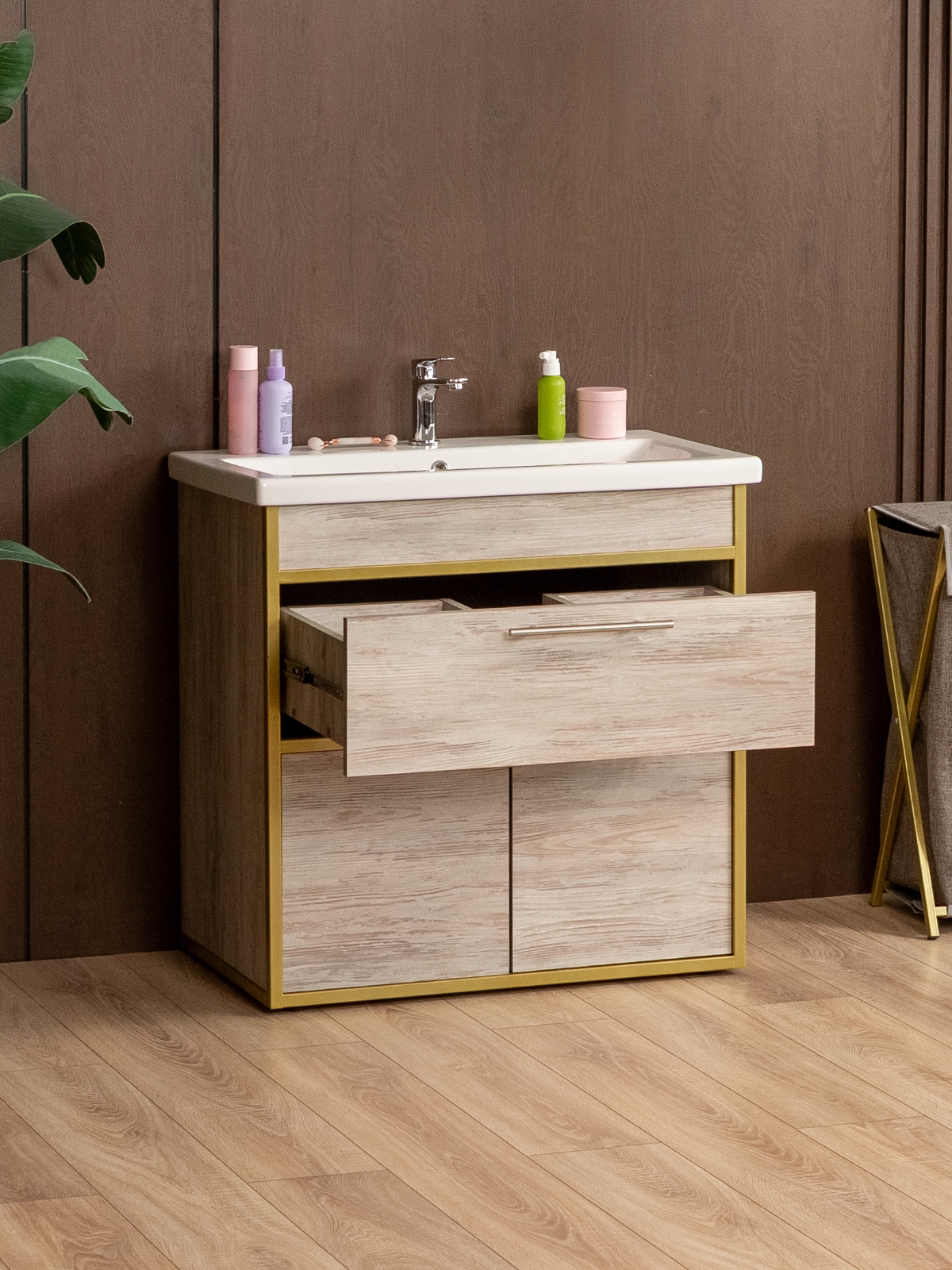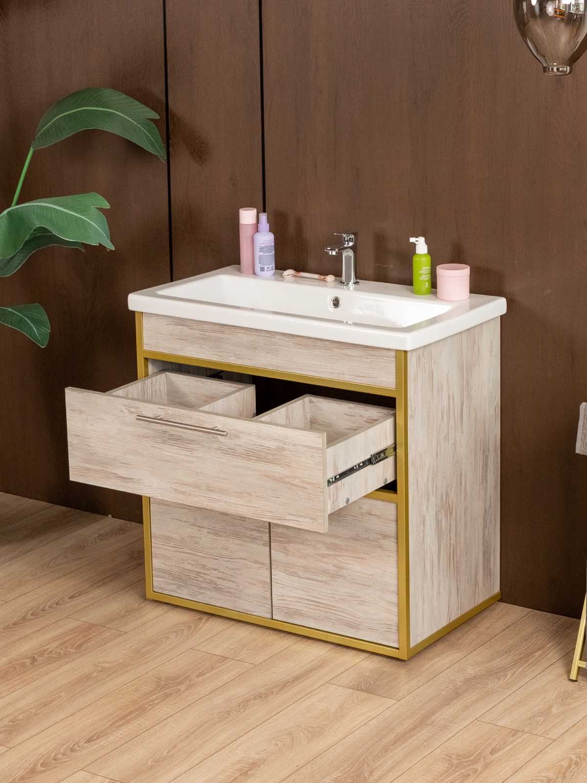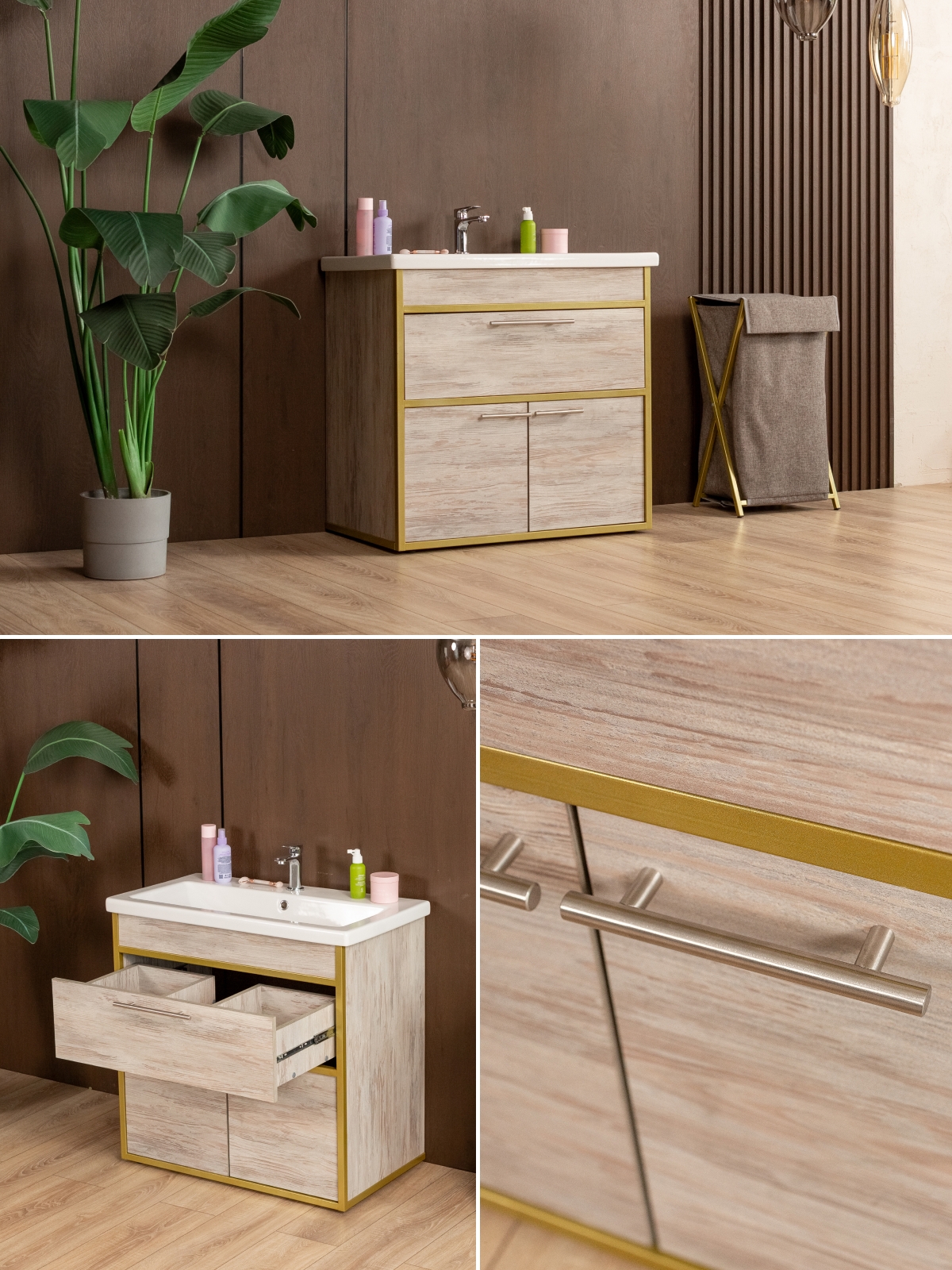 Напольная тумба «Шимри» — стильное и современное решение для ванной и других комнат, где требуется сочетание функциональности и эстетики. Напольная тумба идеально подходит для создания уютной и роскошной атмосферы в интерьере с акцентом на glam-лофт, добавляя интерьеру блеск, элегантность и индивидуальность. Благодаря золотому металлическому каркасу изделие сразу привлекает внимание, подчеркивает изысканность вкуса владельца и создает ощущение роскоши.