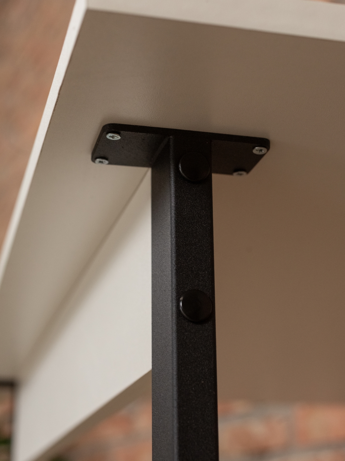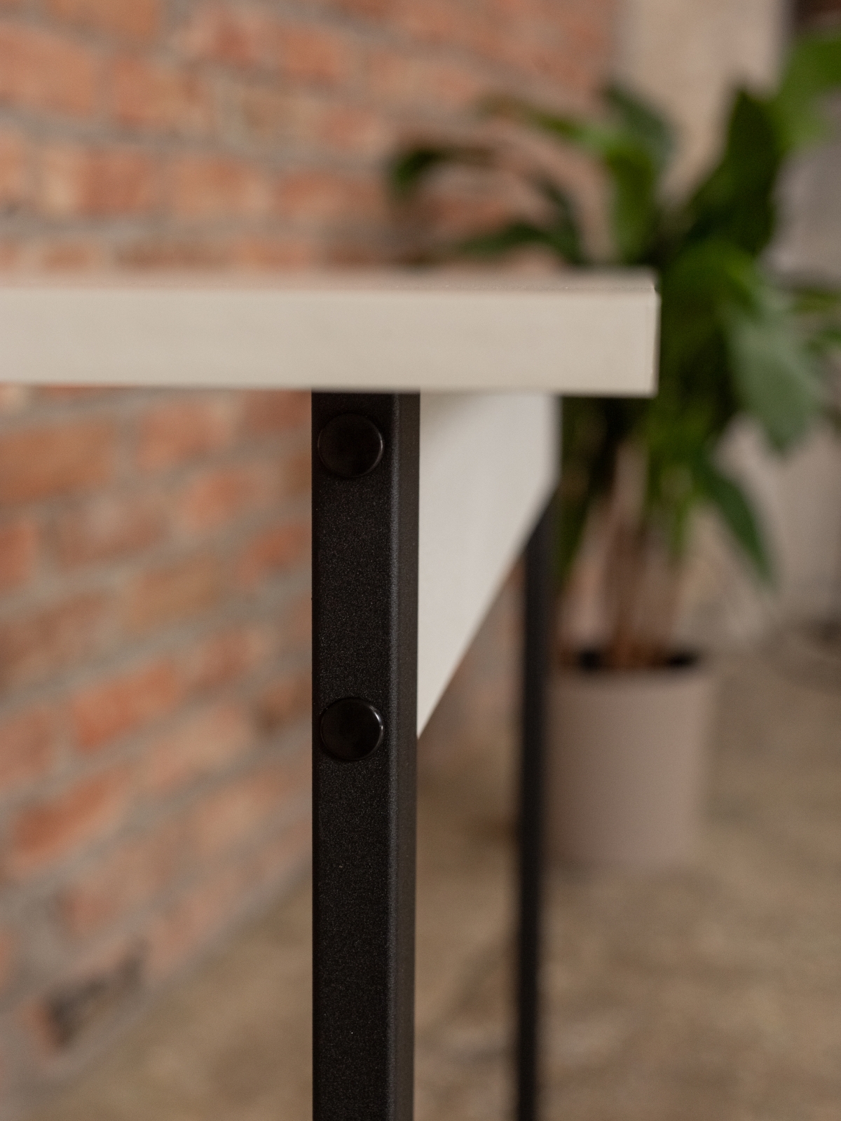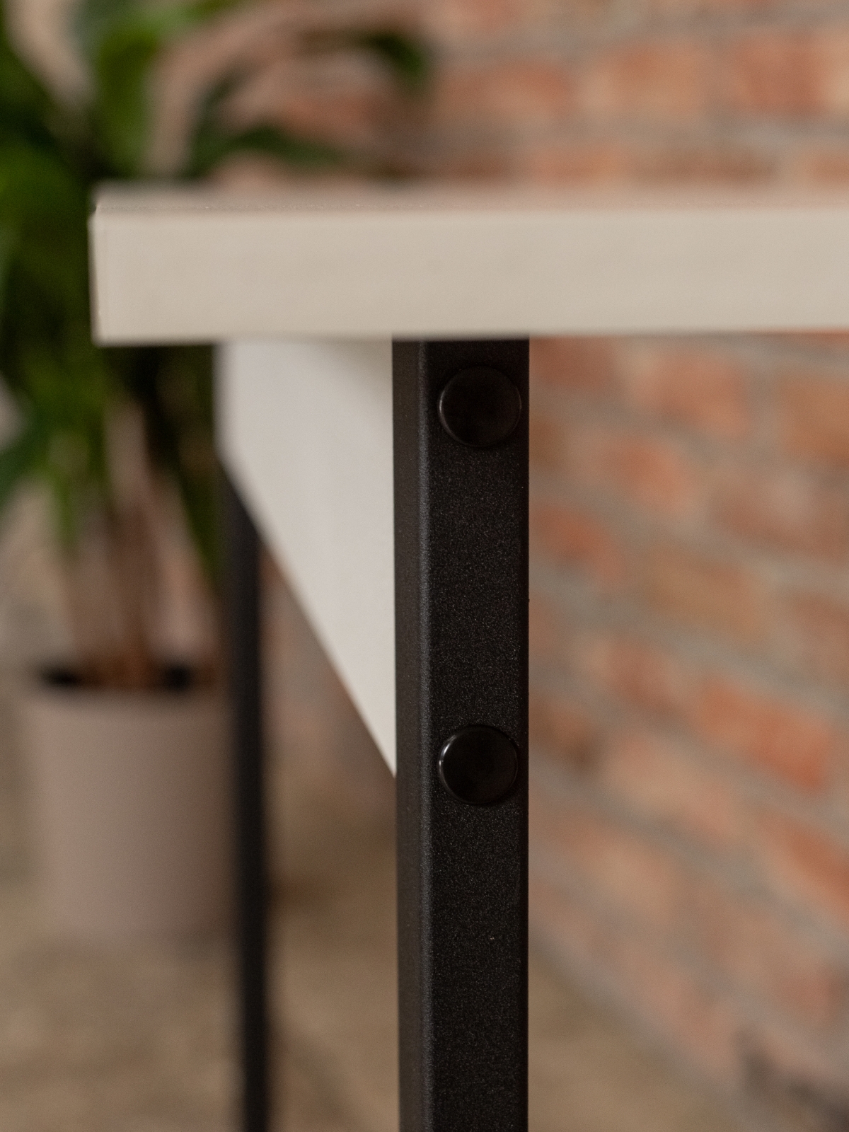 Столешница выполнена из прочной ЛДСП с надежной кромкой ПВХ, что обеспечивает долговечность и легкость в уходе. Черные ножки стола отлично смотрится в интерьерах с акцентом на контрасты, добавляя ощущение свежести и простора. Четкая геометрия без перекосов гарантирует надежность при эксплуатации. Пластиковые заглушки на ножках защищают напольное покрытие от царапин, что особенно актуально для ламината, паркета и других деликатных поверхностей.