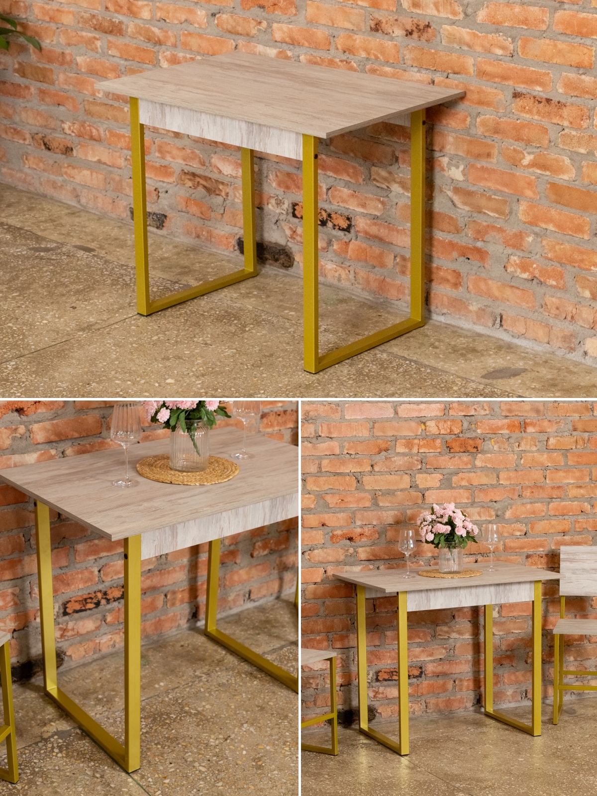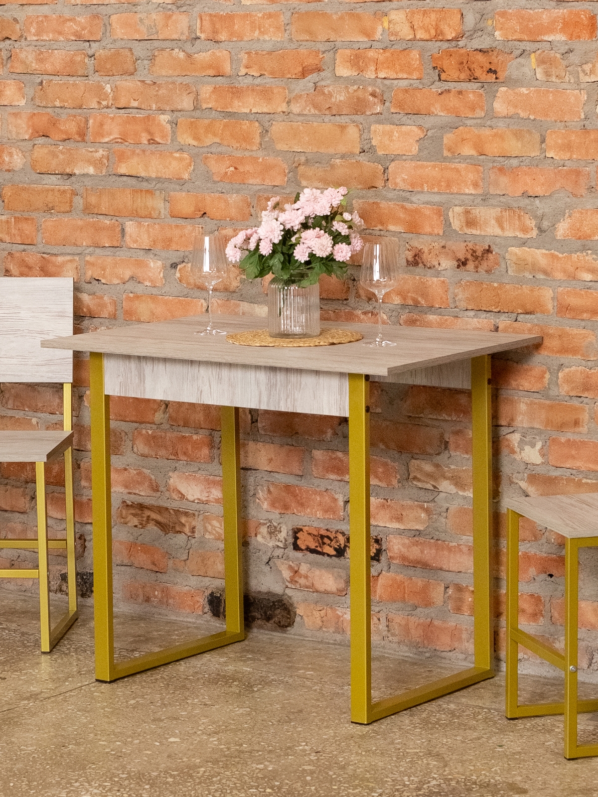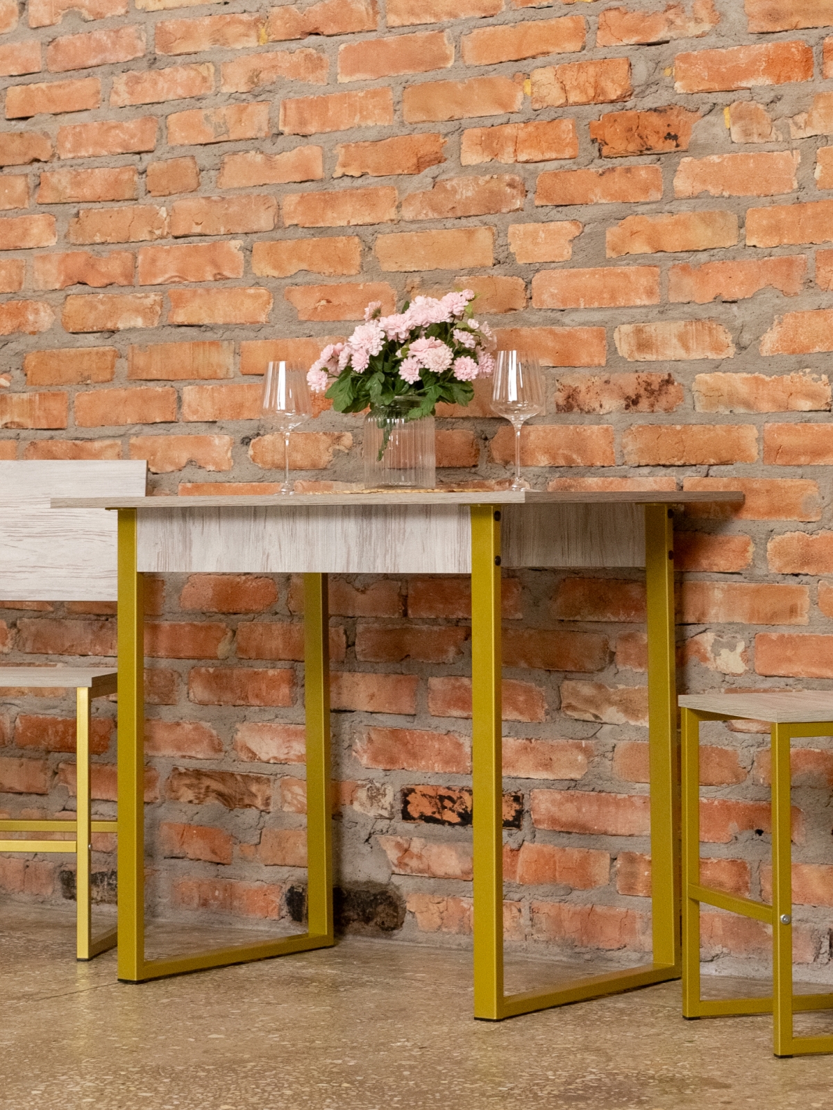 Если вы цените компактный, функциональный и эргономичный подход к оформлению пространства, то стол на металлических ножках станет отличным выбором. Матовые металлические детали в золотом цвете добавляют интерьеру изысканность и блеск, а лаконичный дизайн позволяет столу гармонировать практически с любыми элементами декорами.